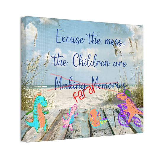 Canvas Art - Fun Humorous Parenting Beach Scene Stretched Canvas 0.75" - "Excuse the Mess, the Children Are Making Memories" with Dinosaurs