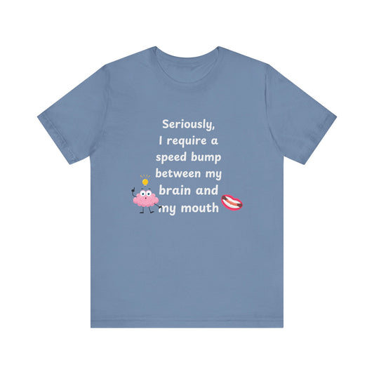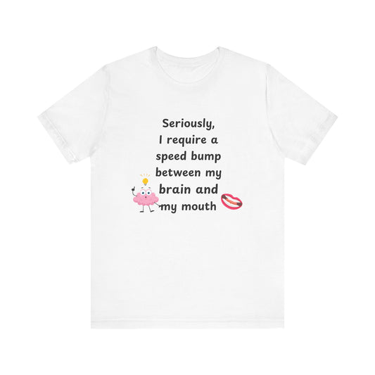 T-Shirt - Sarcastic Funny – "I Require a Speed Bump Between My Brain and My Mouth" (1a)