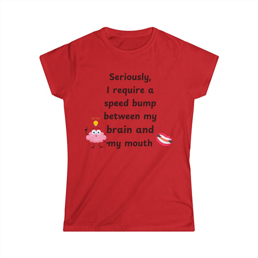 Female T-Shirt - Sarcastic Funny – "I Require a Speed Bump Between My Brain and My Mouth" (1a)