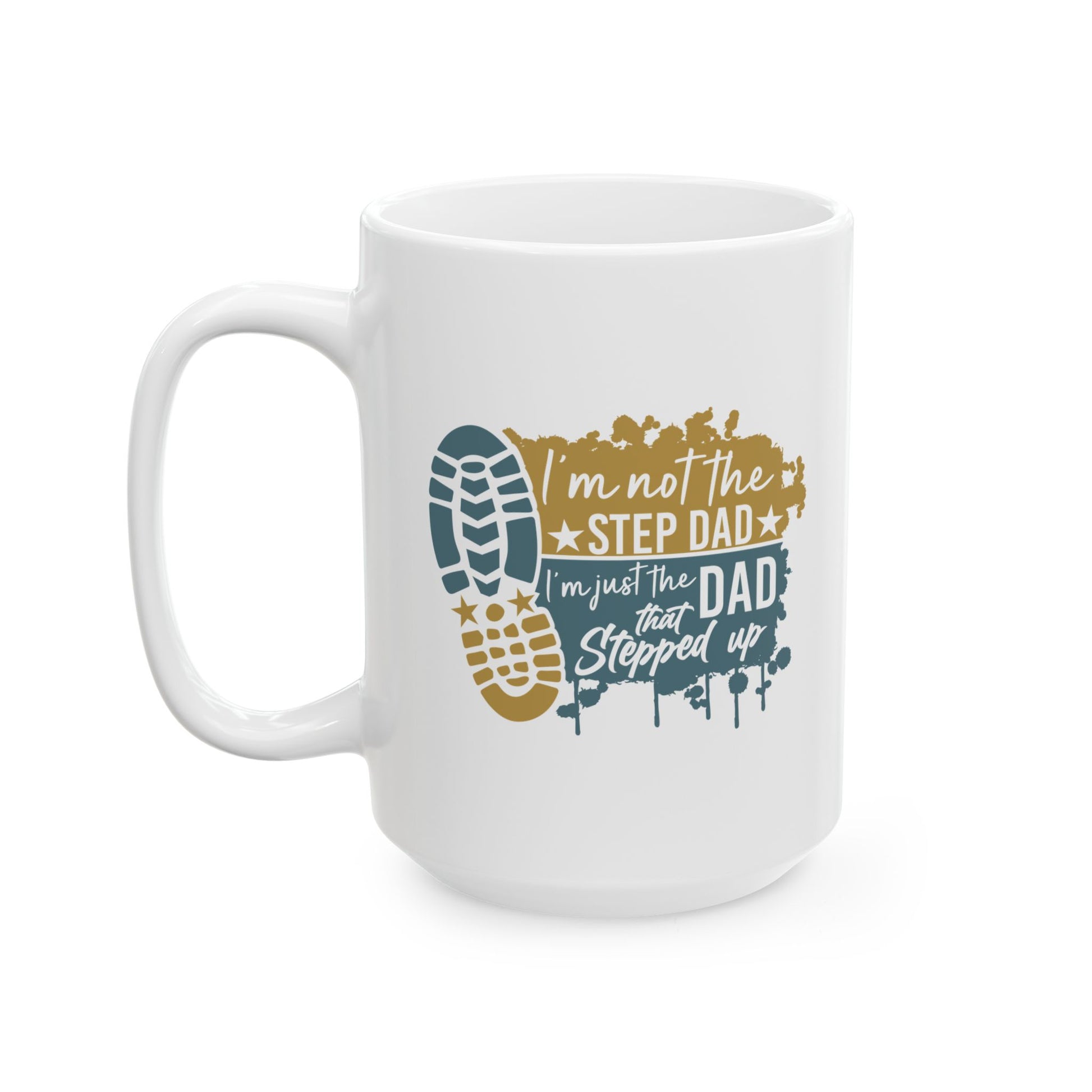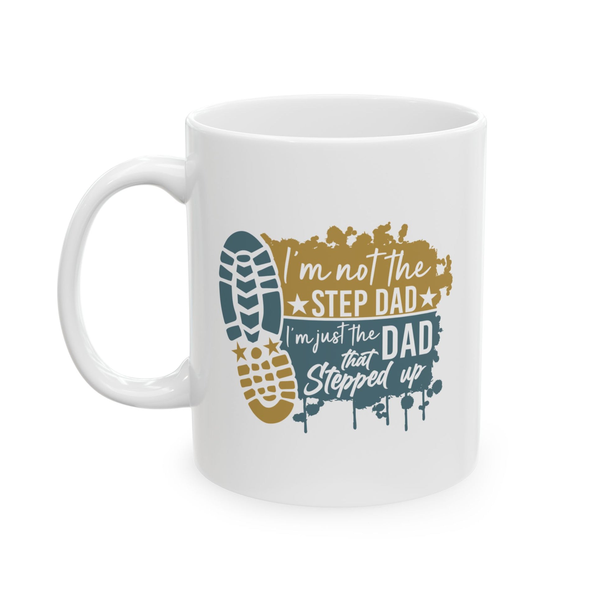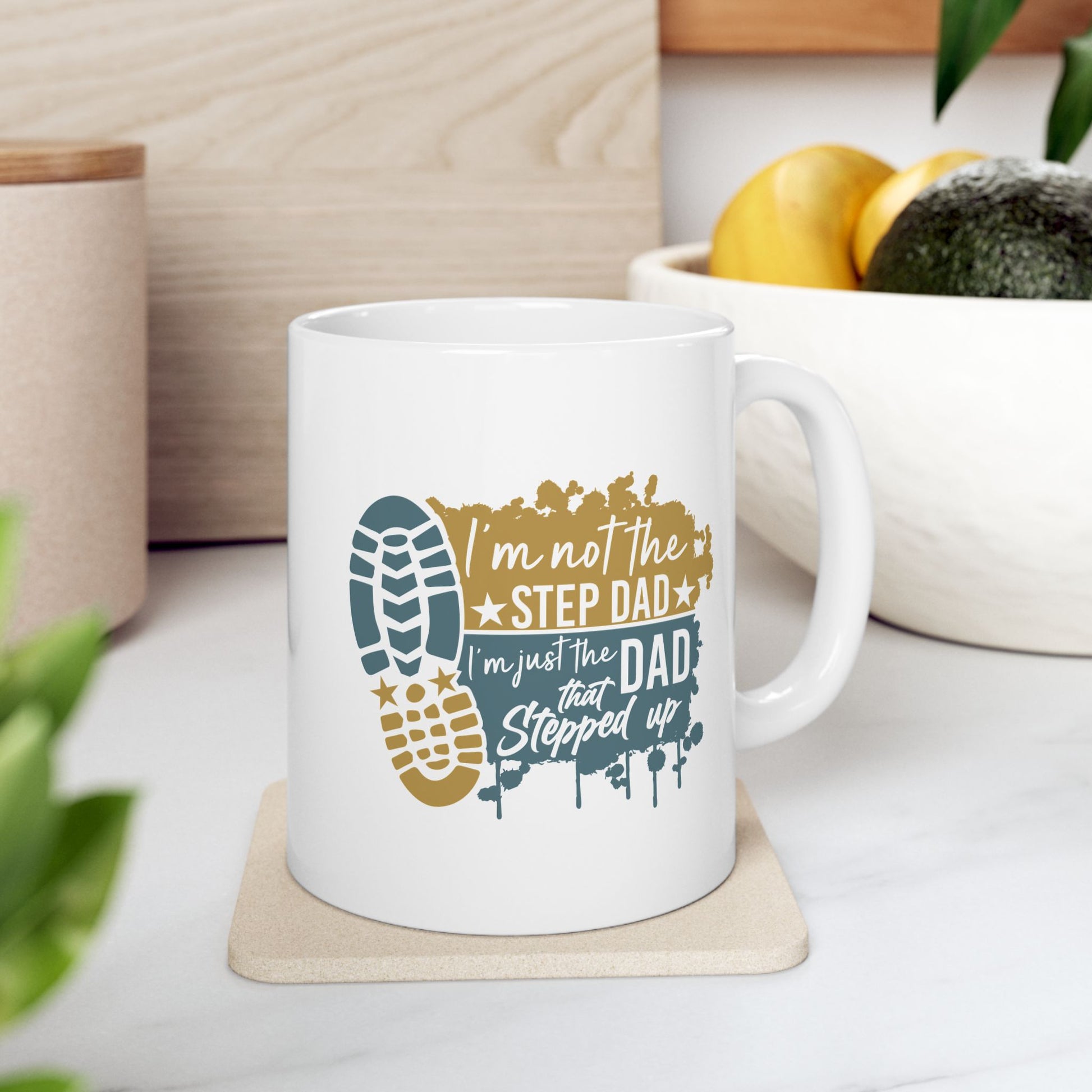 This ceramic mug featuring 'I am not the step-dad, I am just the dad that stepped up' in a blue and yellow shade. This mug is a great gift idea for the man who stepped up to be a father figure. It's perfect for carrying around coffee, tea, or any beverage, at home or the office that can allow him show how proud of the dad he is, or how proud you are. Perfect for Father's Day, birthdays, or just to show appreciation for dad. Suitable for adults.