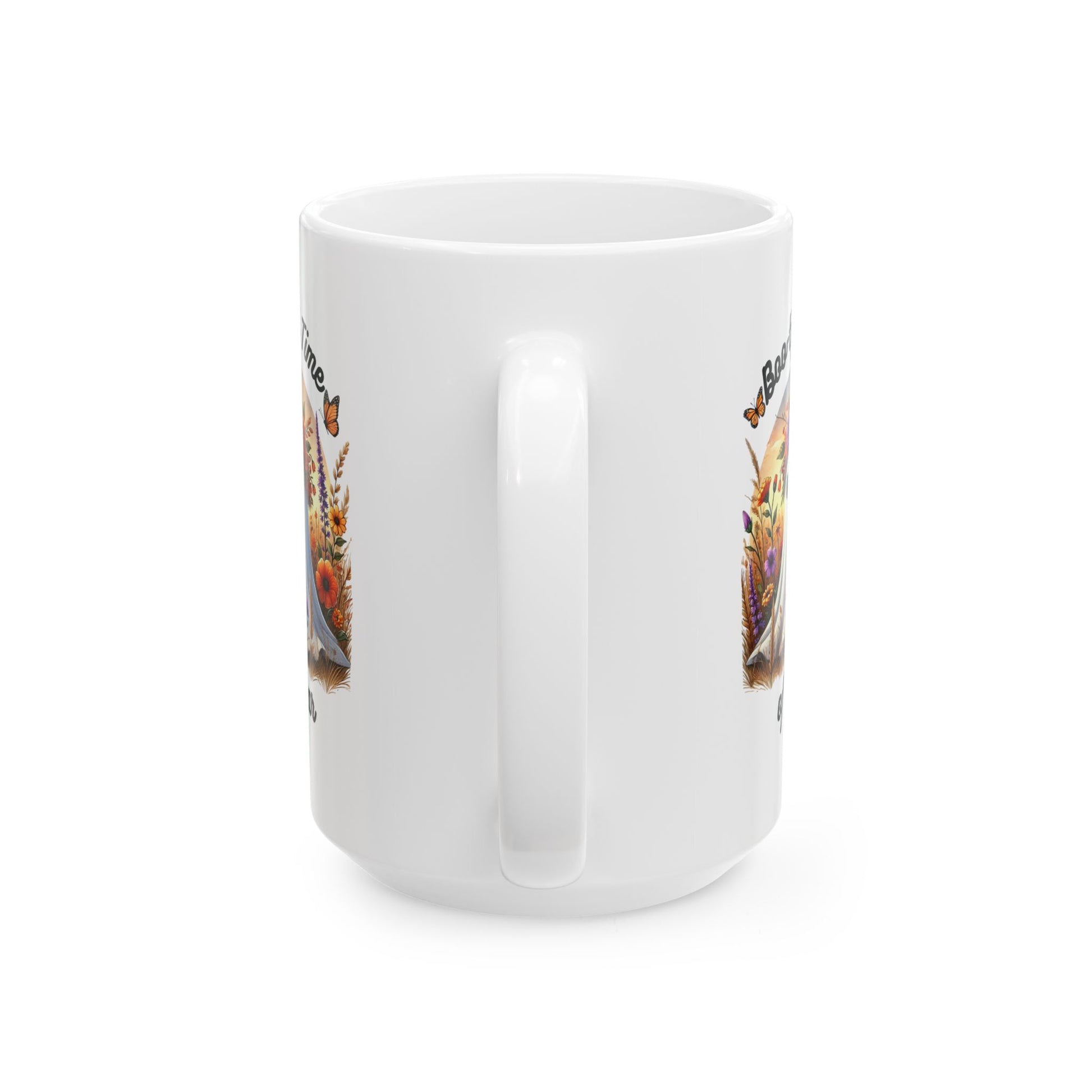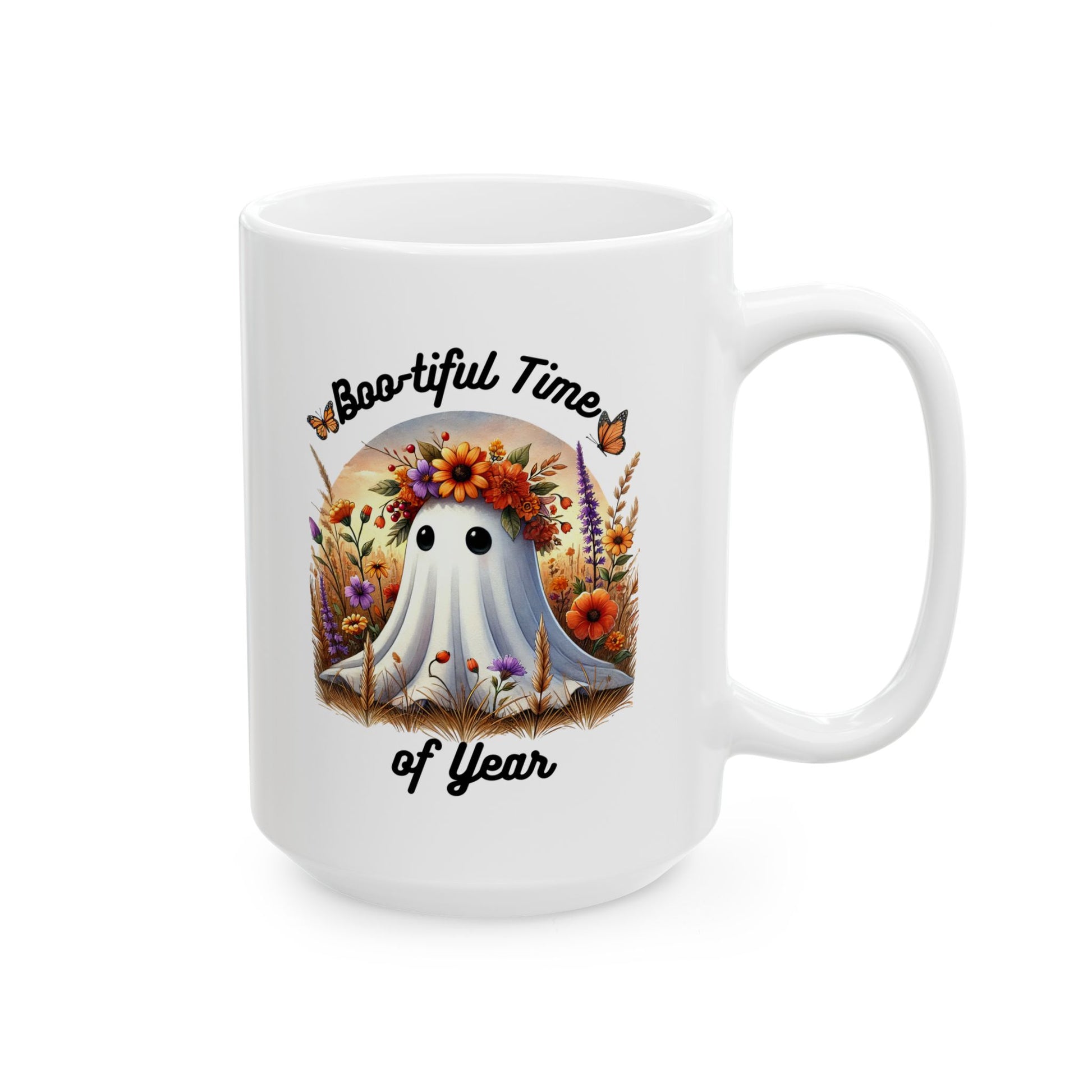 A custom mug has a very simple Halloween themed pattern with the quote "Boo-itful Time of Year" featuring a friendly ghost standing in a harvest field and a few butterflies. It's a fantastic addition to your flag collection, especially for Halloween enthusiasts who love the innocents of Halloween.