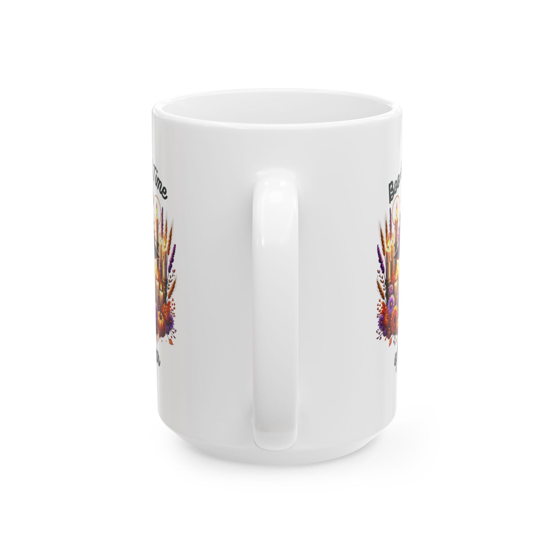 A custom mug has a very simple Halloween themed pattern with the quote "Boo-itful Time of Year" featuring a friendly ghost with harvest items and lit candles. It's a fantastic addition to your flag collection, especially for Halloween enthusiasts who love the innocents of Halloween.