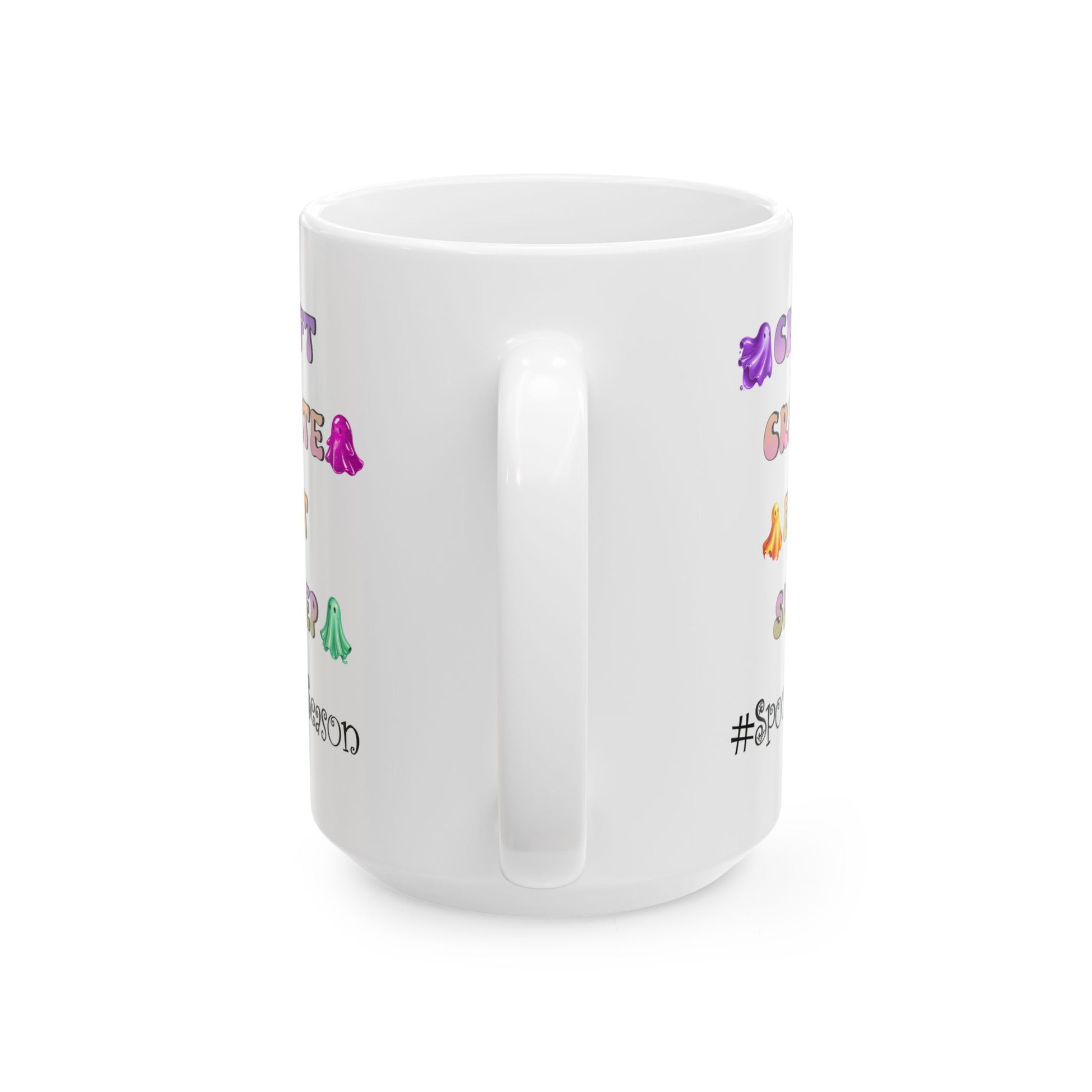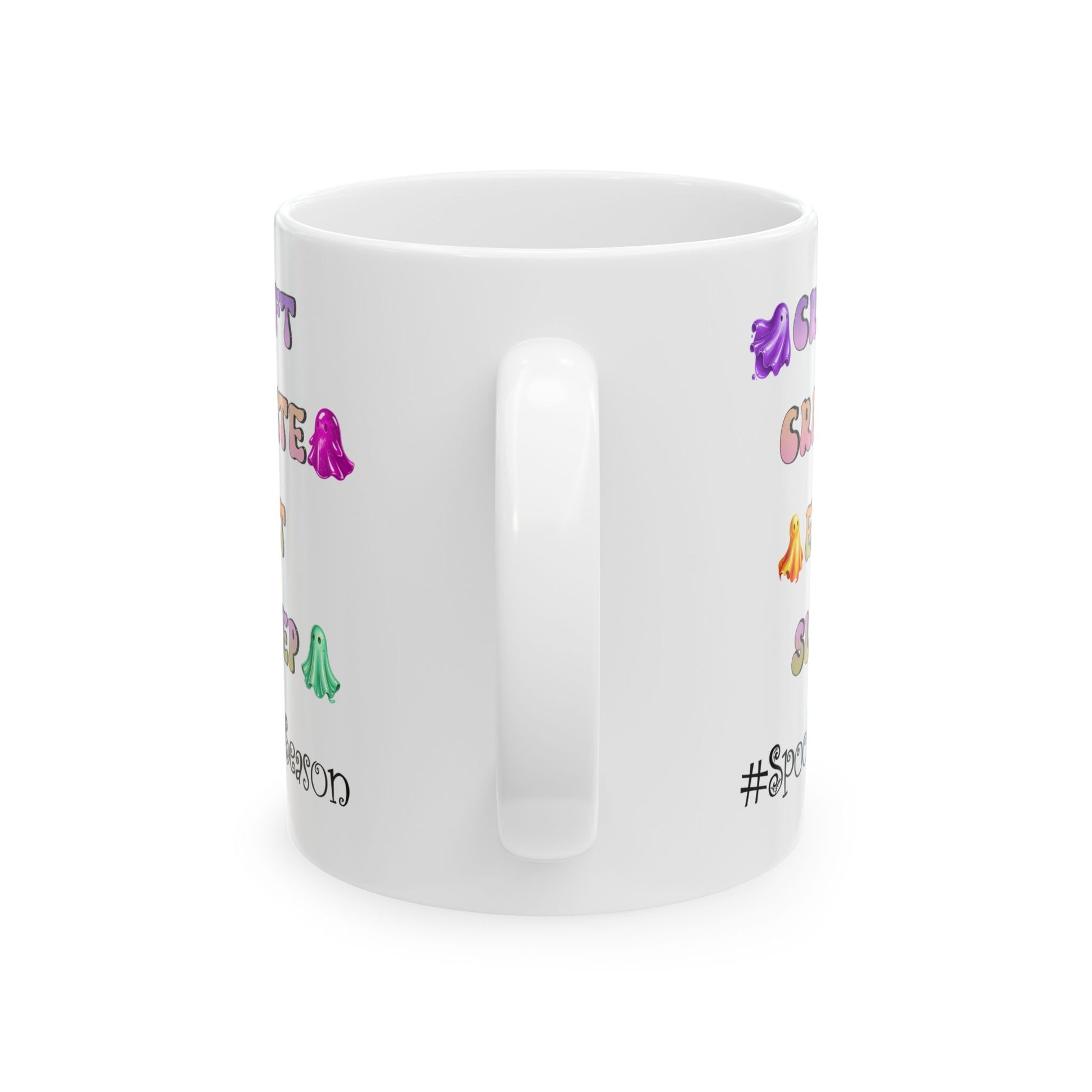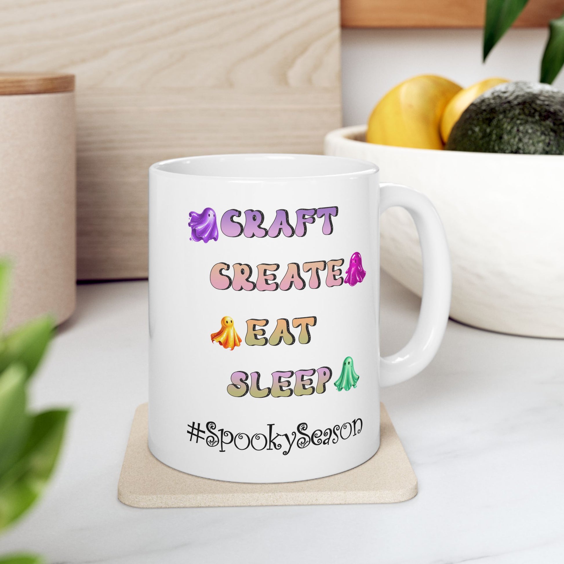 A custom mug has a very simple Halloween themed pattern with the quote " Craft Create Eat Sleep #spookyseason" is a must have for the Halloween DIYer. With colorful ghosts hosting the quotes. It has a fun and playful vibe with its vibrant graphics and it is great to add to your Halloween mug collection.