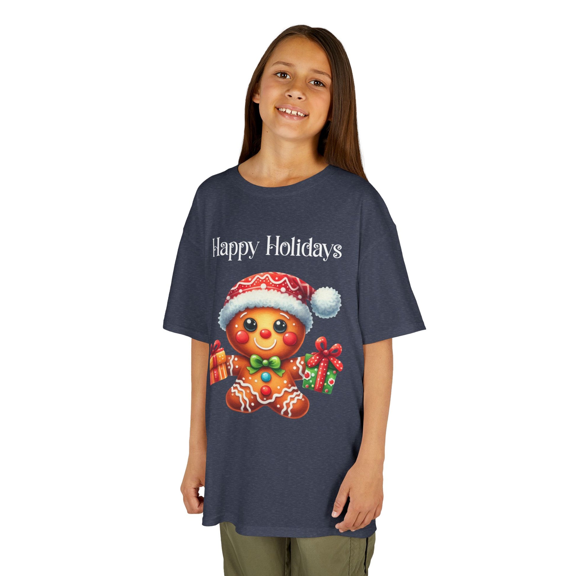 A fun and playful kids tee perfect for Christmas, featuring a gingerbread person holding presents and the quote 'Happy Holidays'. Ideal for youths looking to embrace the Christmas spirit, suitable for school or hanging out with friends. Perfect for Holiday parties and school events. Relevant to parents of young children during the Christmas season.