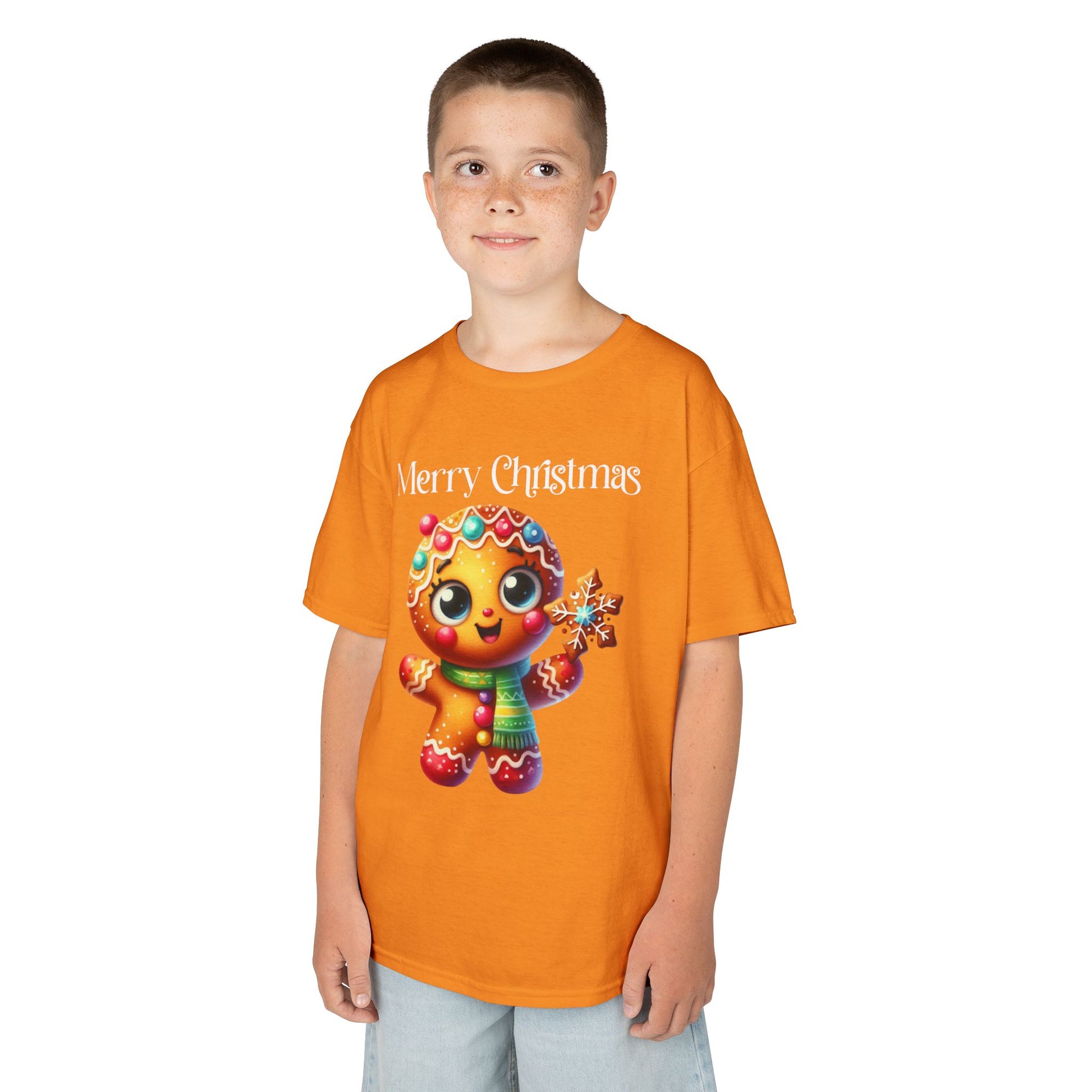 A fun and playful kids tee perfect for Christmas, featuring a gingerbread person holding gingerbread snowflake and the quote 'Merry Christmas'. Ideal for youths looking to embrace the Christmas spirit, suitable for school or hanging out with friends. Perfect for Holiday parties and school events. Relevant to parents of young children during the Christmas season.