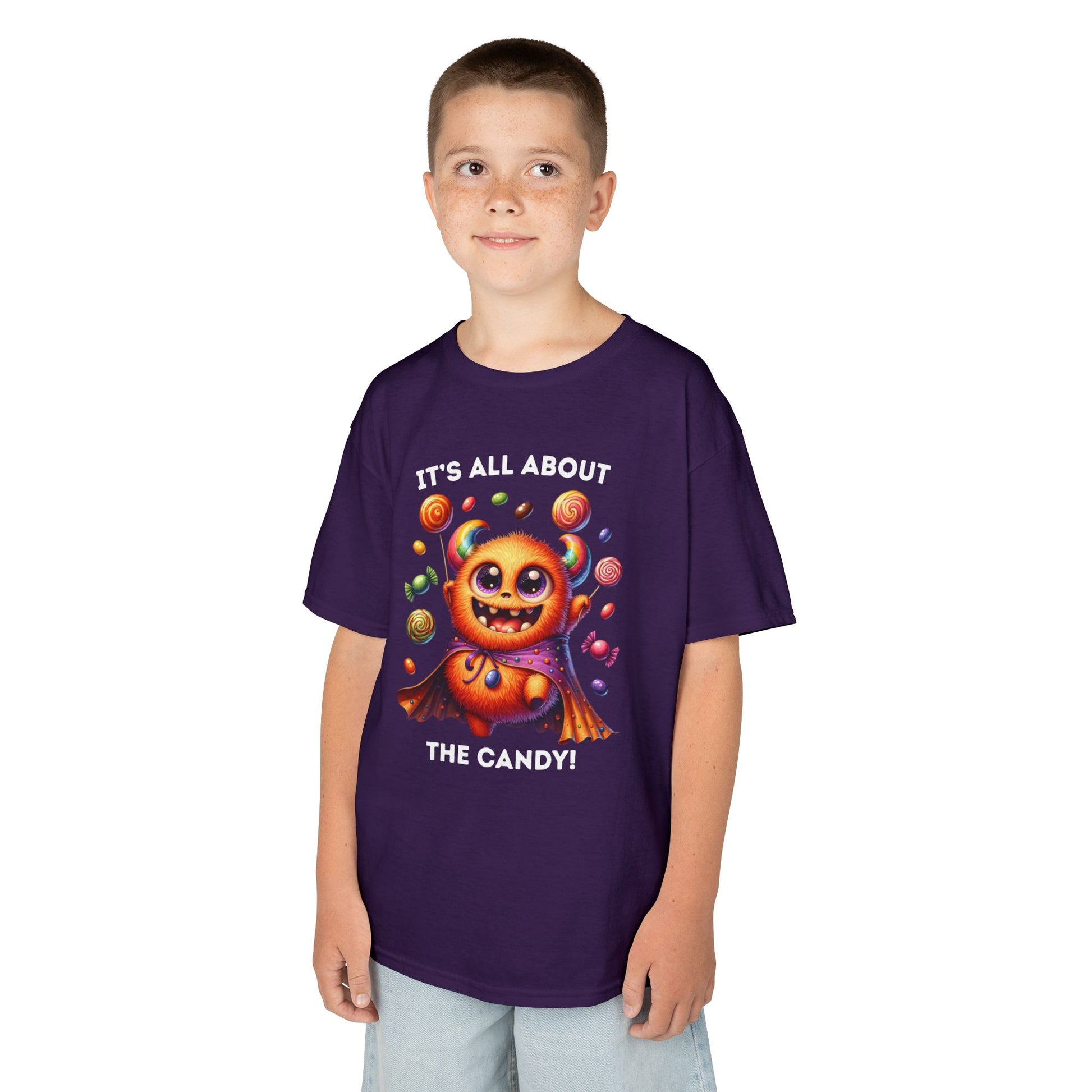 A fun and playful kids tee perfect for Halloween, featuring a monster & floating candy with the quote 'It's all about the candy'. Suitable for school or hanging out with friends, this tee is ideal for youths looking to embrace the Halloween spirit. Perfect for Halloween parties, trick-or-treating, and school events.