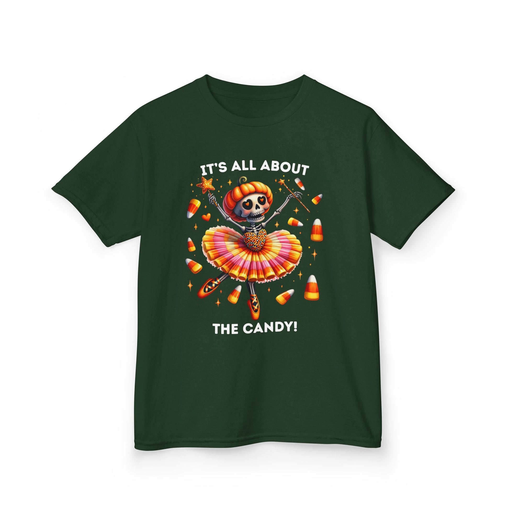 A fun and playful kids tee perfect for Halloween, featuring a dancing ballet skeleton with floating candy with the quote 'It's all about the candy'. Suitable for school or hanging out with friends, this tee is ideal for youths looking to embrace the Halloween spirit. Perfect for Halloween parties, trick-or-treating, and school events.