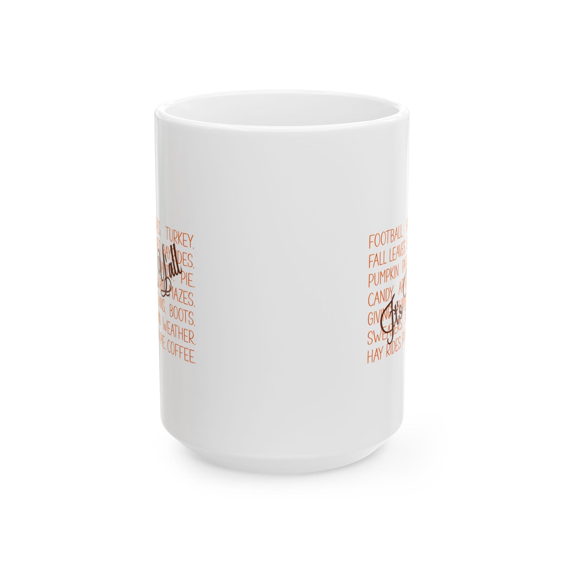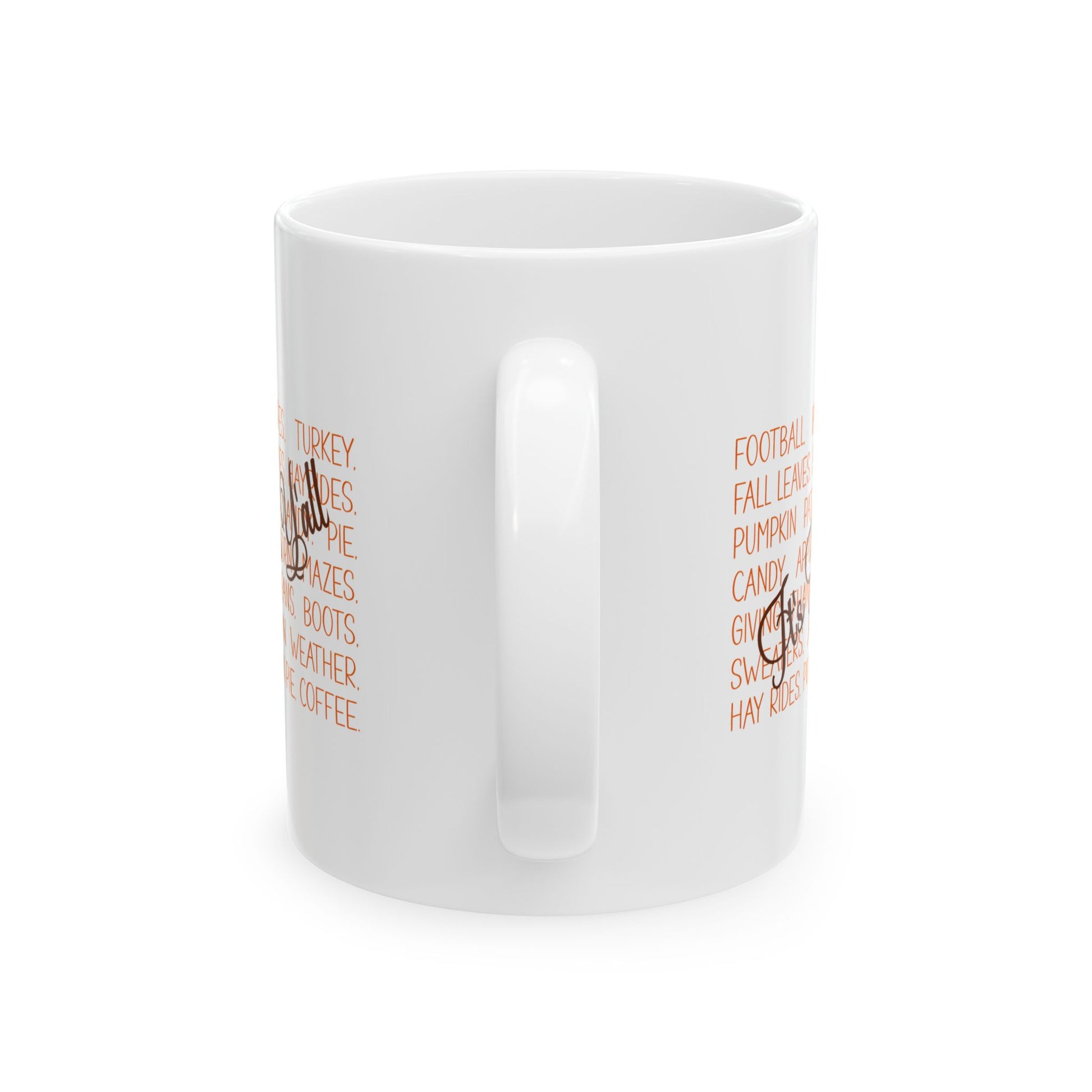 This mug is perfect for people who love the autumn season. It features 'It's Fall Y'all' with background word graphic that lists; football, bonfires, turkey, fall leaves, scarves, hayrides, pumpkin patches, candy, pie, candy apples, corn mazes, giving thanks, jeans, boots, sweaters, autumn weather, hay rides, pumpkin pie, & coffee. A great fun graphic in celebration of southern charm and the fall season. It is a great addition to your coffee mug collection, especially for those who love the autumn season.