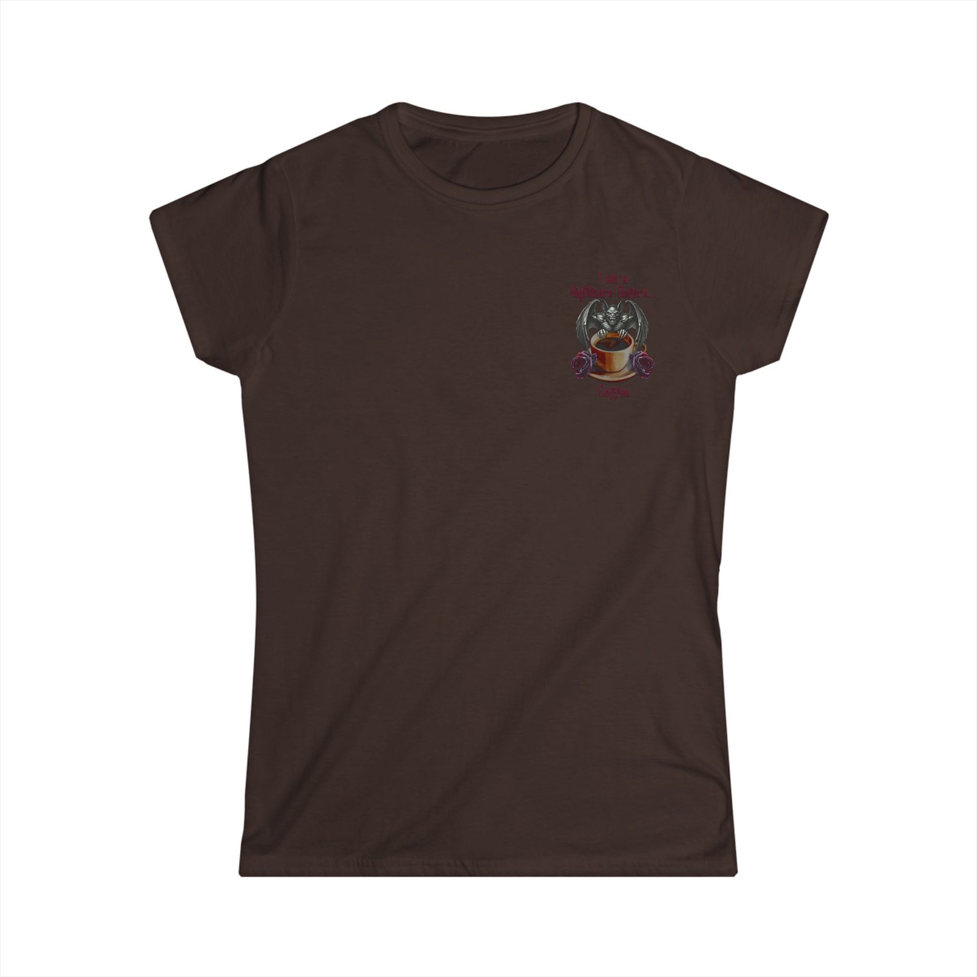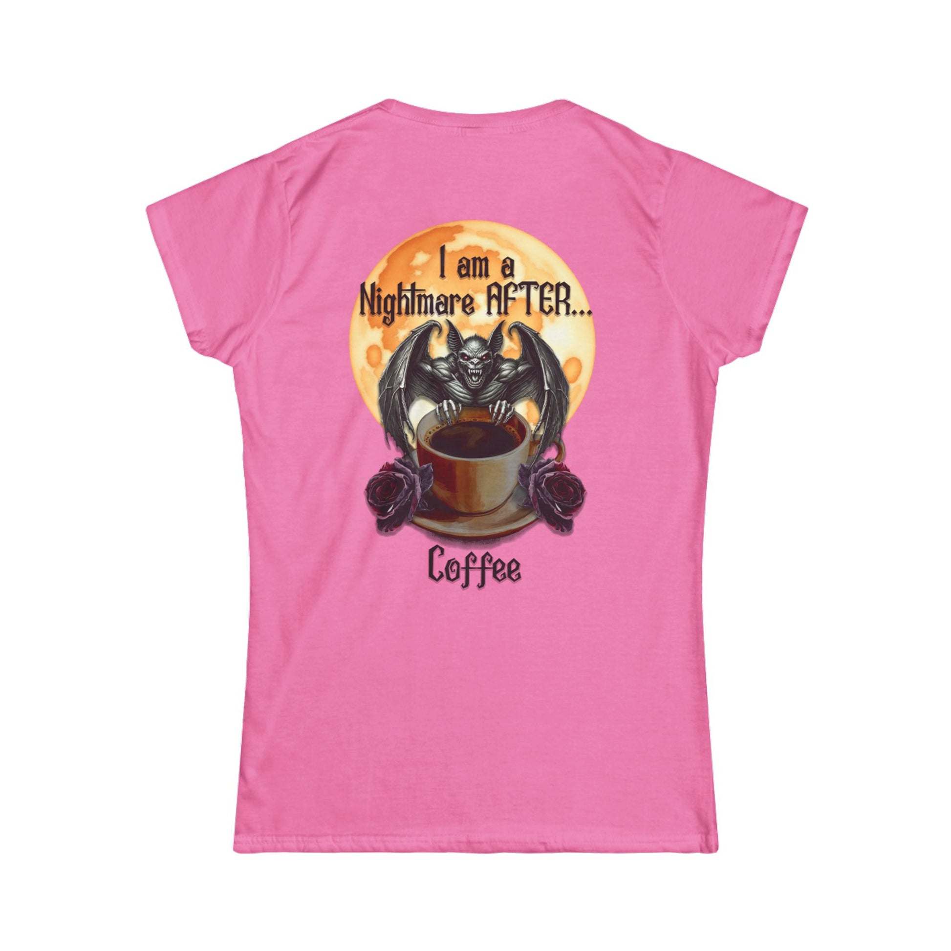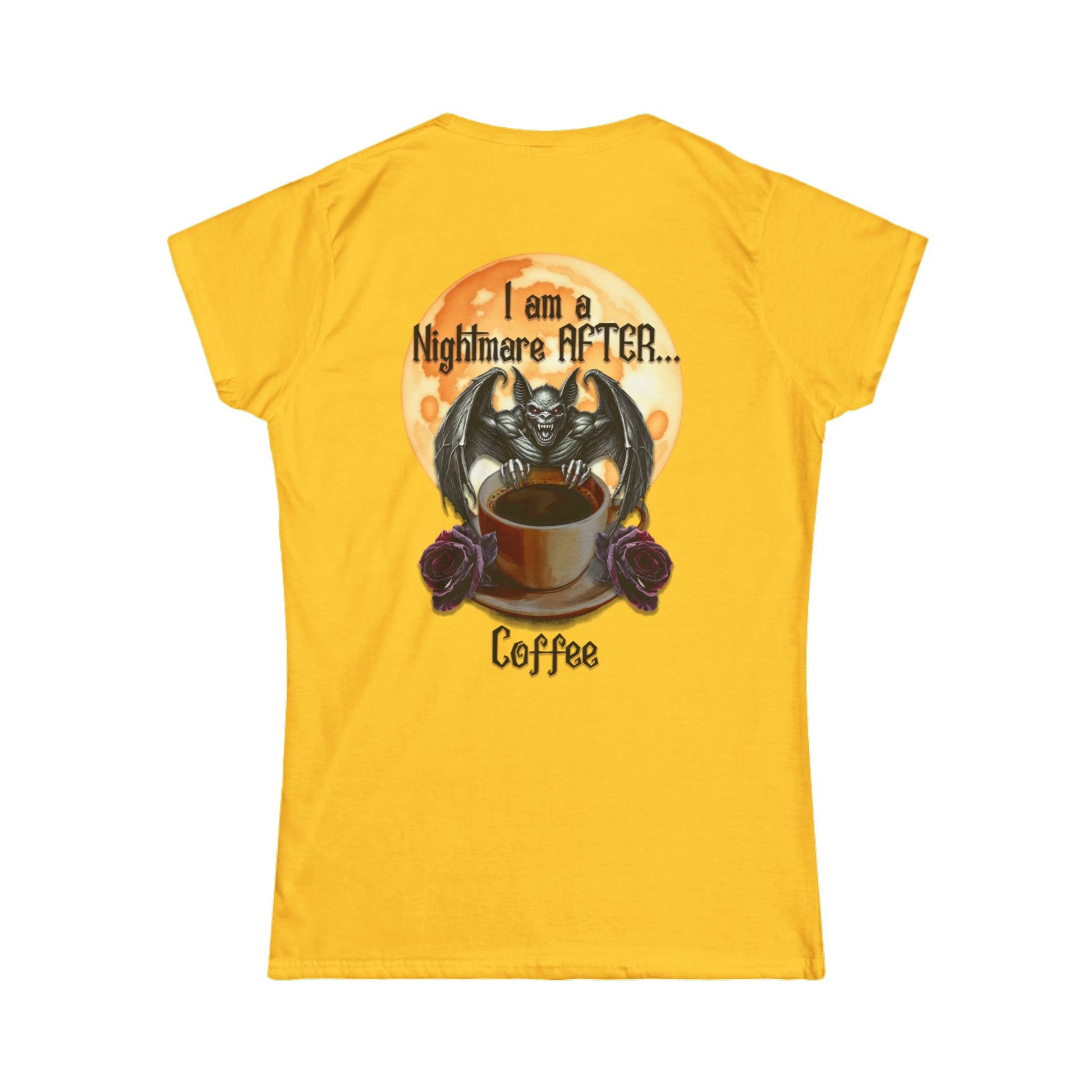 This 'I am a Nightmare Before Coffee' tee features a gargoyl style bat with a cup of coffee and roses in the top left area on the front. This tee has a backside too. The large back piece reads 'I am a Nightmare AFTER Coffee' featuring a smiley & snarling gargoyl style bat in front of a full moon with a cup of coffee and roses. This is perfect for those with a dark personality. It is comfortable for daily wear and casual events, especially fitting for those who like to embrace the dark side, especially in October. Ideal for Halloween lovers and anyone who enjoys horror-themed items.