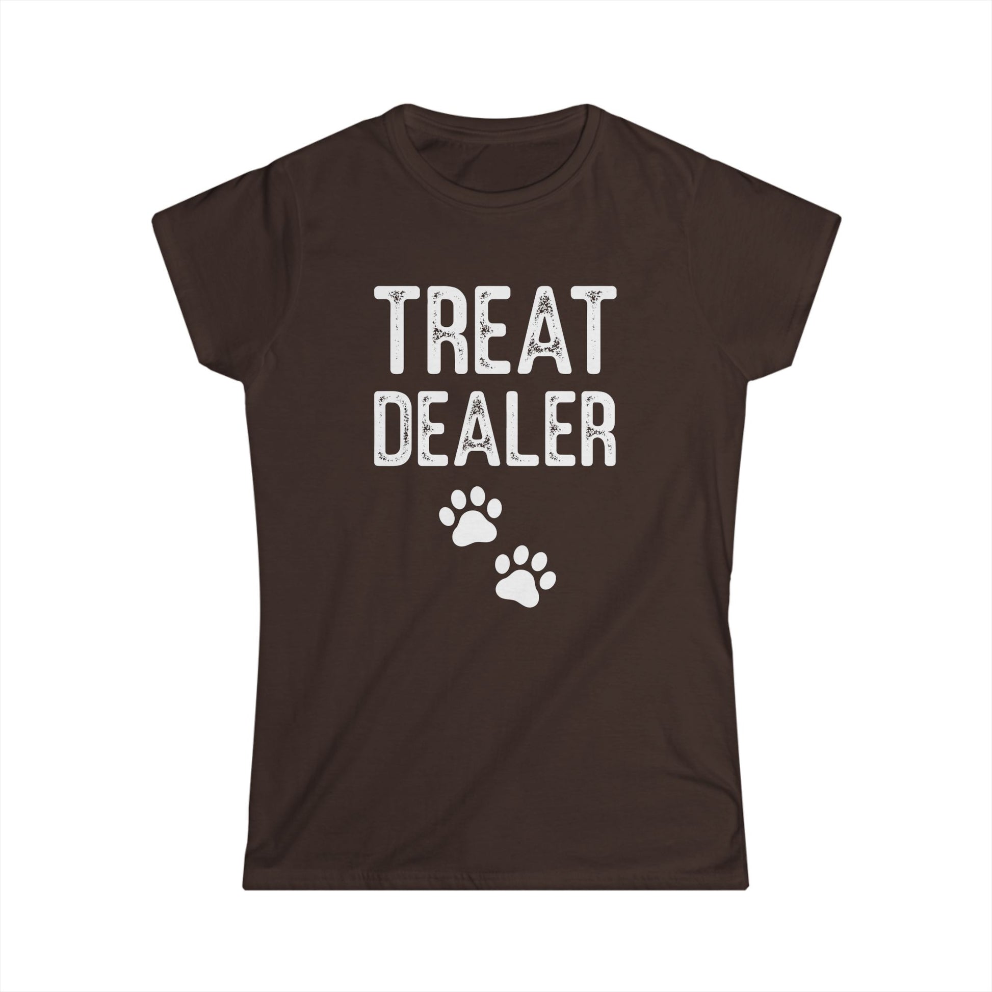 An adorable t-shirt for dog lovers, featuring a fun saying "Treat Dealer" in white font. Ideal for those who love spending quality time with their dogs.