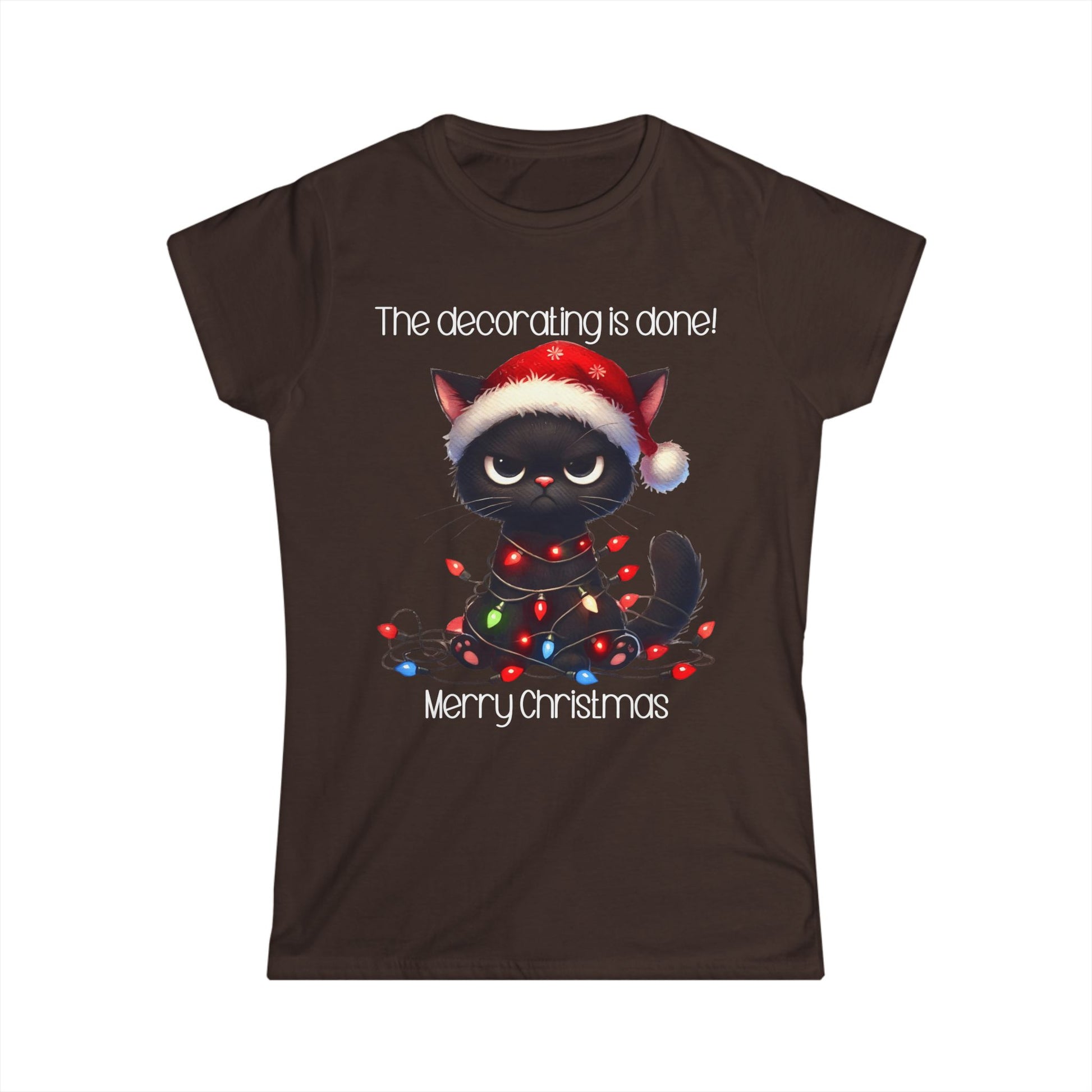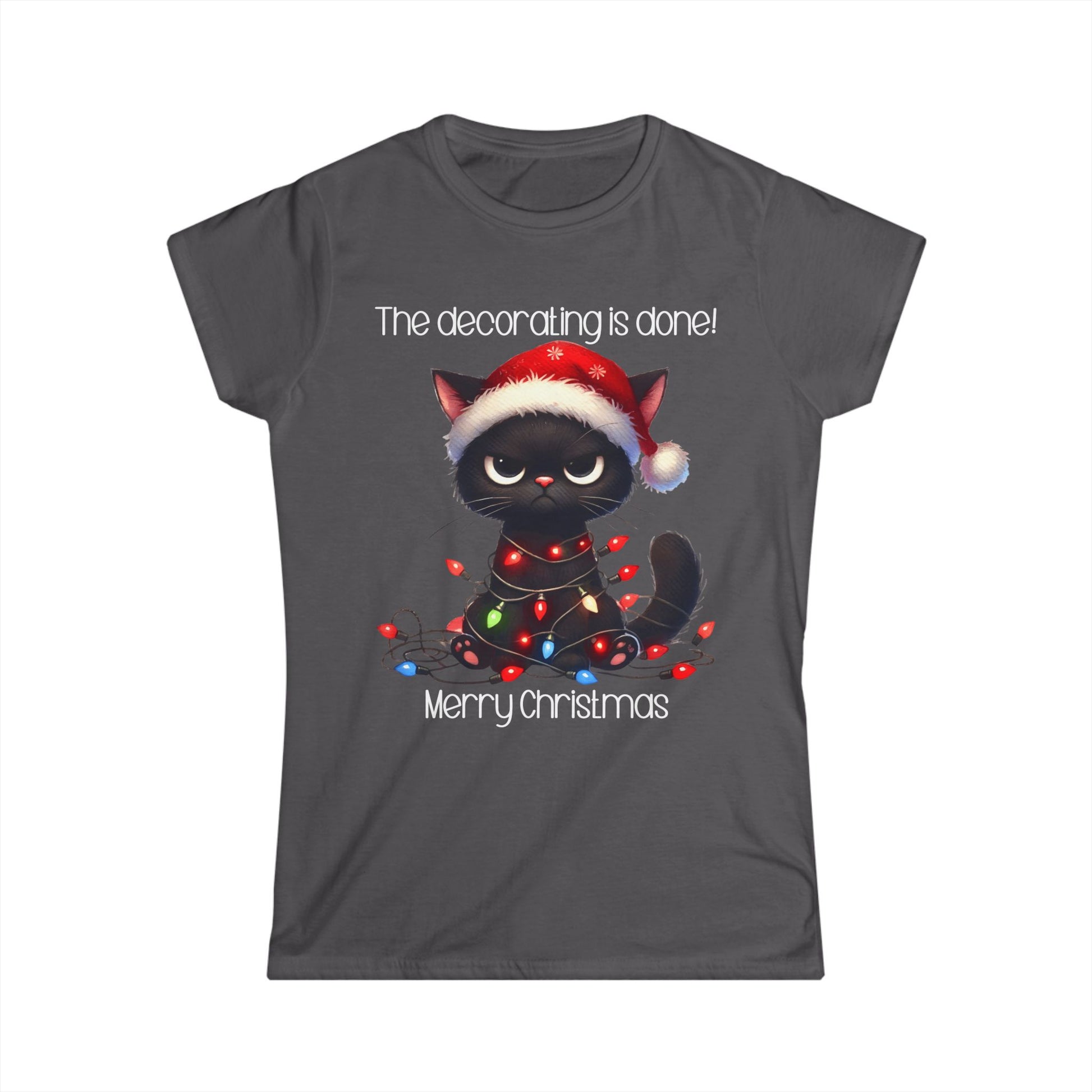 This female cut tee with a funny graphic for Christmas states 'The decorating is done! Merry Christmas'. There is a black cat wrapped in Christmas lights. It is just a cute tee shirt that shows the decorating is completed by the cat being decorated. A fun Christmas shirt for all.