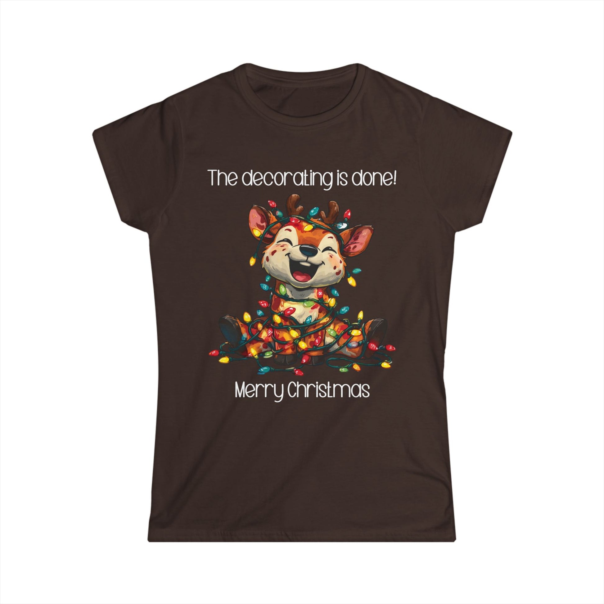 This female cut tee with a funny graphic for Christmas states 'The decorating is done! Merry Christmas'. There is a reindeer wrapped in Christmas lights. It is just a cute tee shirt that shows the decorating is completed by the reindeer being decorated. A fun Christmas shirt for all.