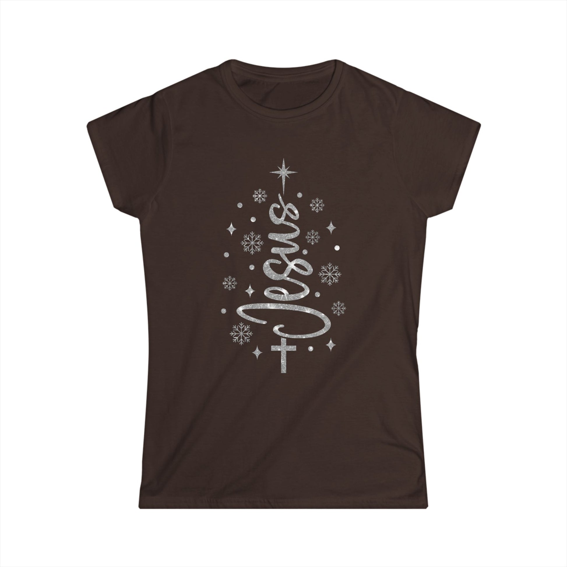 This female cut tee with Jesus in a Christmas tree in silver hue glitter style. A nice comfy shirt to layer or wear on its own for all you holiday events.
