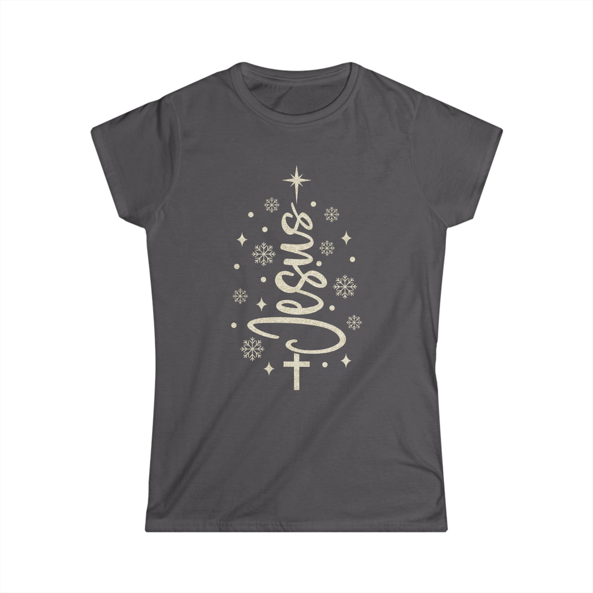 This female cut tee with Jesus in a Christmas tree style in a gold hue glitter style. A nice comfy shirt to layer or wear on its own for all you holiday events.