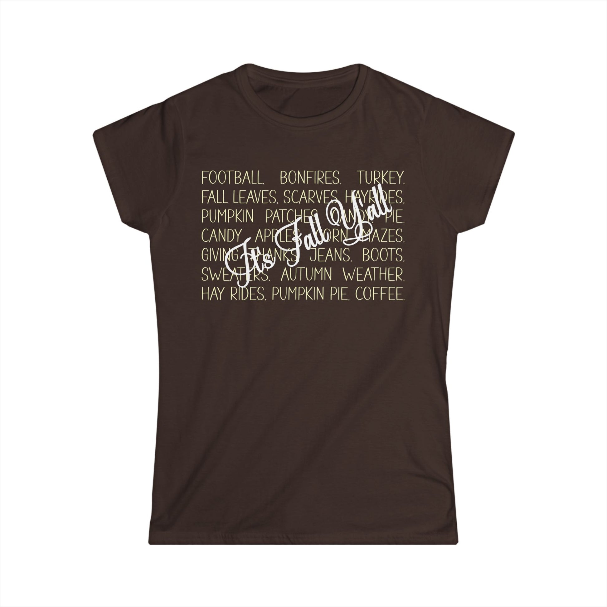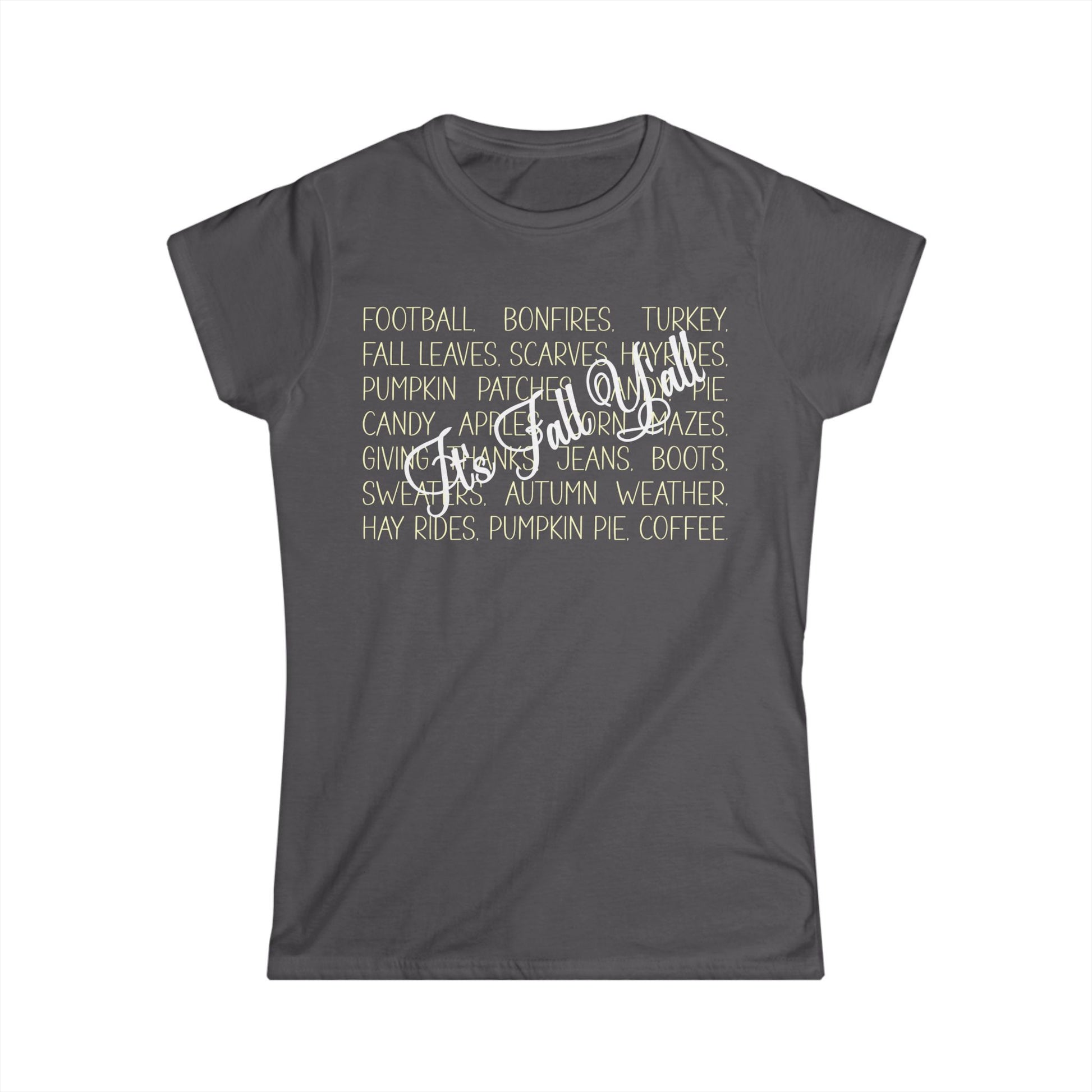 The background word graphic of this comfortable female cut tee is a list of favorite fall things. The list includes; football, bonfires, turkey, fall leaves, scarves, hayrides, pumpkin patches, candy, pie, candy apples, corn mazes, giving thanks, jeans, boots, sweaters, autumn weather, hay rides, pumpkin pie, & coffee. Over the top of the word graph are the words 'Fall is Here!' It is a fun, warm, cozy hoodie to wear at bonfires, football games or even to curl up with a good book.