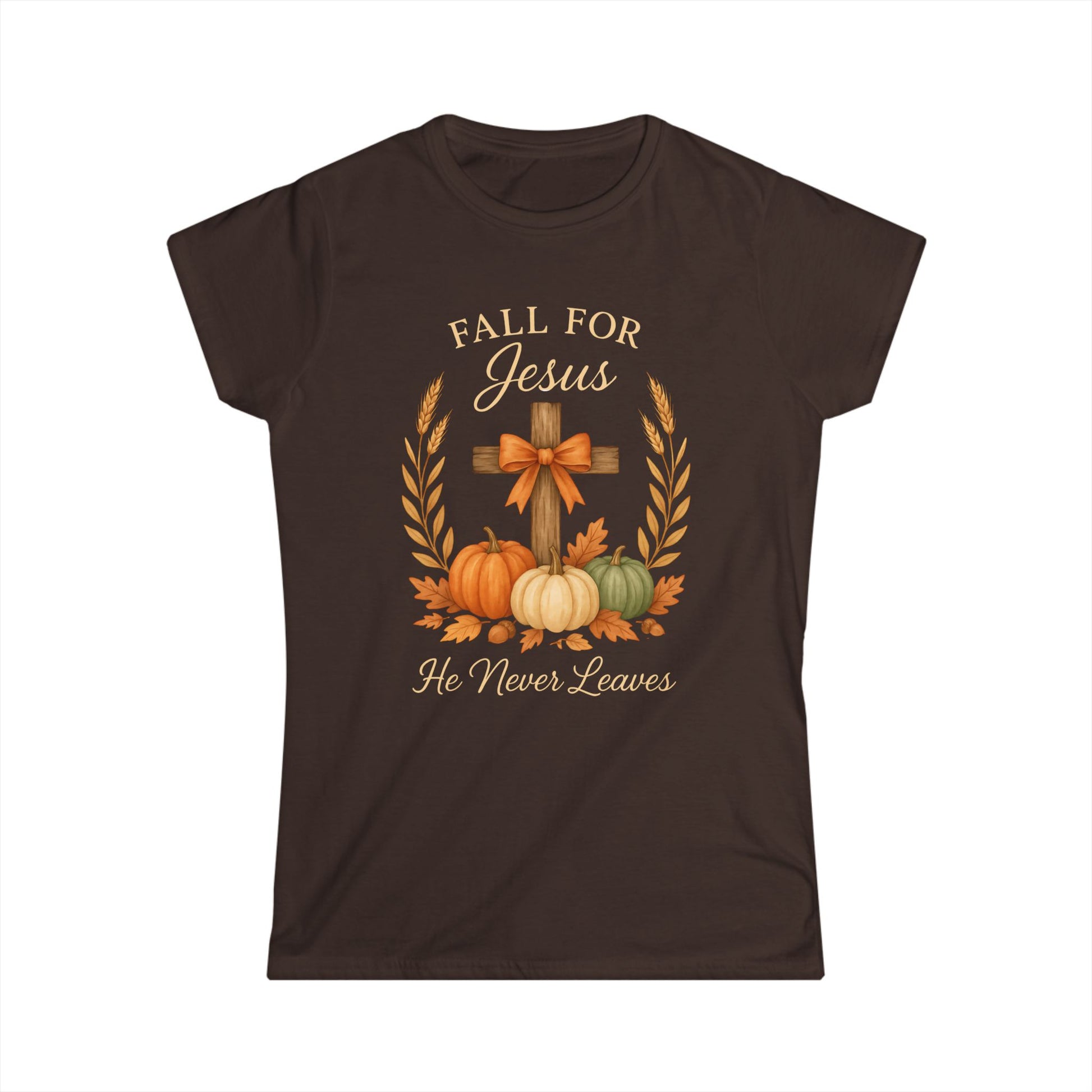 Faith-based t-shirt featuring 'Fall for Jesus, he never leaves' with a cross, some pumpkins and leaves. Perfect for any events that you want to show off pride in your faith. The graphic is simple but the message is powerful. Makes a great gift idea for all occasions, relevant for celebrations. Ideal for adults who want to showcase their faith in a stylish and comfortable way.