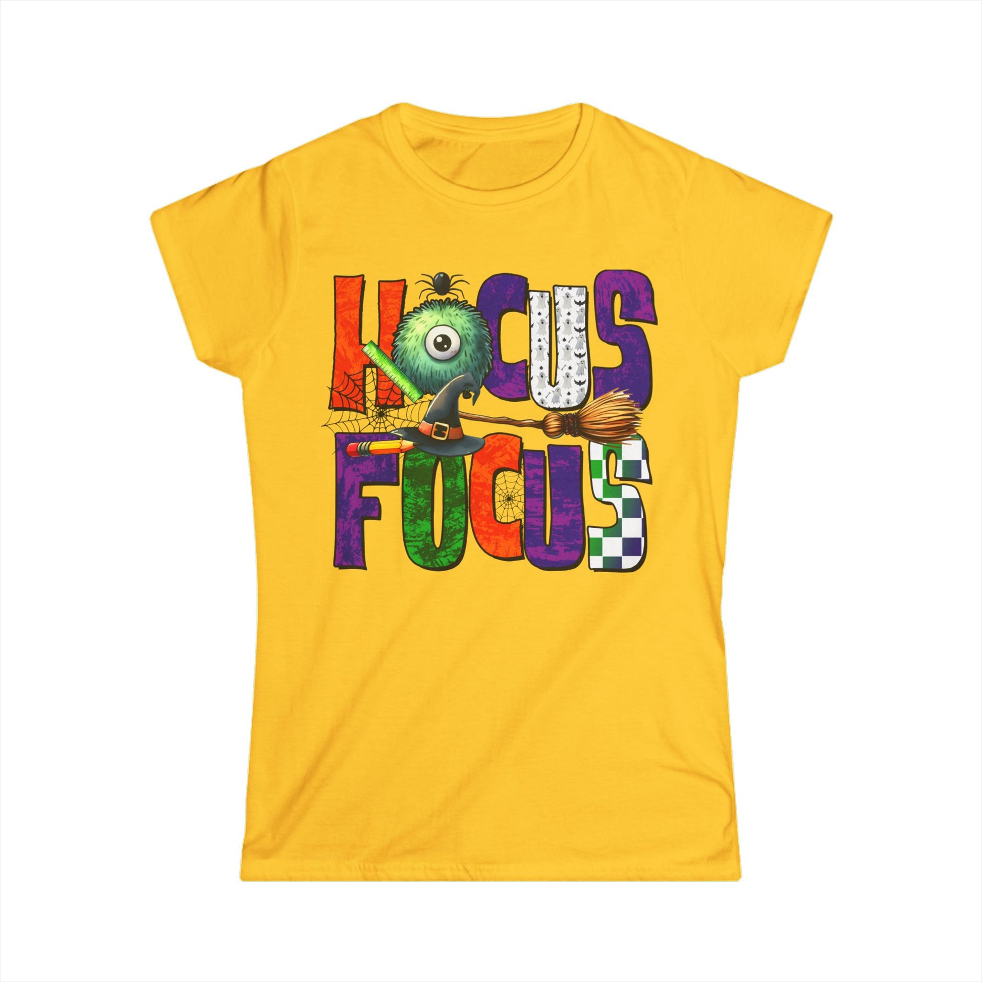 This fun comfortable and female cut stylish tee with the quote "Hocus Focus" with a light hearted Halloween theme is perfect for all classrooms. Educators and anyone passionate about teaching, who also love the movie that inspired the artwork, this tee is for you! This tee exudes a fun and playful vibe with its vibrant graphics, making it a fantastic addition to your wardrobe and is acceptable for all grades. Whether you're in the classroom or out with friends, this shirt provides a cozy and relaxed fit while ensuring you look effortlessly stylish.