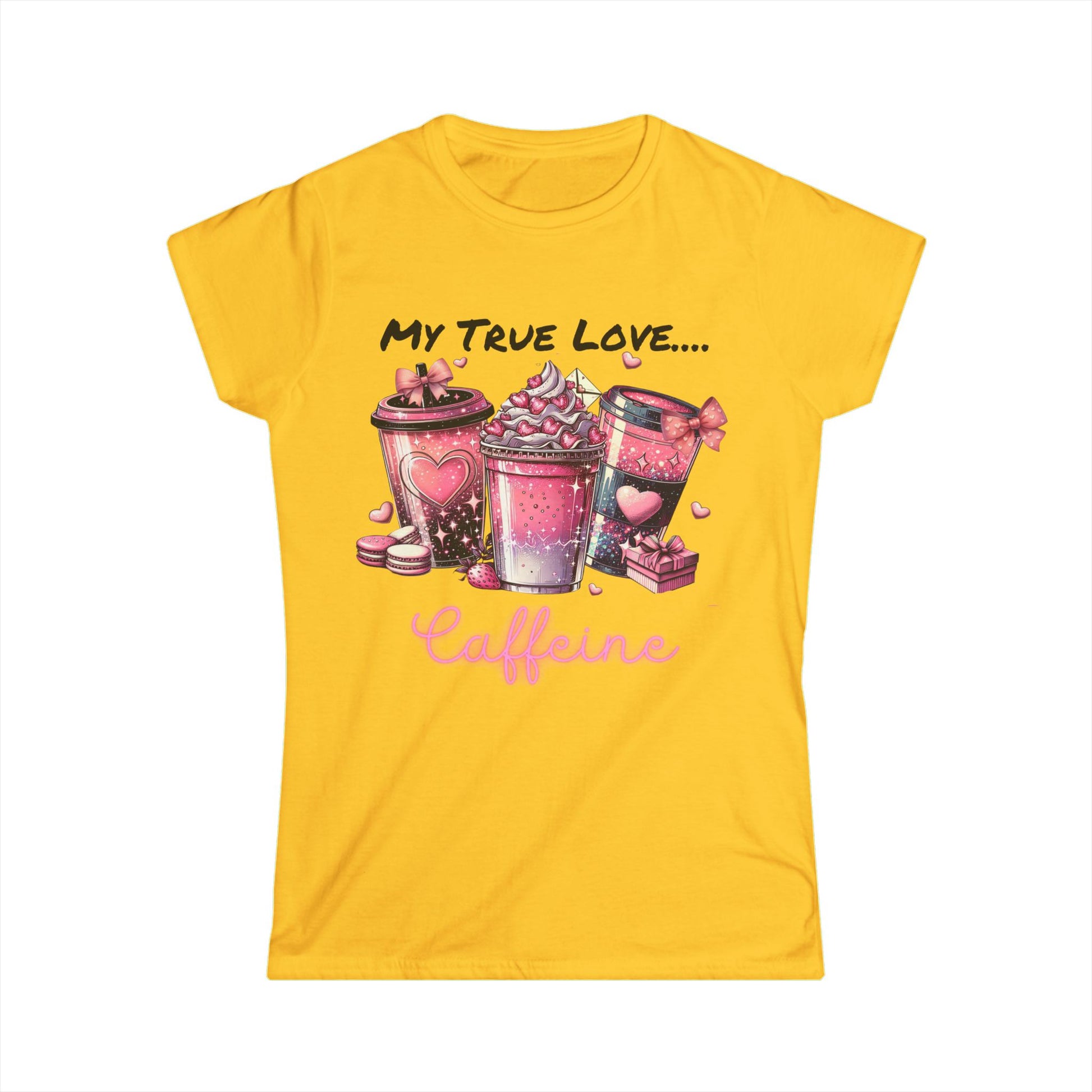 Cozy and playful female cut style cotten tee shirt featuring cute coffee drink designs and the phrase "My True Love...Caffeine in black and pink neonlight style font. Perfect for showing off your one tree love....caffeine for the month of February and beyond. Ideal for adults looking for a fun and festive outfit for the Valentine's month.