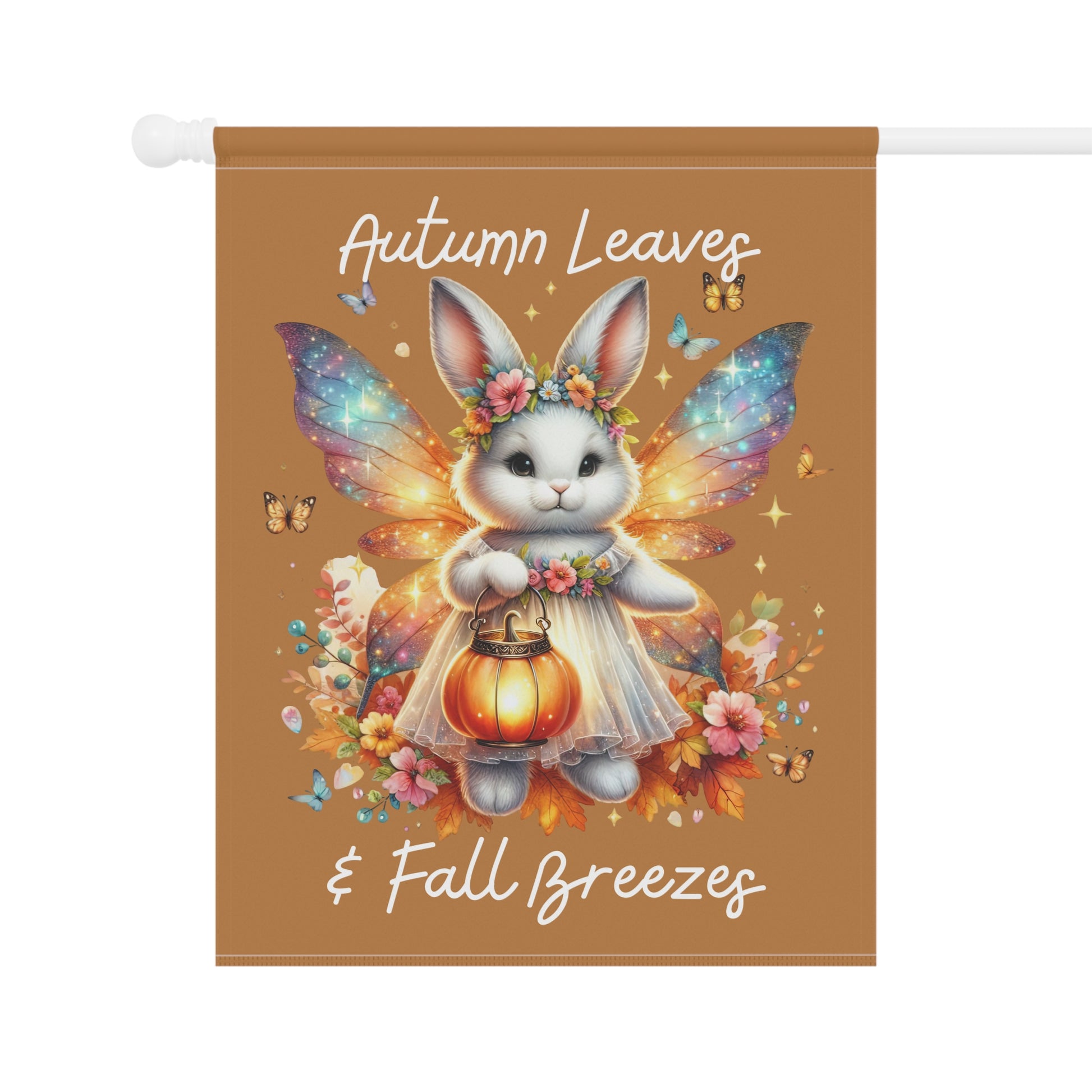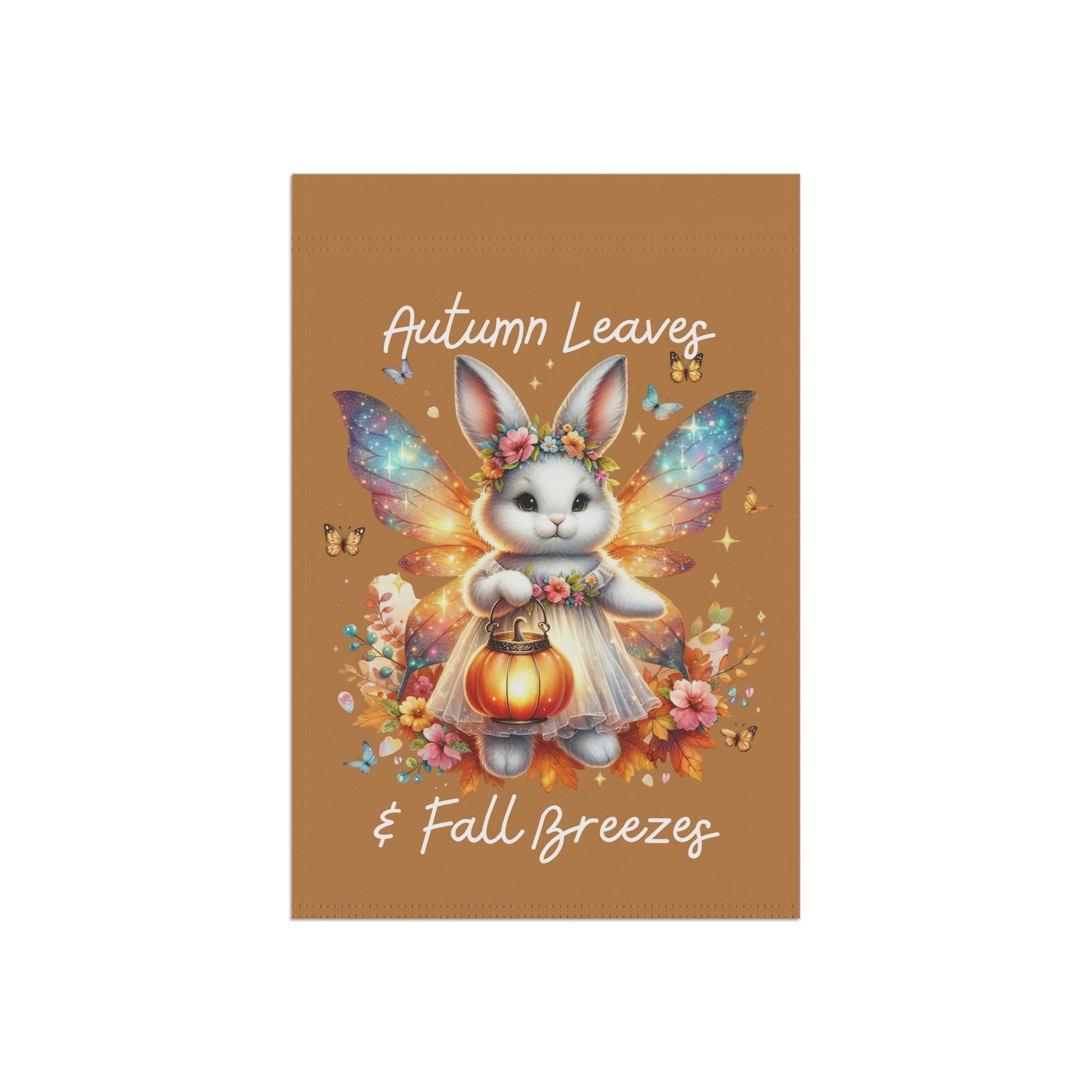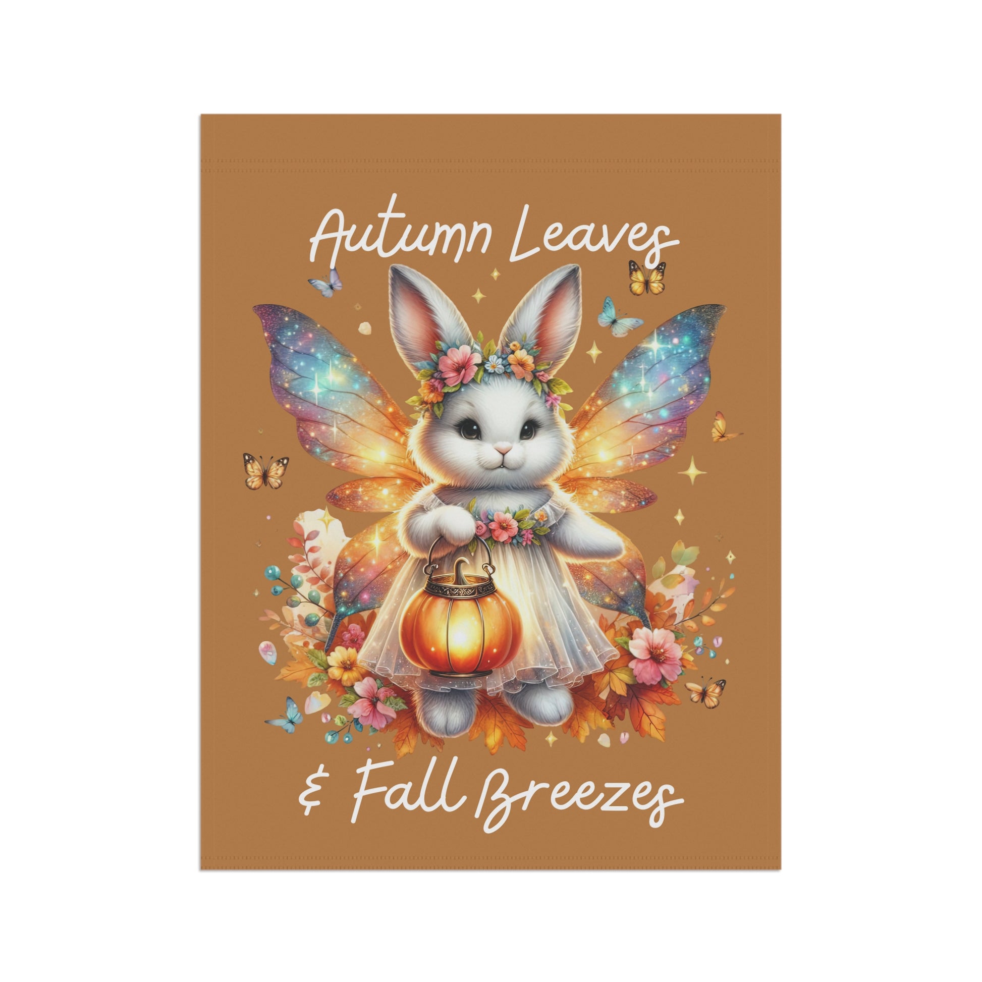 A garden flag with a beautiful bunny fairy holding a lantern. This graphic includes the saying 'Autumn Leaves & Fall Breezes'. It's a fun and lighthearted image to place in your garden for the season. It is a great addition to your flag collection, especially for those who love beauty, mystic fairies and the autumn season.