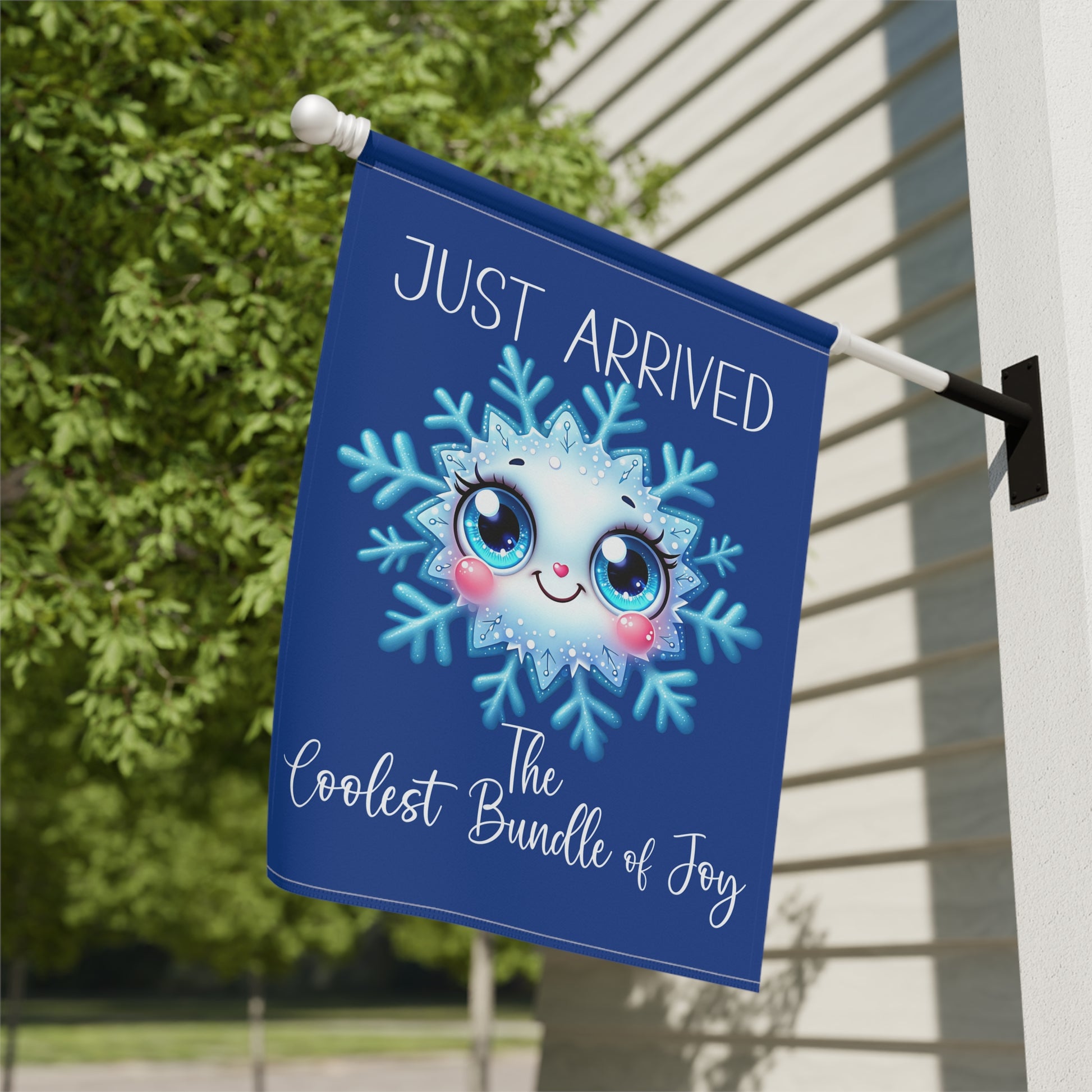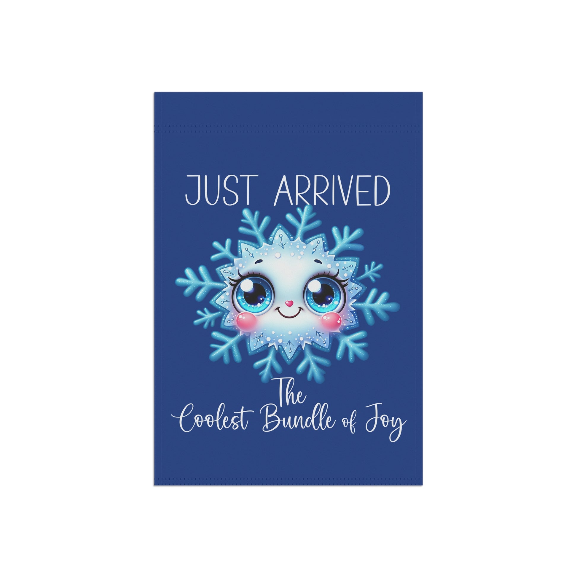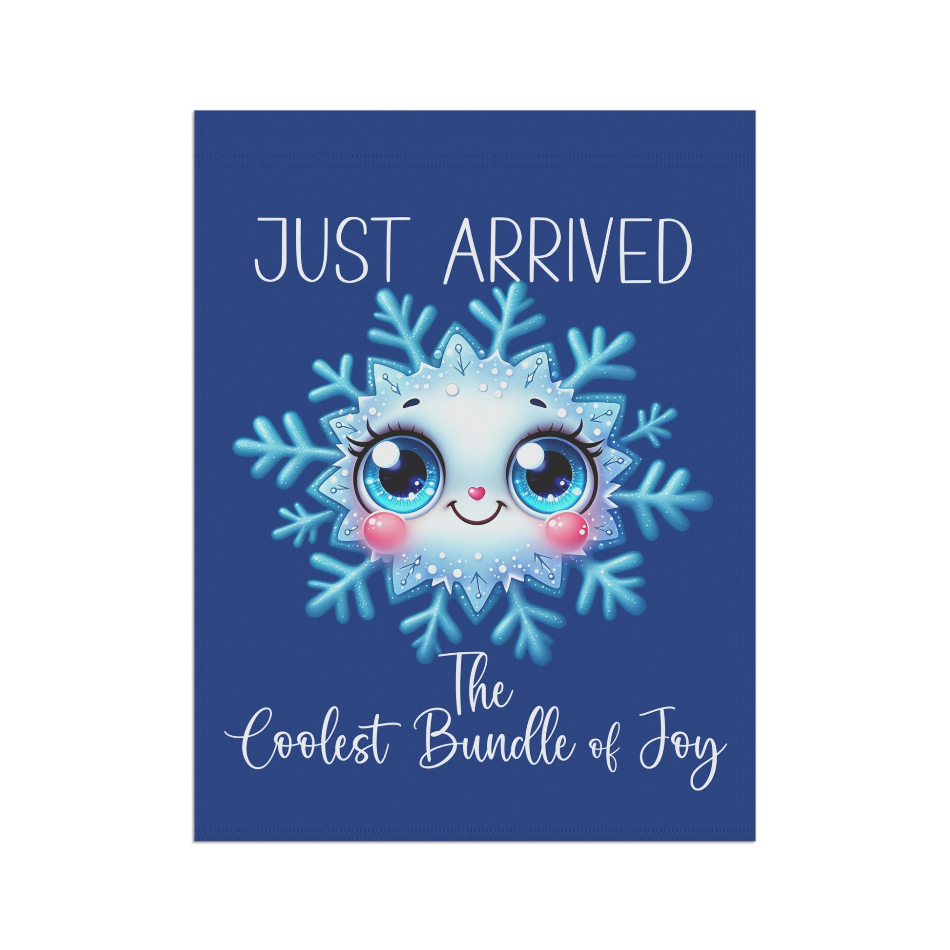 This garden flag with the quote "Just Arrived" "The Coolest Bundle of Joy" featuring a adorable gender neutral snowflake. This is perfect for those who like the surprise at the end of pregnancy but you want to announce your bundle of joy that arrives in the winter months. It is even perfect for grandparents to have to put out each time a new bundle of joy arrives. It's a fantastic addition to your flag collection.