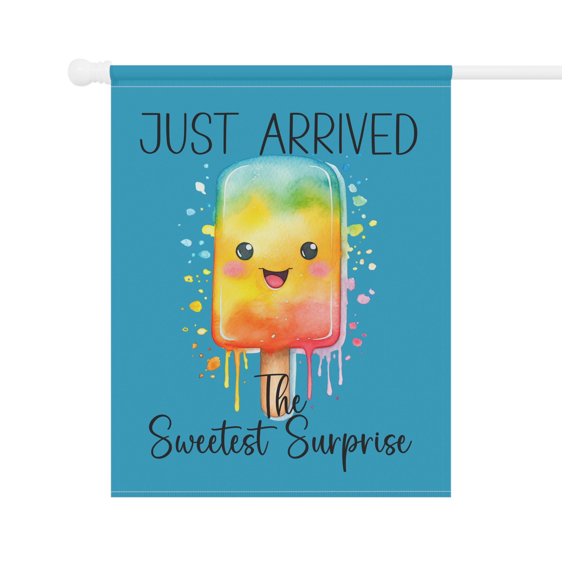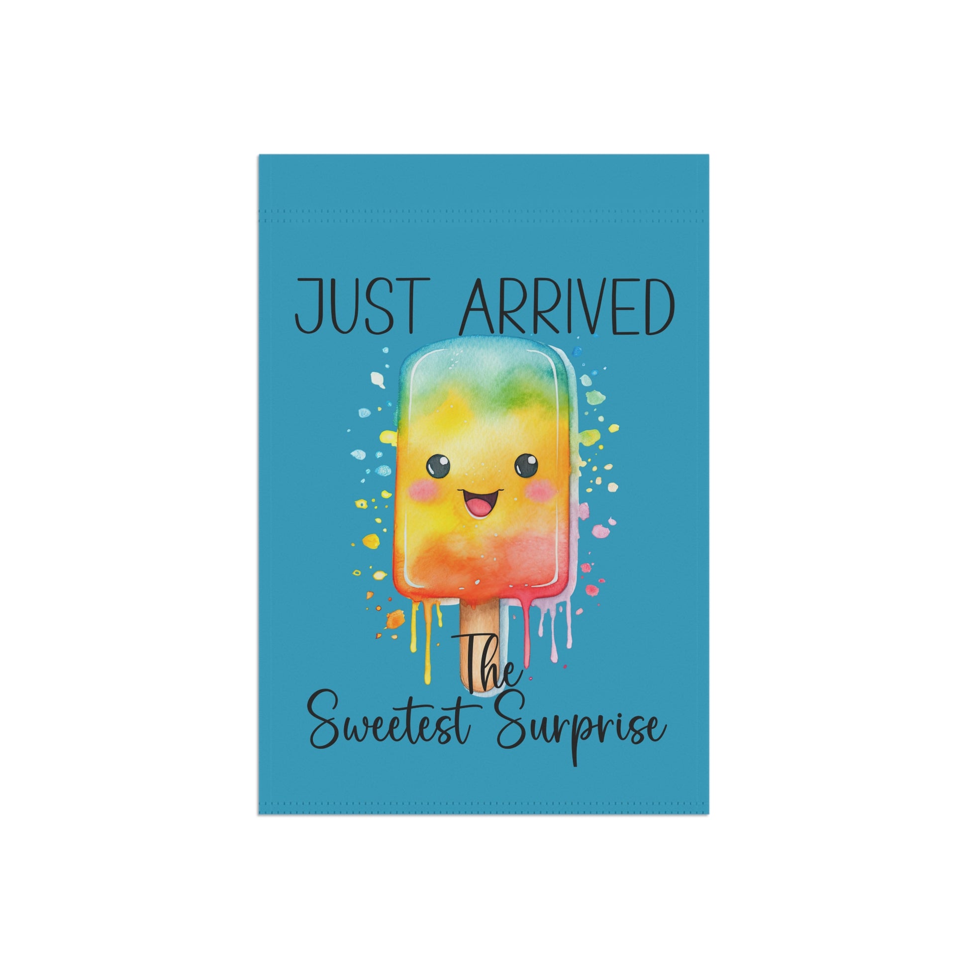 This garden flag with the quote "Just Arrived" "The Sweetest Surprise" featuring a adorable gender neutral popsicle. This is perfect for those who like the surprise at the end of pregnancy but you want to announce your bundle of joy that arrives in the summer months. It is even perfect for grandparents to have to put out each time a new bundle of joy arrives. It's a fantastic addition to your flag collection.