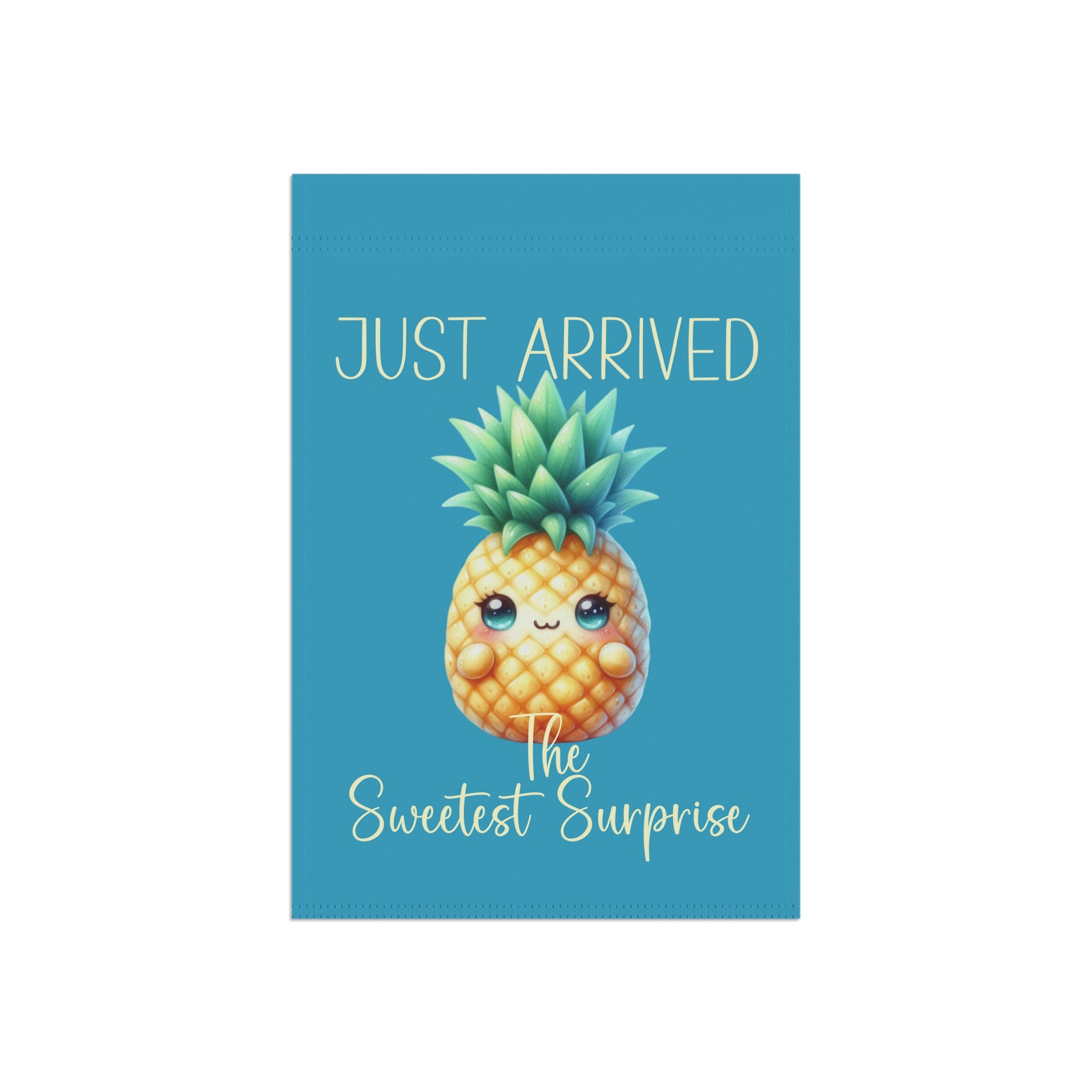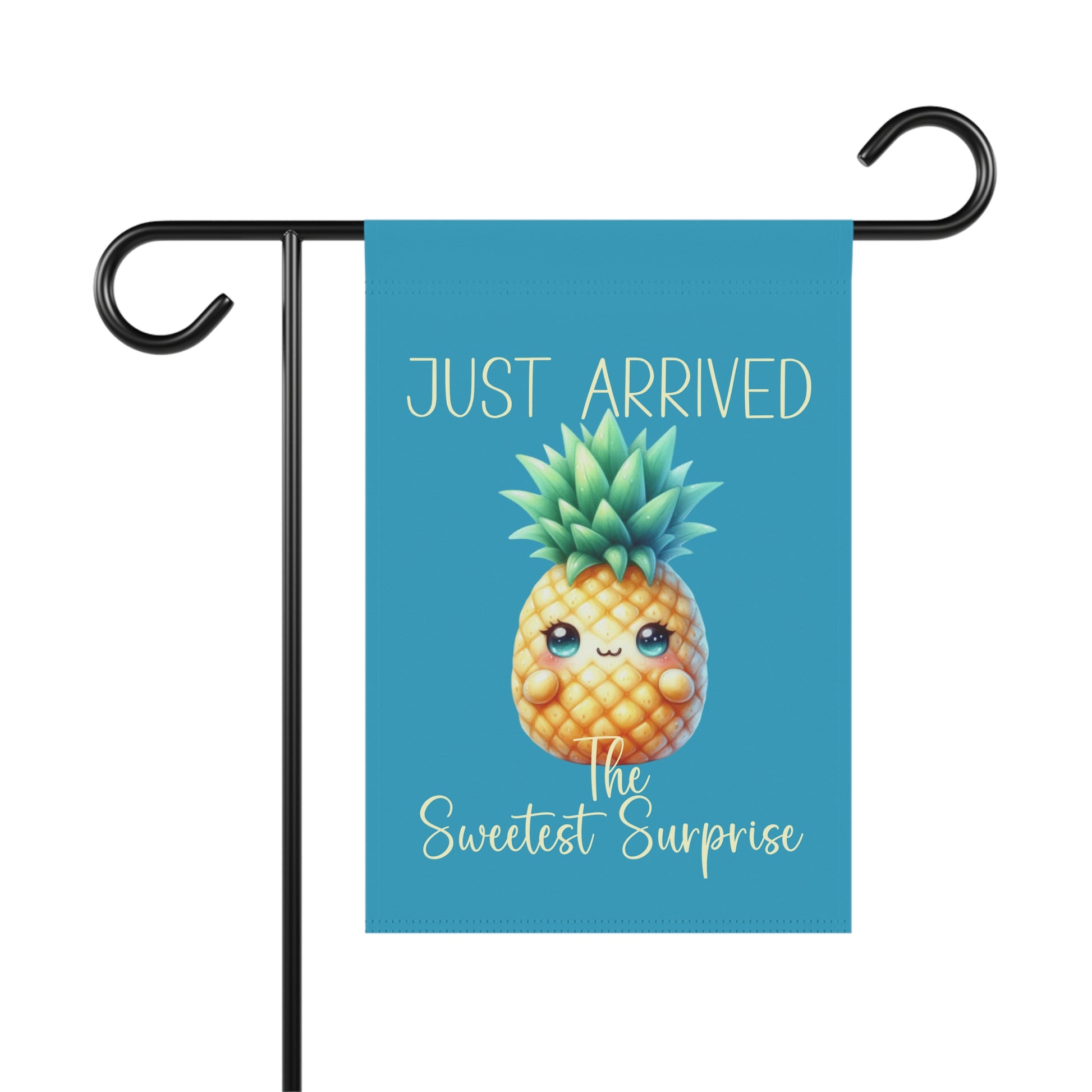 This garden flag with the quote "Just Arrived" "The Sweetest Surprise" featuring a adorable gender neutral pineapple. This is perfect for those who like the surprise at the end of pregnancy but you want to announce your bundle of joy that arrives in the summer months. It is even perfect for grandparents to have to put out each time a new bundle of joy arrives. It's a fantastic addition to your flag collection.