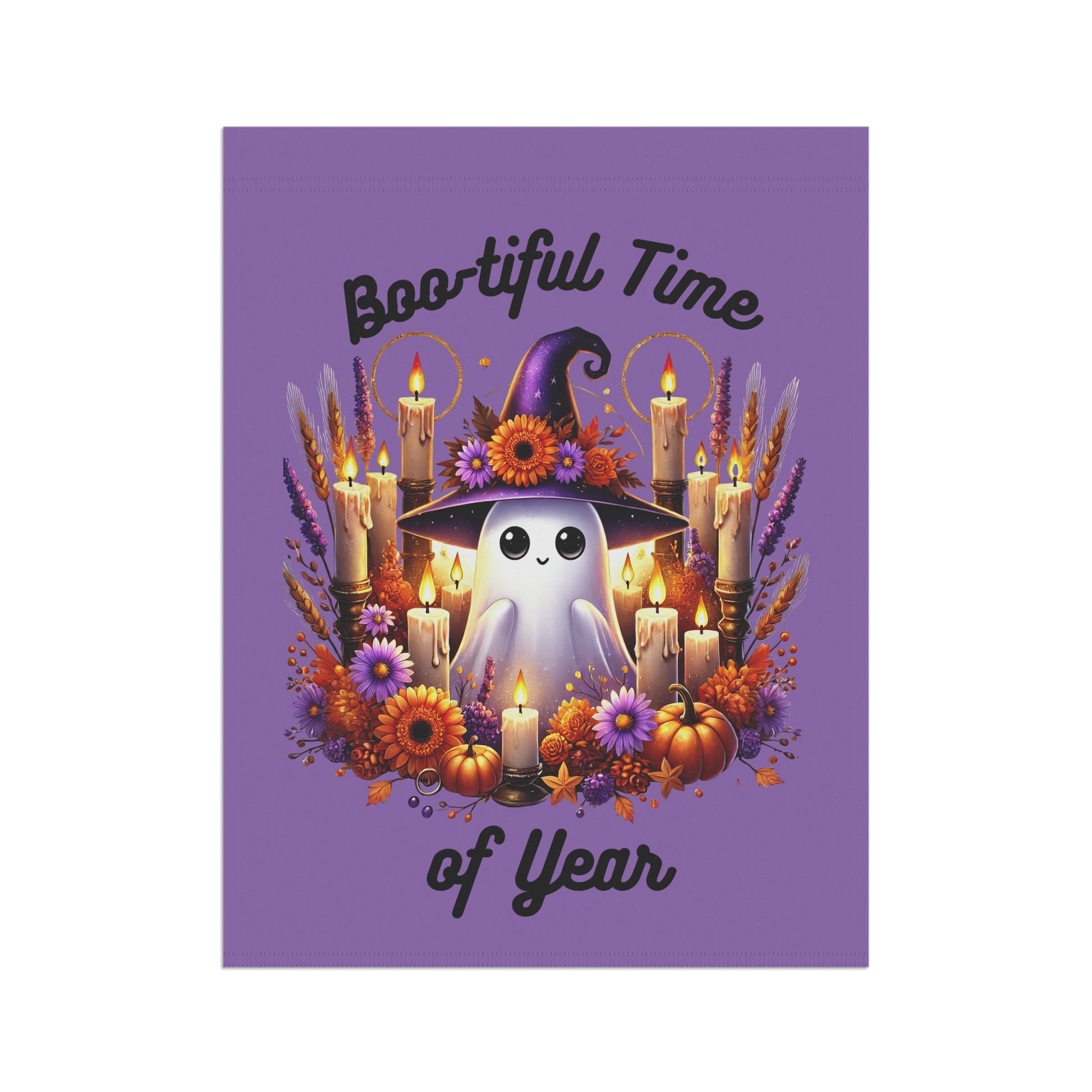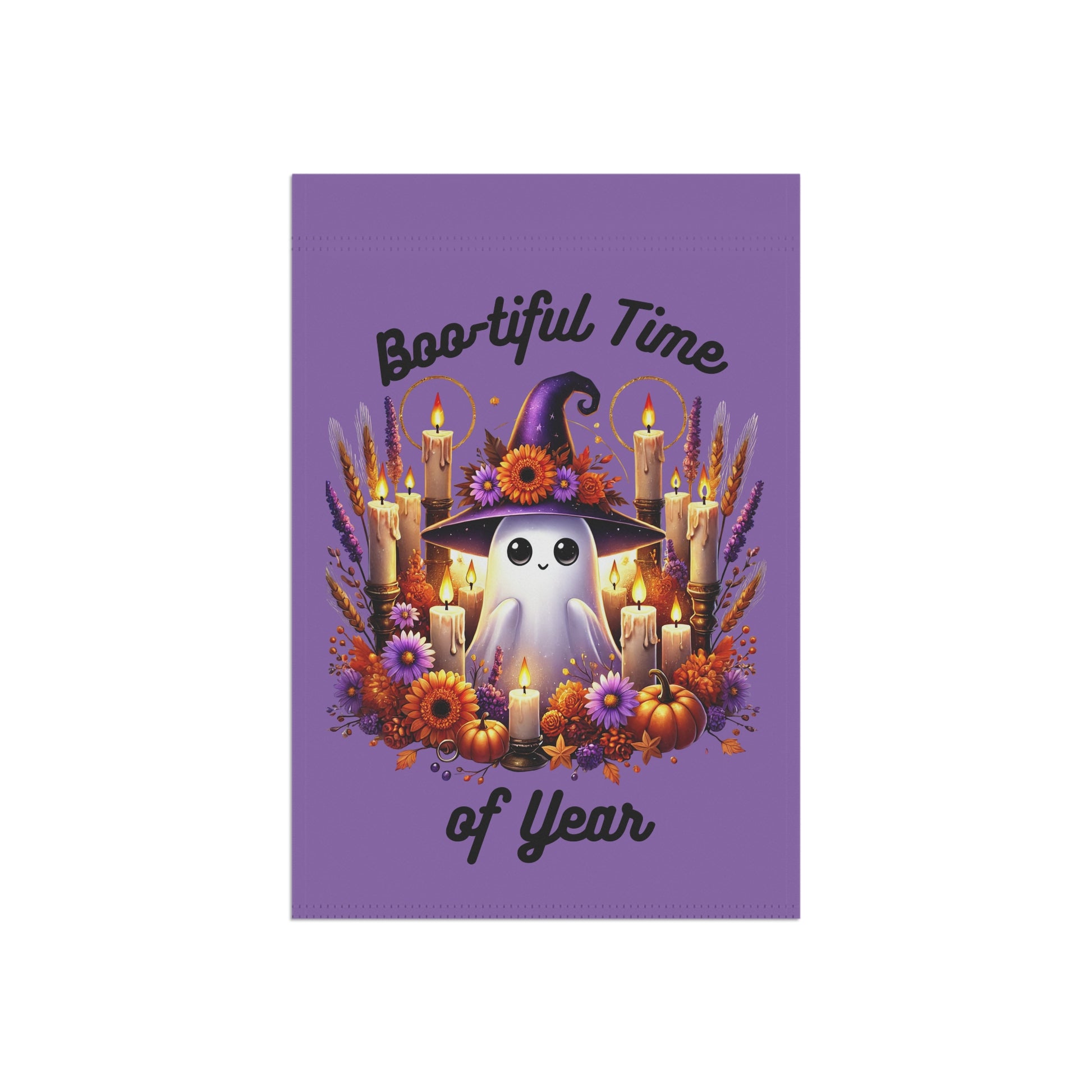 A garden flag with the quote "Boo-itful Time of Year" featuring a friendly ghost with harvest items and lit candles. It's a fantastic addition to your flag collection, especially for Halloween enthusiasts who love the innocents of Halloween.