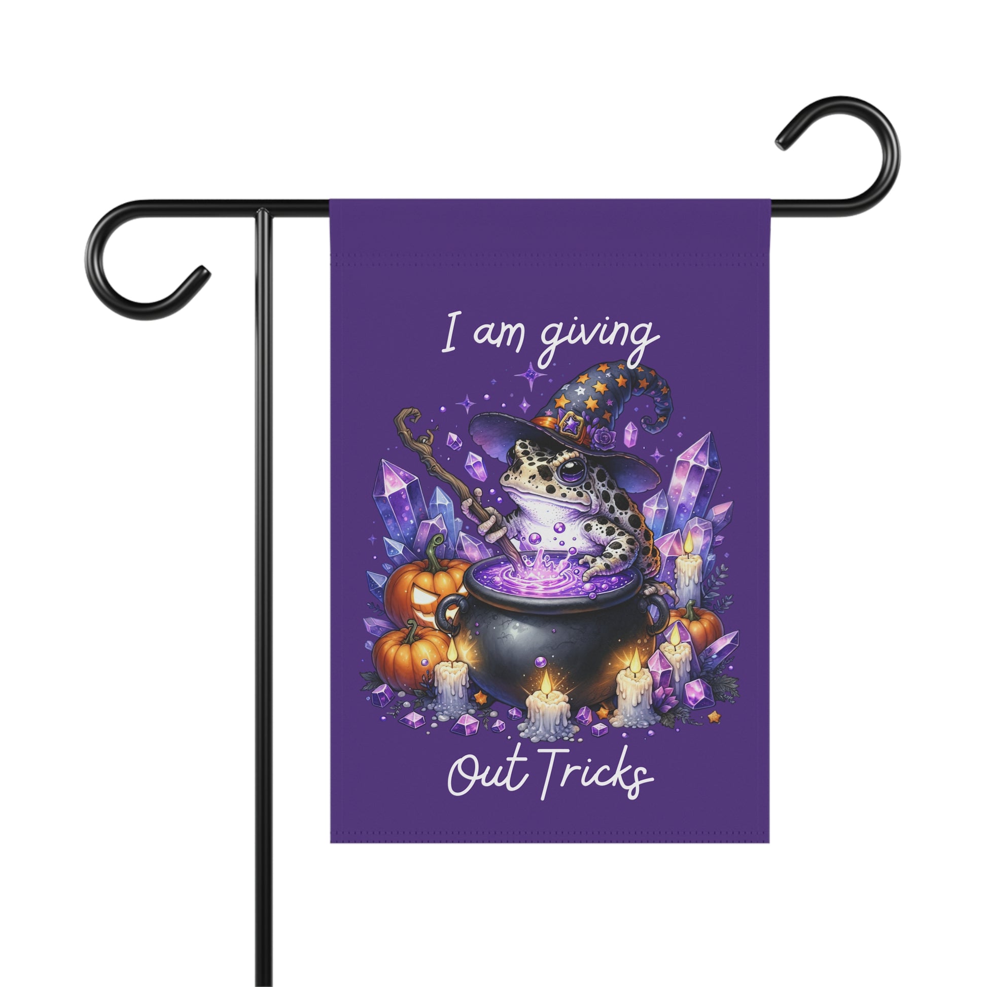 A garden flag with a witchy toad stirring a cauldron that simply warns the trick or treaters, they will be getting tricks. It's a silly and playful graphic and is a great addition to your flag collection, especially for Halloween enthusiasts who love the innocents of Halloween.