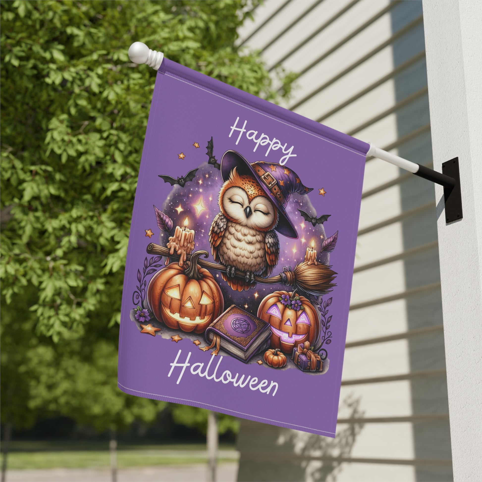 A garden flag with a precious witch owl sitting among spell books, jack-o-lanterns, candles hositng the 'Happy Halloween' quote.. It's a fun and playful graphic and is a great addition to your flag collection, especially for Halloween enthusiasts who love the innocents of Halloween.