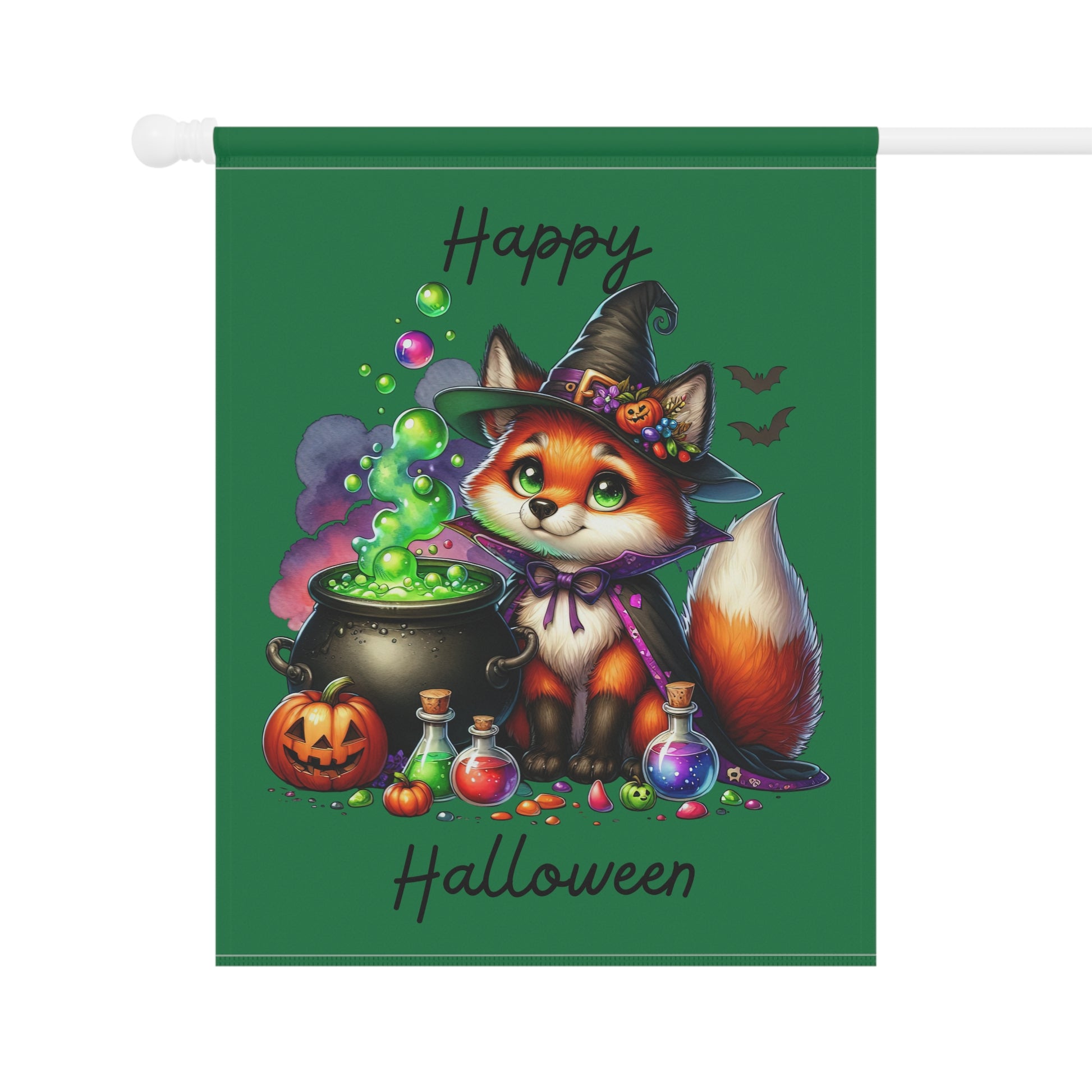 A garden flag with a witchy fox with the cauldron that includes the saying 'Happy Halloween'. It's a fun and playful graphic and is a great addition to your flag collection, especially for Halloween enthusiasts who love the innocents of Halloween.