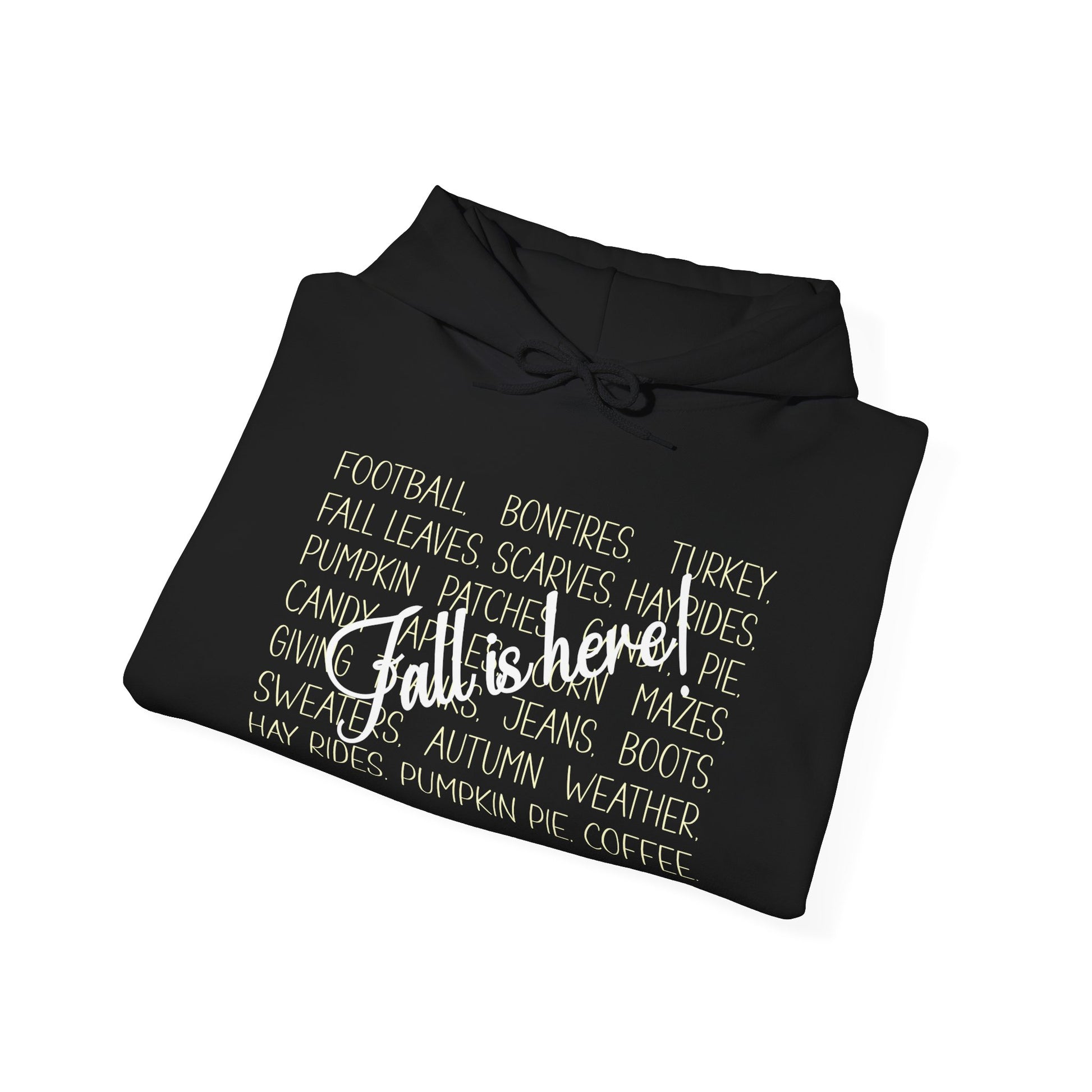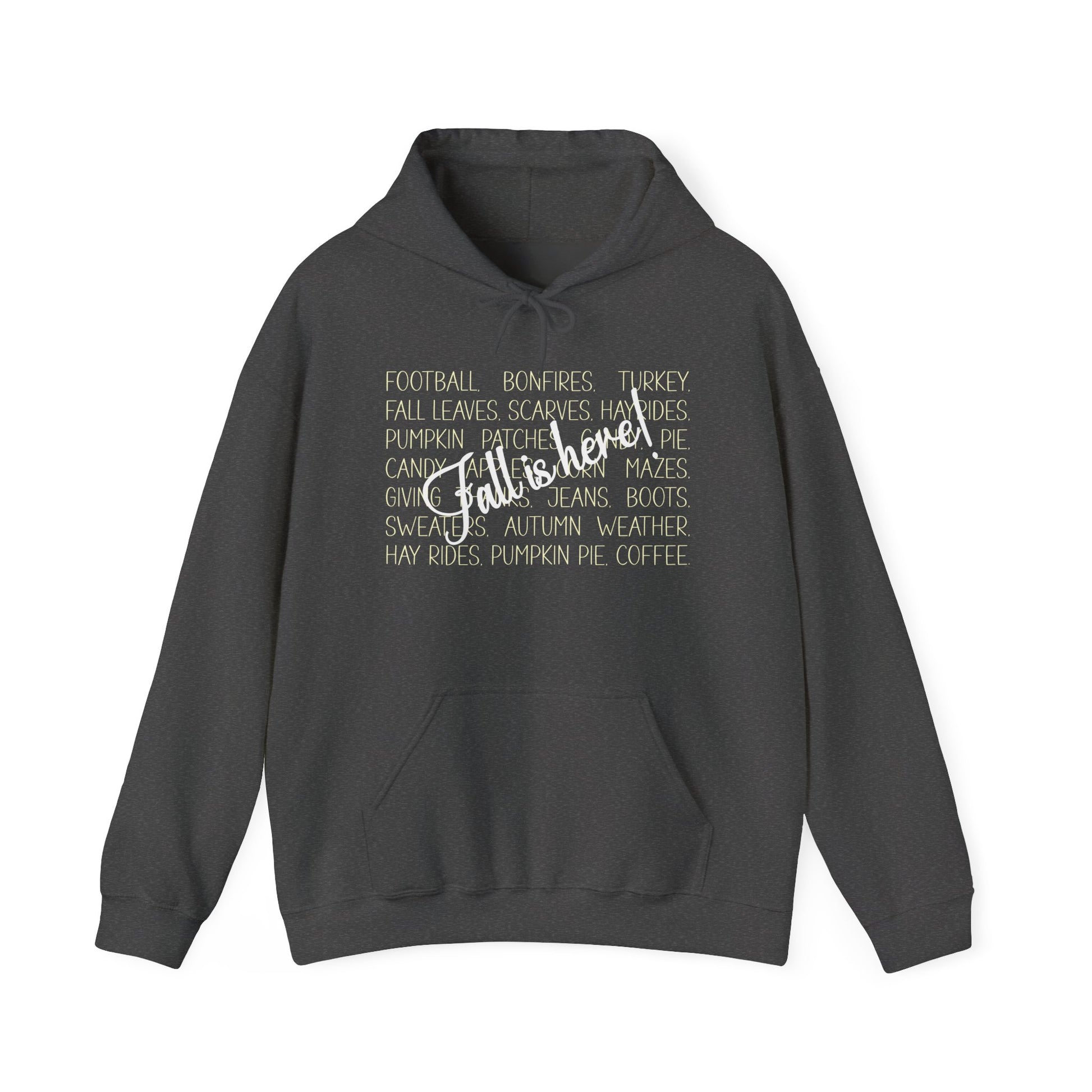 The background word graphic of this warm hoodie is a list of favorite fall things. The list includes; football, bonfires, turkey, fall leaves, scarves, hayrides, pumpkin patches, candy, pie, candy apples, corn mazes, giving thanks, jeans, boots, sweaters, autumn weather, hay rides, pumpkin pie, & coffee. Over the top of the word graph are the words 'Fall is Here!' It is a fun, warm, cozy hoodie to wear at bonefires, football games or even to curl up with a good book.
