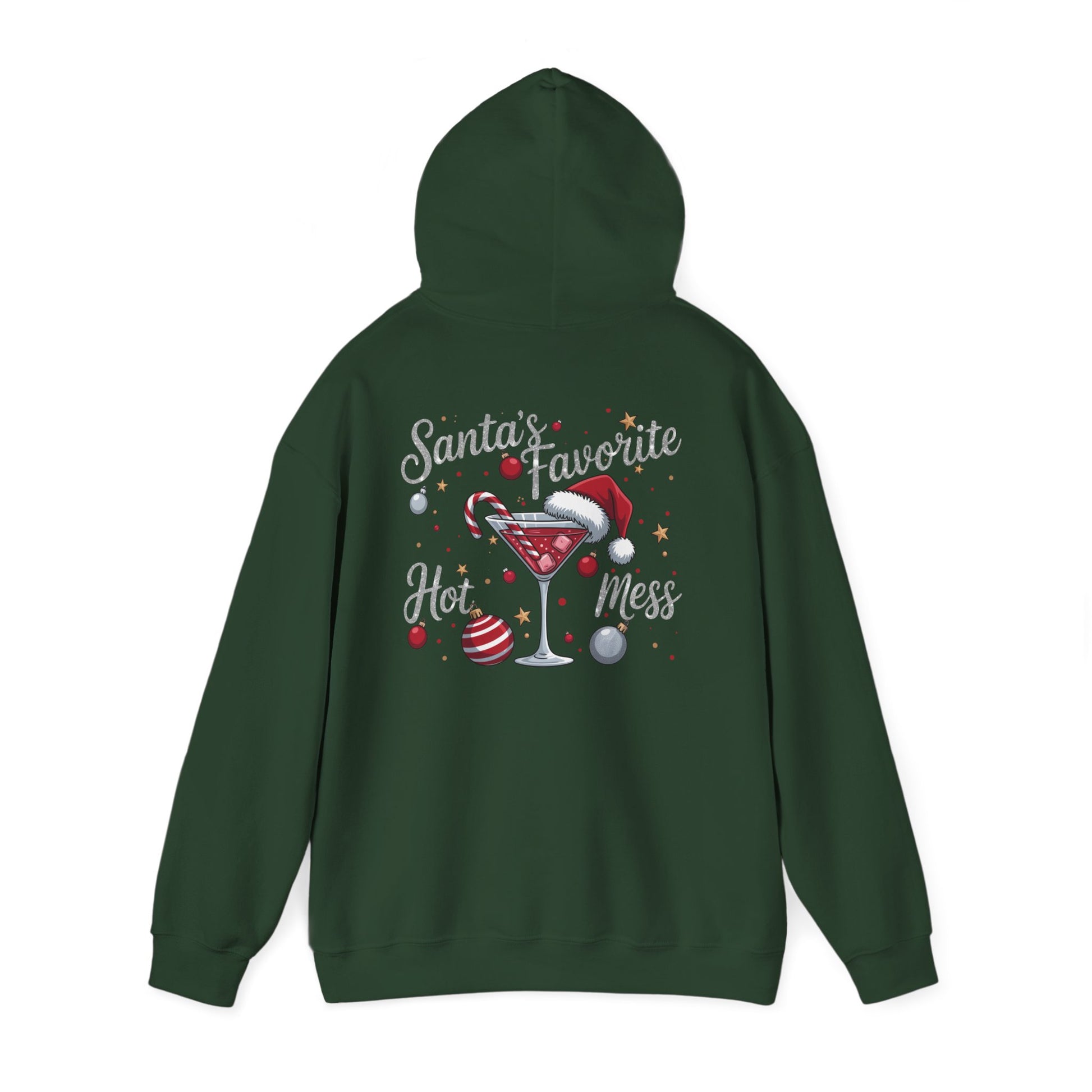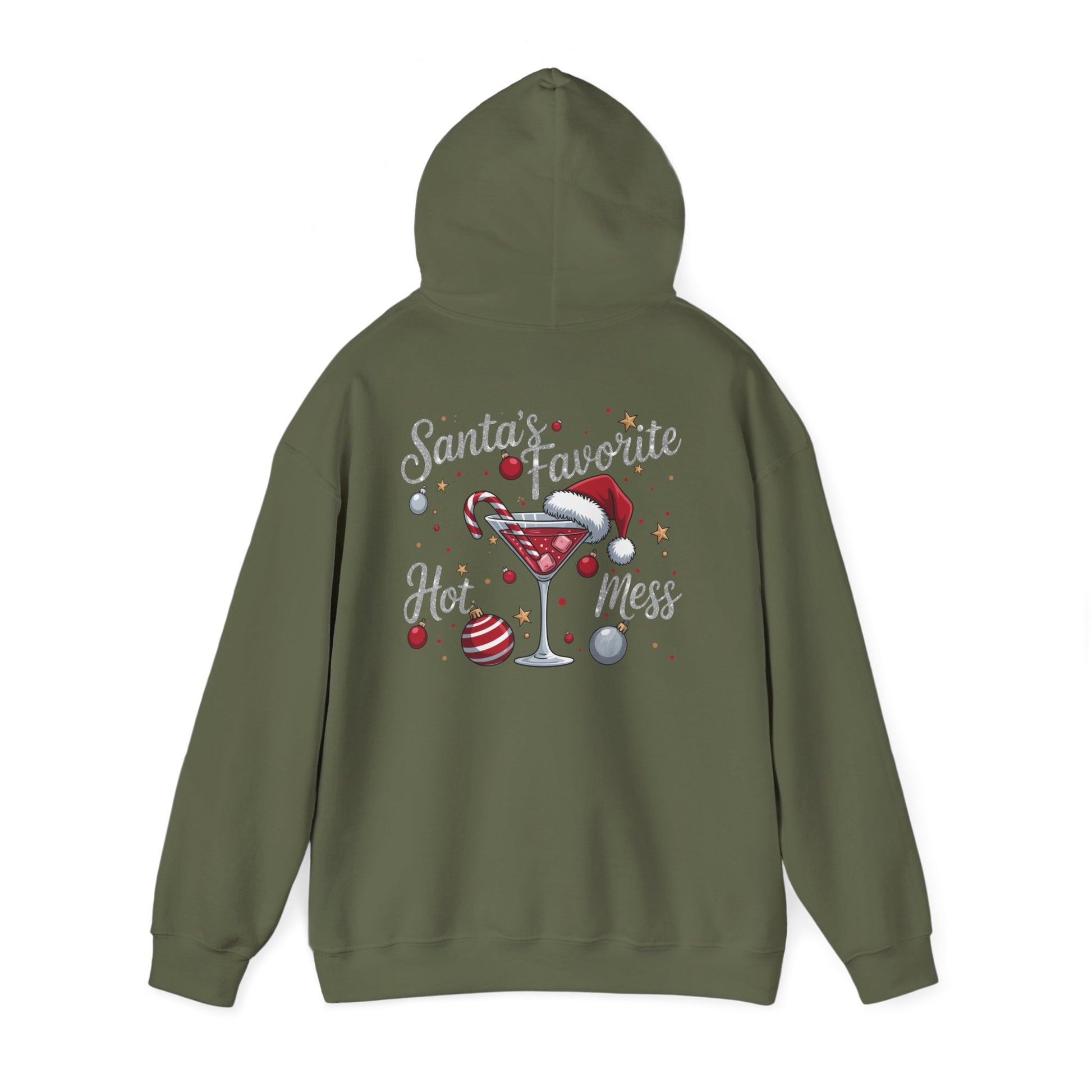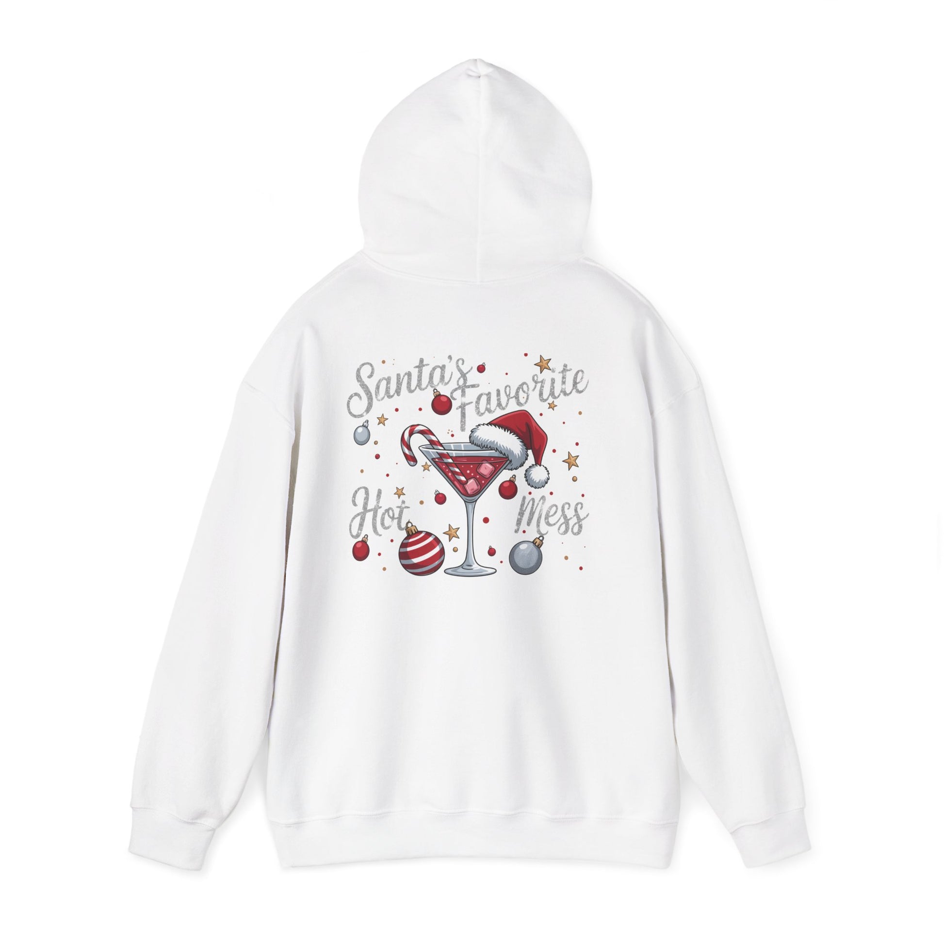 Celebrate Christmas with this cozy hoodie with a funny graphic for Christmas has martini glass with a candy cane and Santa hat with a few ornaments featuring in glitter looking writing 'Santa's Favorite Hot Mess' written. It is just a fun Christmas season hoodie.