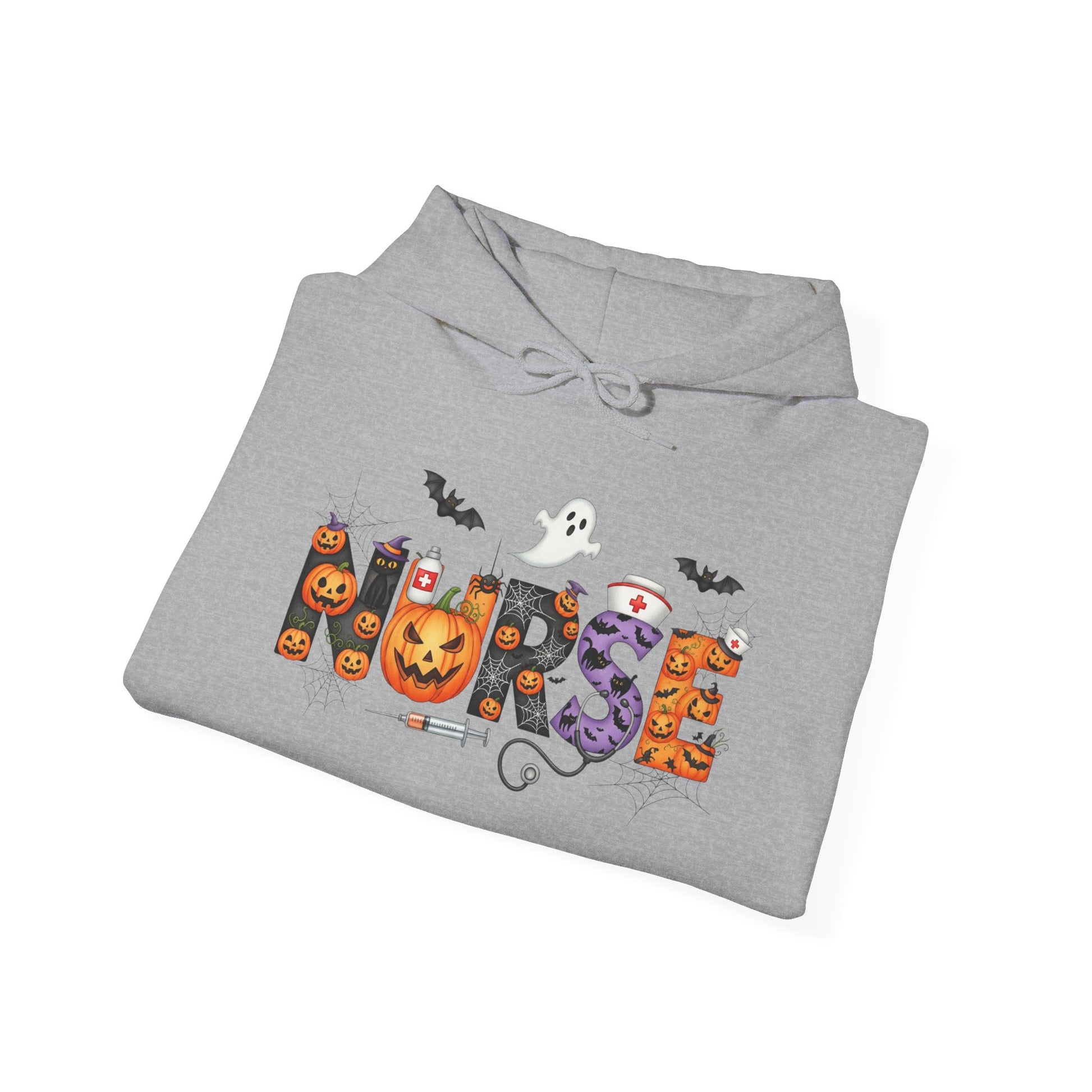 Embrace warmth and style with this cozy hooded sweatshirt, designed with the quote "Nurse" that has simple Halloween themed patterns inside the nurse. There are also cute ghost, bats, spiders & webs. This hooded exudes a fun and playful vibe with its vibrant graphics, making it a fantastic addition to your wardrobe and is acceptable for all enviroments. This hood will provide a cozy and relaxed fit while ensuring you look effortlessly stylish.