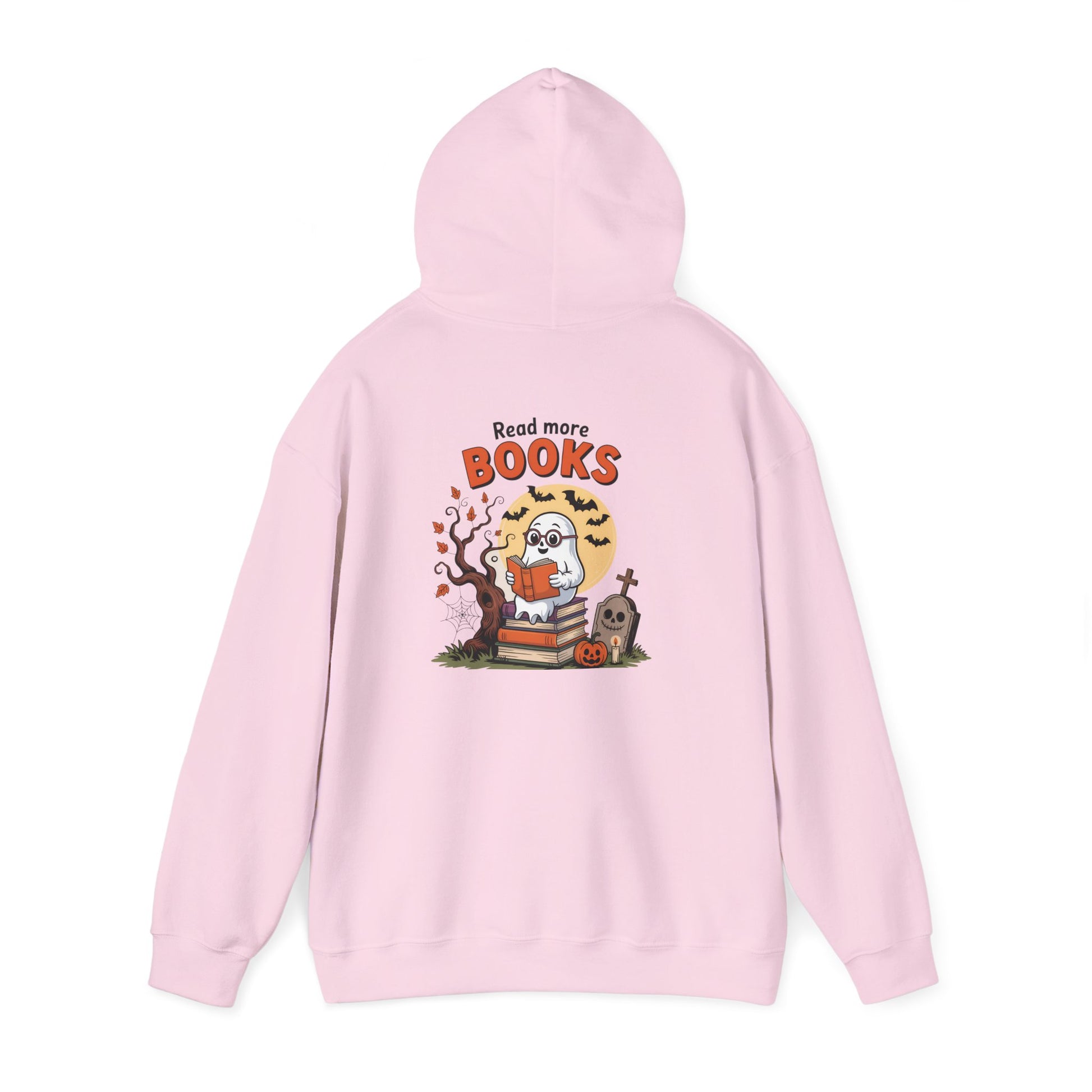 Embrace warmth and style with this cozy hooded sweatshirt, designed with the quote " Read More Books" with a cute ghost sitting on books and reading a book. This is a light hearted Halloween theme is perfect for all Elementary or younger classrooms. This tee exudes a fun and playful vibe with its vibrant graphics, making it a fantastic addition to your wardrobe and is acceptable for all grades. Whether you're in the classroom or out with friends, this shirt provides a cozy and relaxed fit while ensuring you look effortlessly stylish.