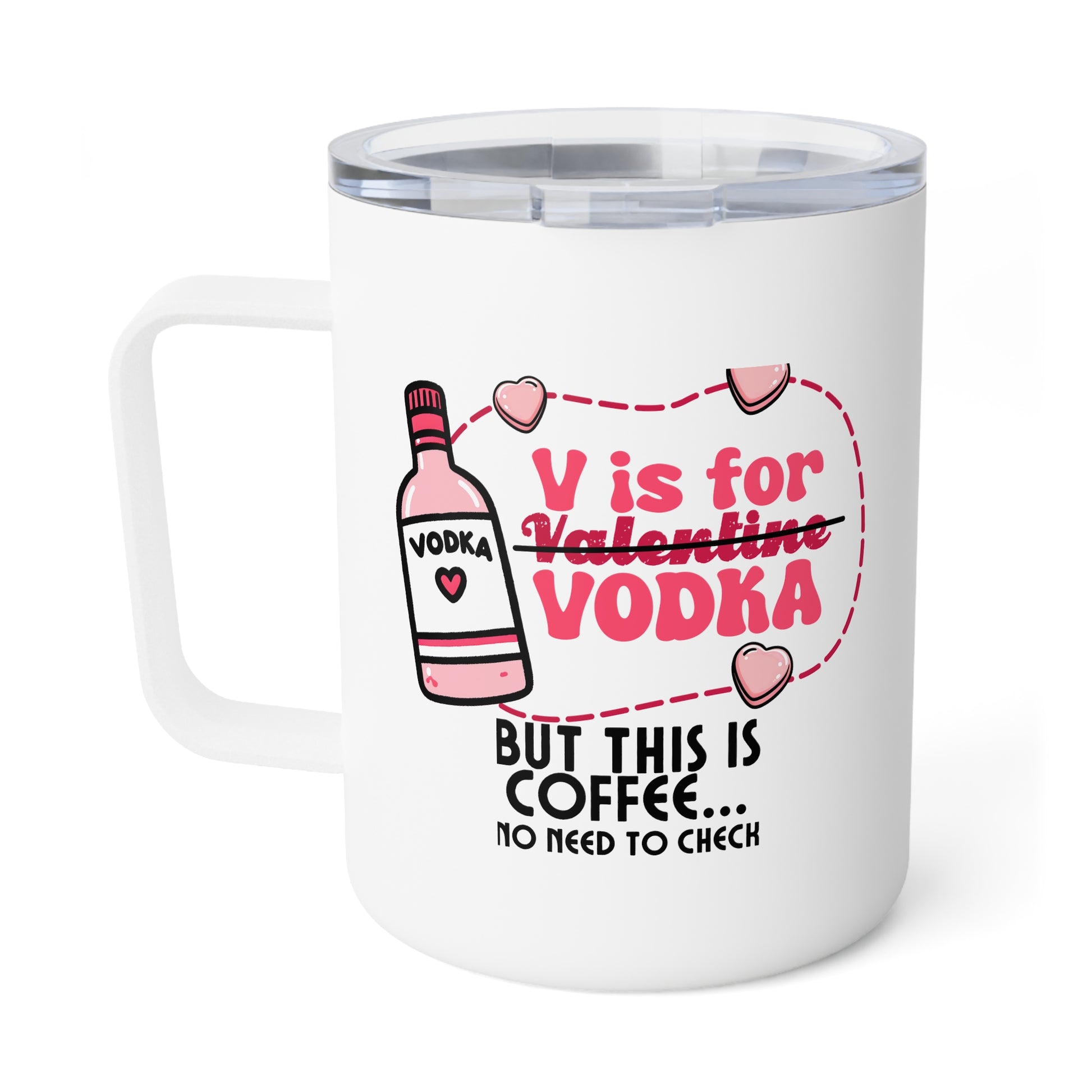 A custom insulated travel beverage mug for Valentine month featuring the quote 'V is for Valentine' with the word Valentine crossed out and Vodka written instead. Then it states 'but this is coffee, no need to check'. Great humor for those who are not into the romantic version of Valentine's Day but want to honor the holiday anyway. Perfect for coffee lovers with a sense of humor, it can be used at the office or any social event during the Valentine month.