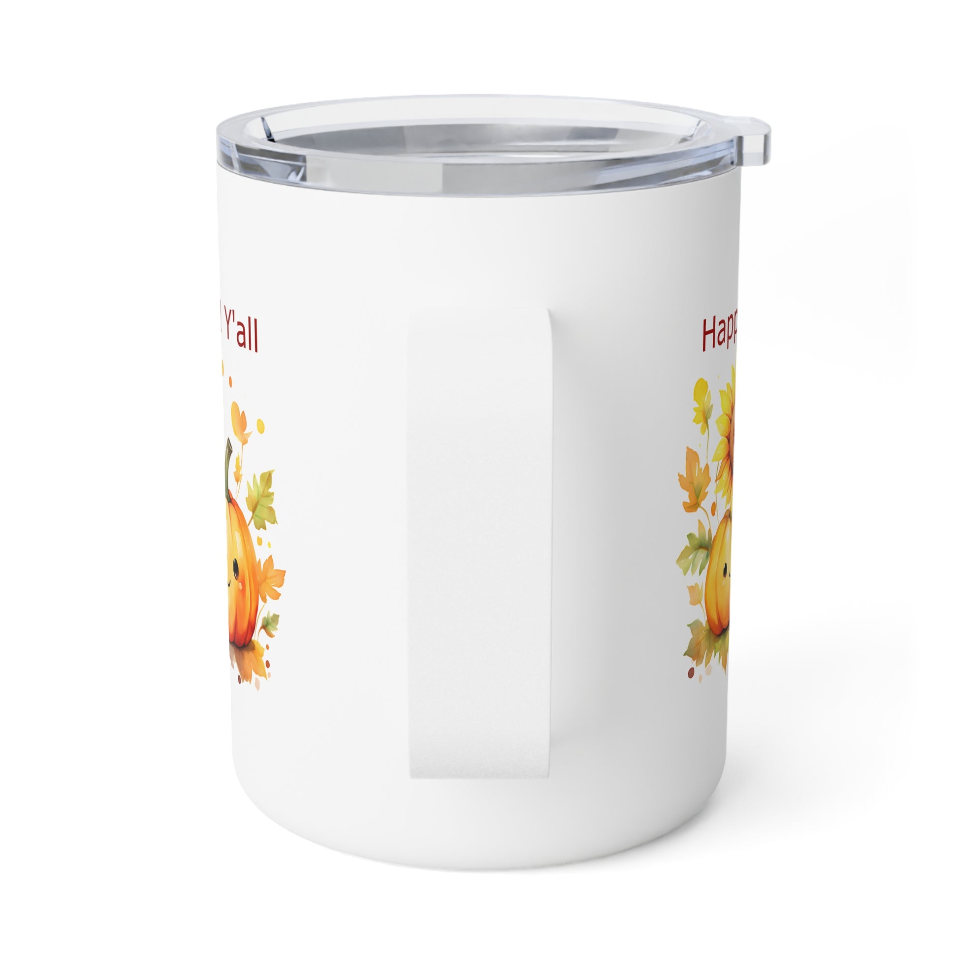 This insulated mug is perfect for people who love the autumn season. It features 'Happy Fall Y'all' with smiling pumpkins. A great fun graphic in celebration of southern charm and the fall season. It is a great addition to your coffee mug collection, especially for those who love the autumn season.