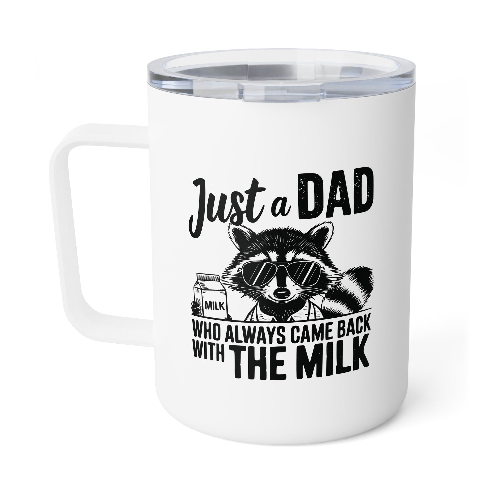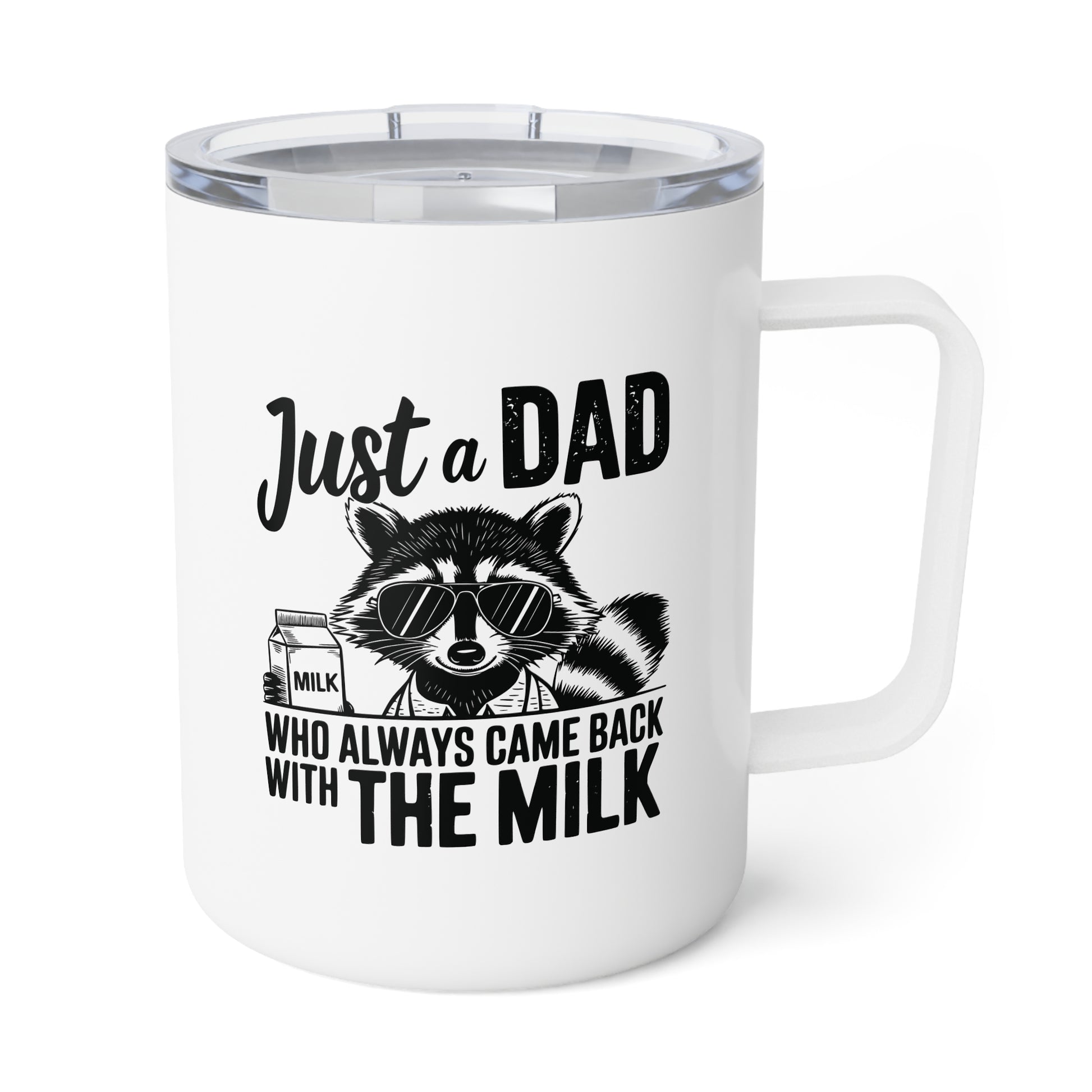 A hilarious insulated mug for dad with the funny statement 'Just a Dad who always came back with the milk' featuring a cool raccoon in aviator sunglasses holding a carton of milk. Ideal for Father's Day, birthdays, or any gift giving occasion for dads.
