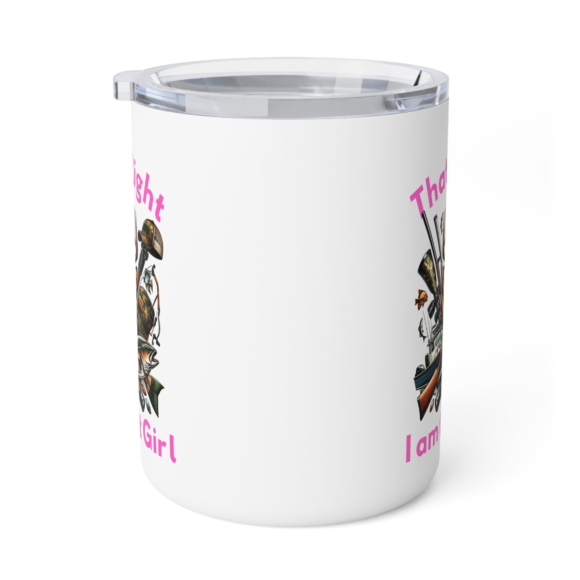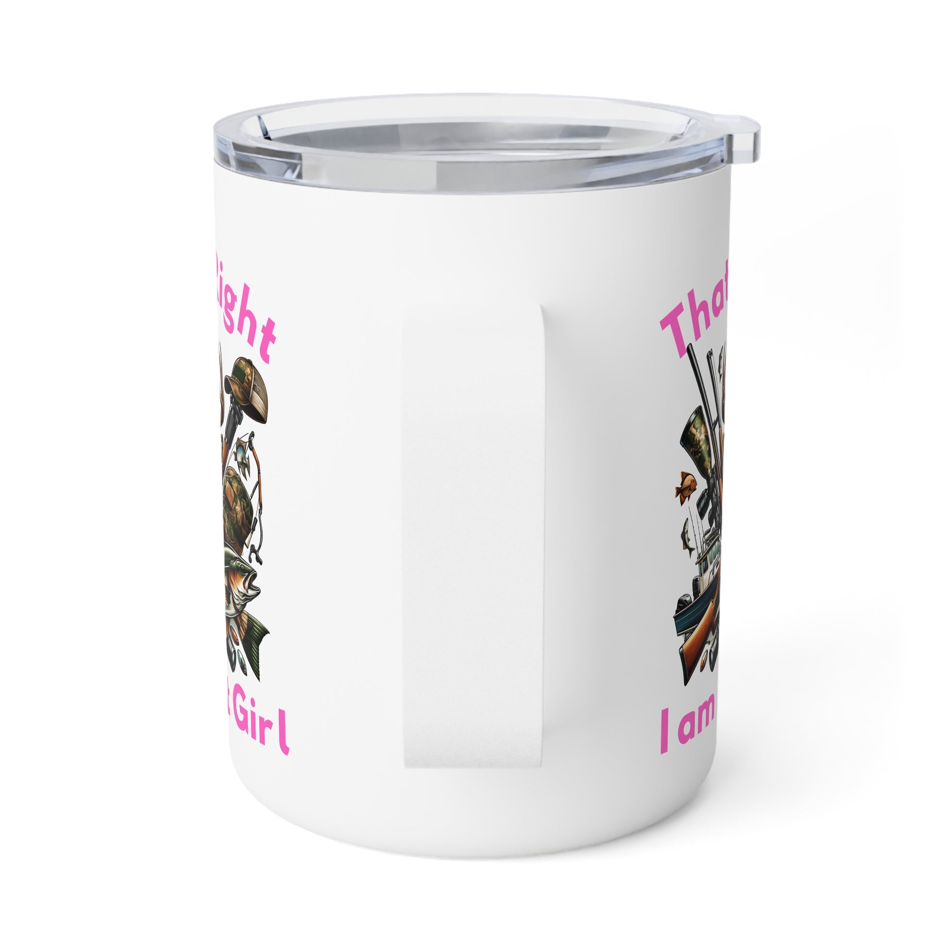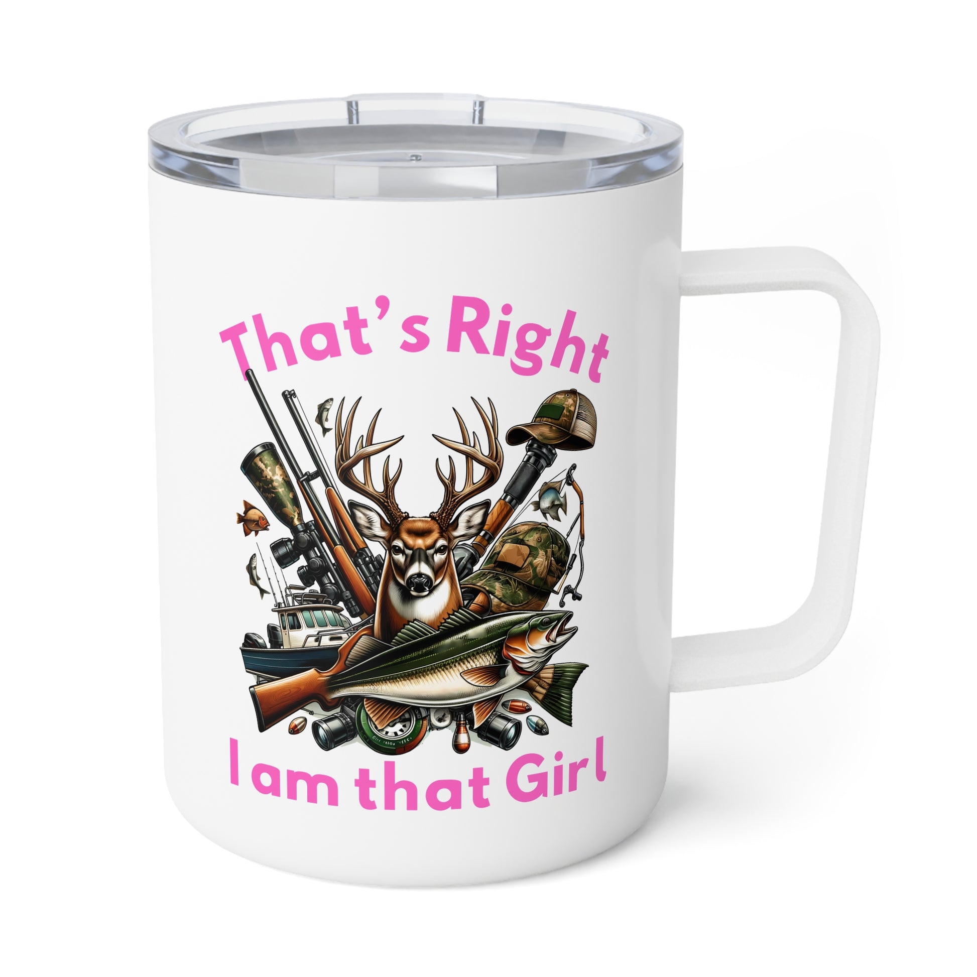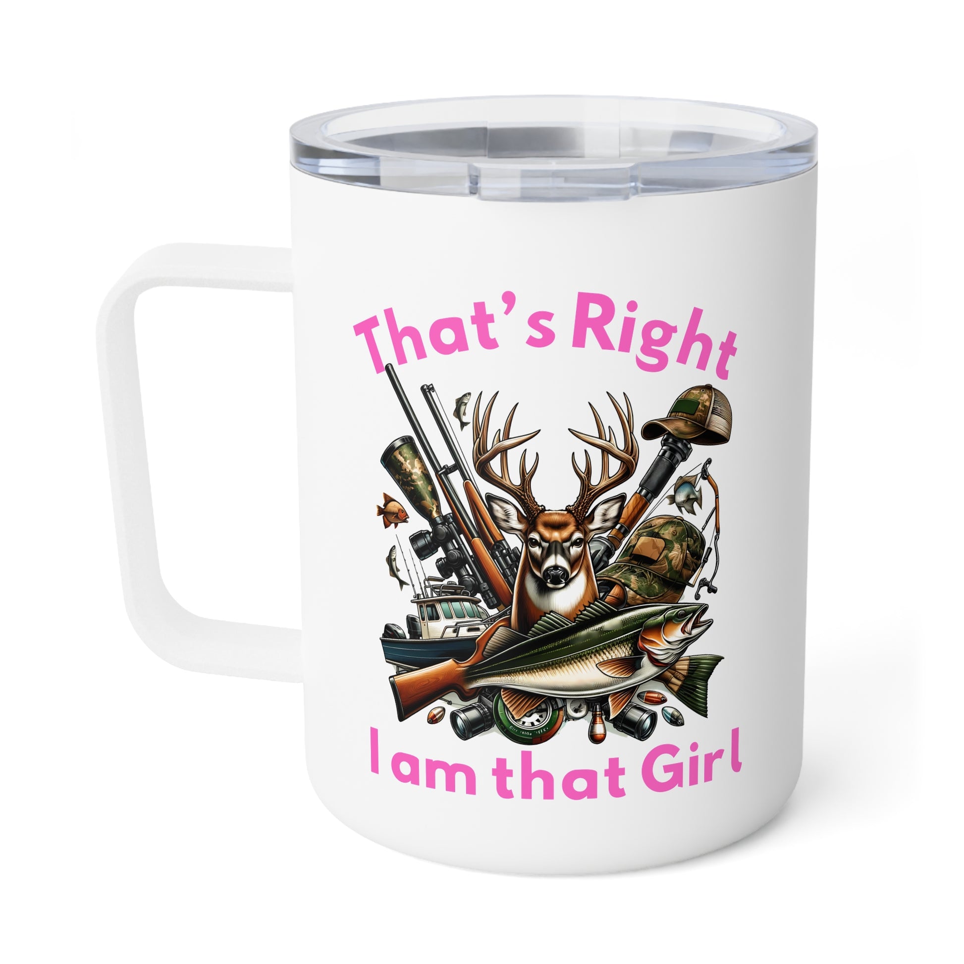 A custom insulated travel beverage mug for the female hunter and fisherman in your life. Featuring the quote 'I am that Girl' with a collection of hunting and fishing items, is ideal for outdoor enthusiasts. Great for Mother's Day, Christmas, birthdays, or just because gifts.