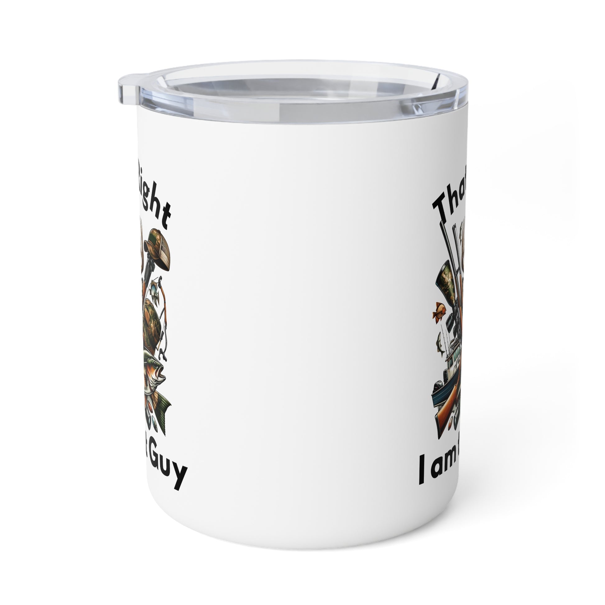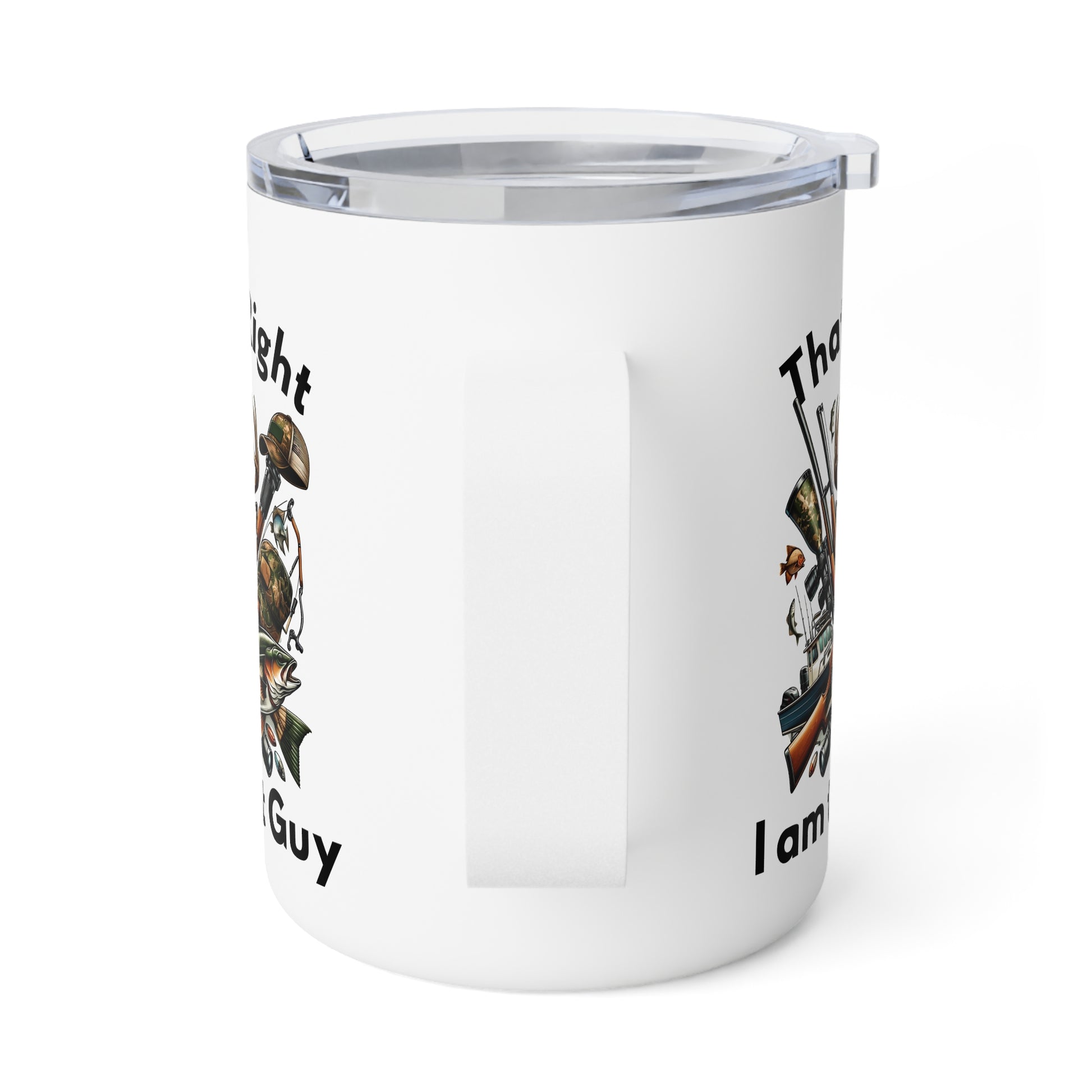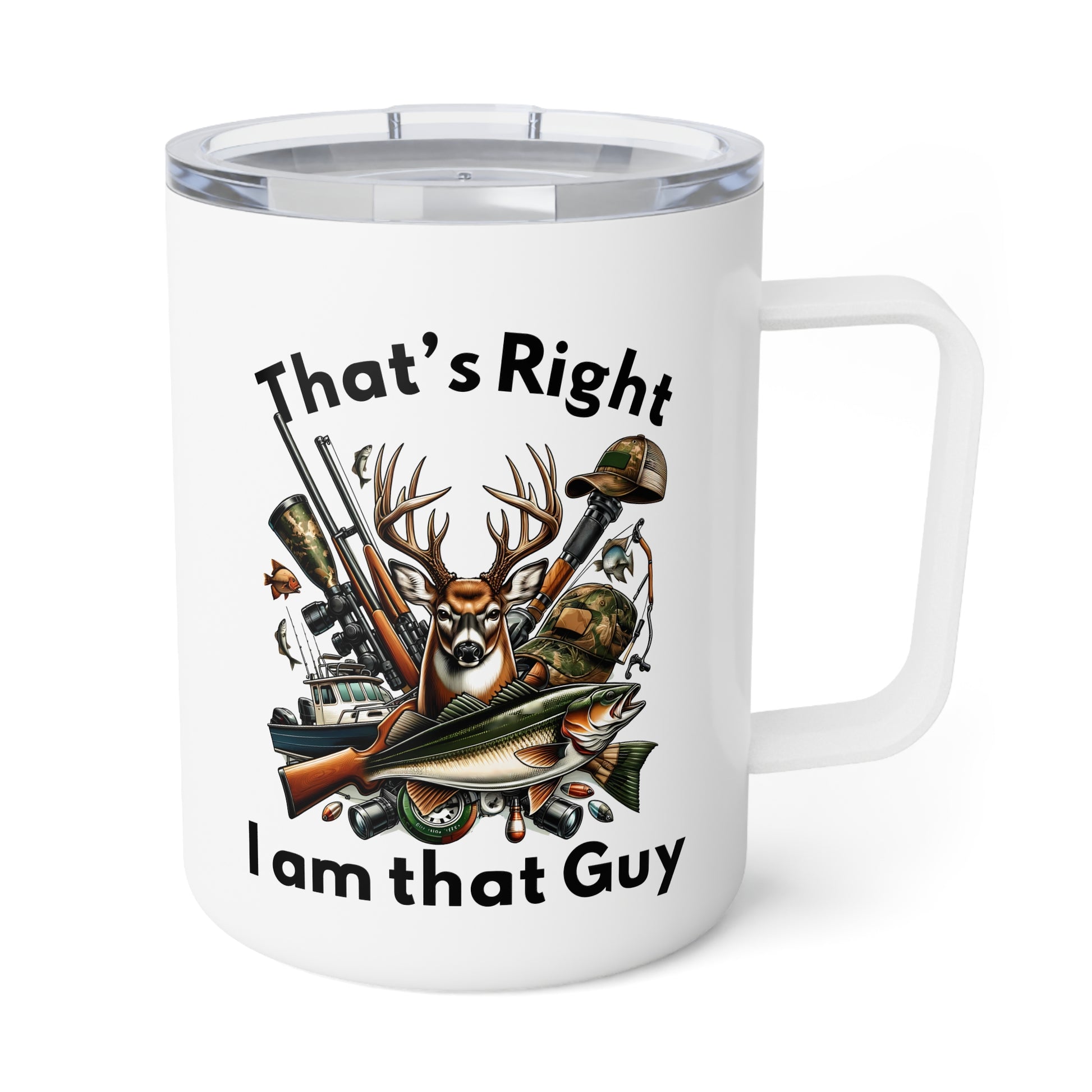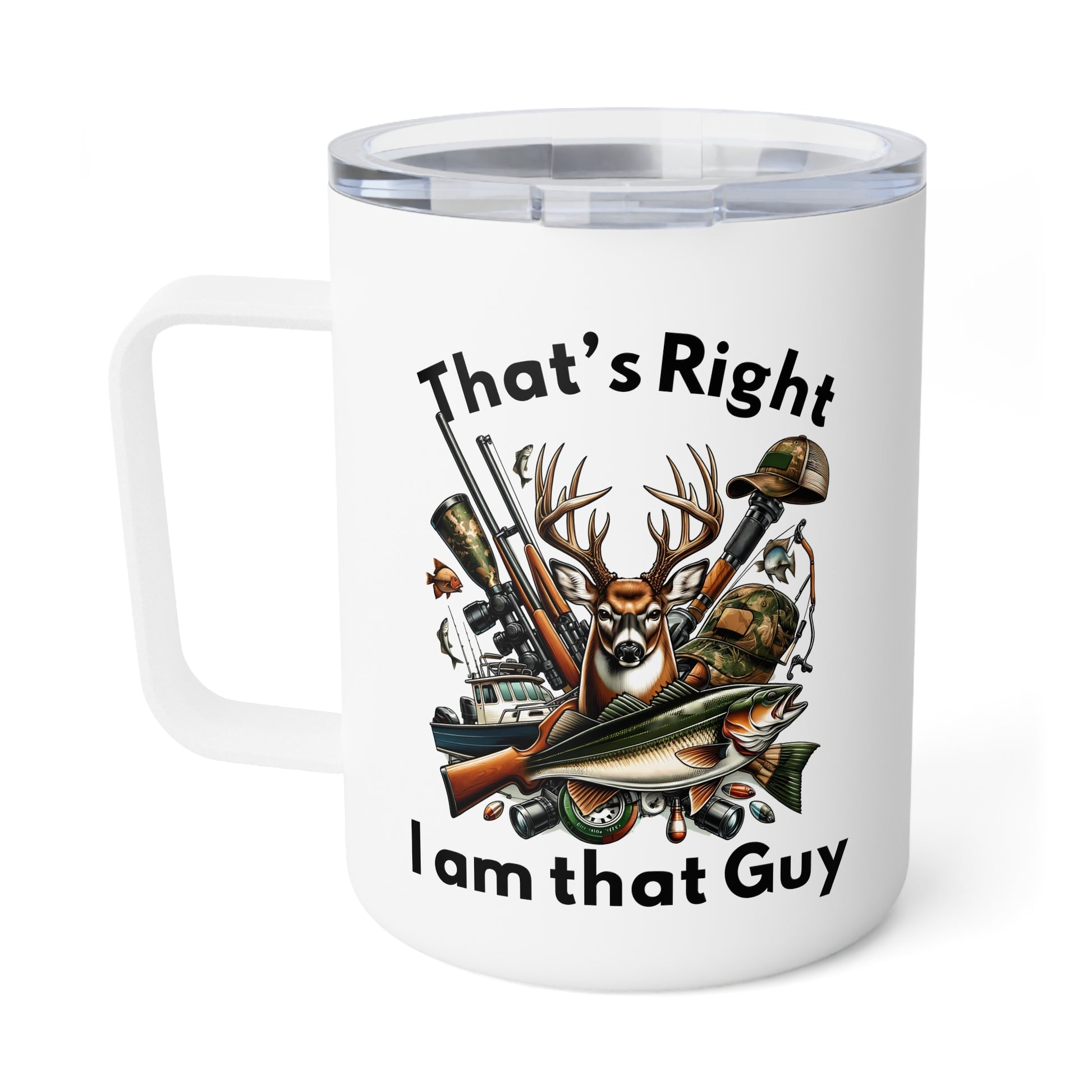 A custom insulated travel beverage mug for the male hunter and fisherman in your life. Featuring the quote 'I am that Guy' with a collection of hunting and fishing items, is ideal for outdoor enthusiasts. Great for Father's Day, Christmas, birthdays, or just because gifts.