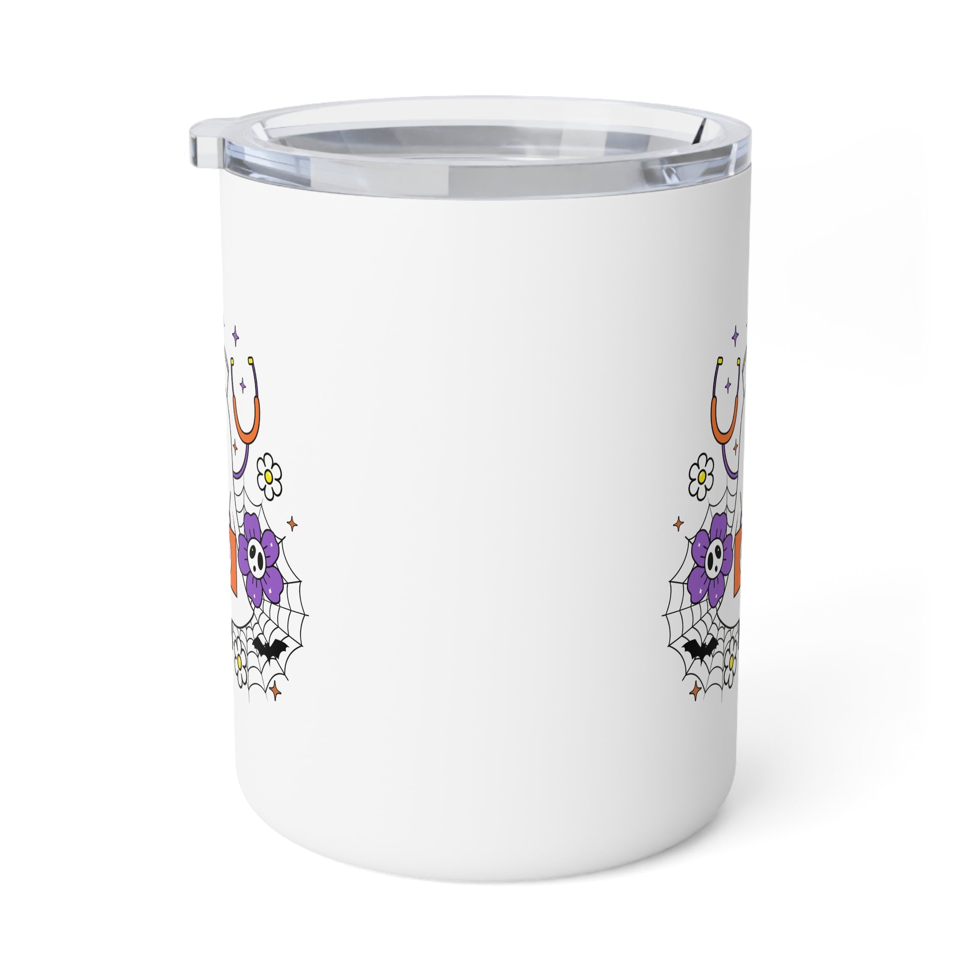 This insulated mug features a very simple Halloween themed pattern. An adorable ghost with medical bag and some not so scary bats and faced flowers. It has a fun and playful vibe with its vibrant graphics and it is great for all medical professionals.