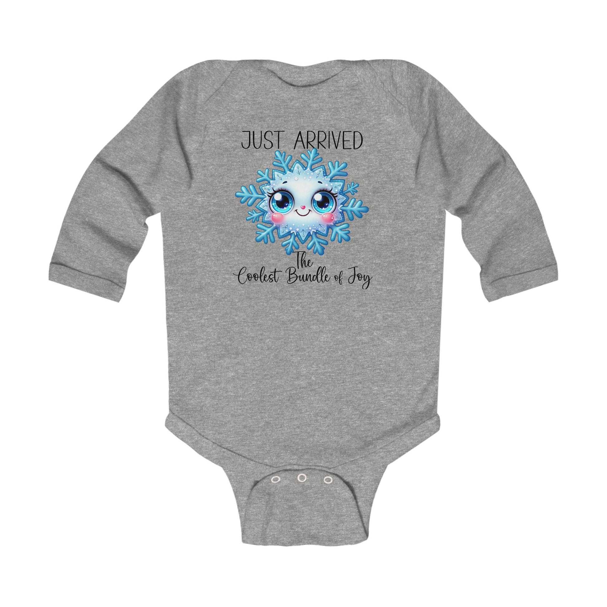 This adorable Bodysuit is perfect for welcoming a new arrival, with the quote "Just Arrived" and "The Coolest Bundle of Joy" featuring a gender neutral snowflake design. It is ideal for parents who enjoy the surprise of the pregnancy journey and want a cute outfit for their little one upon arrival. The Bodysuit can also make a great gift for baby showers, gender reveal parties, and winter-themed celebrations.