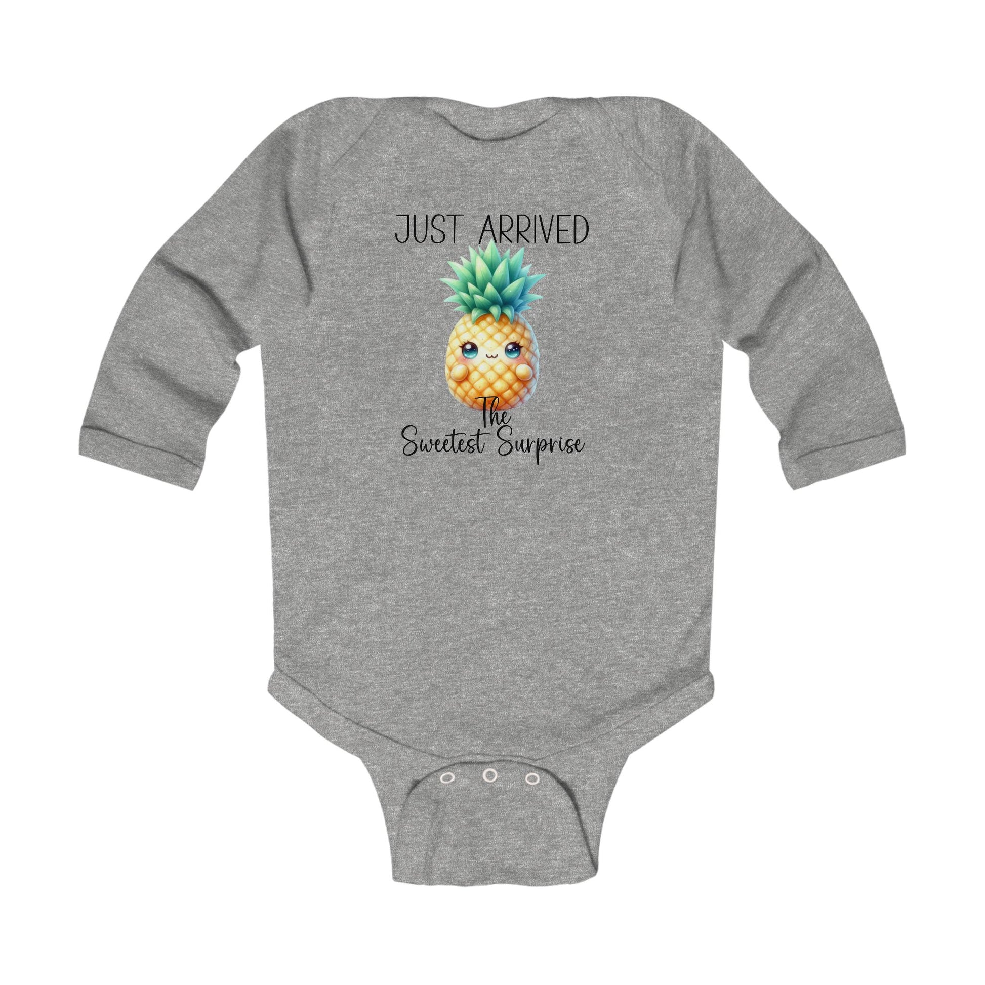 This adorable Bodysuit is perfect for welcoming a new arrival, with the quote "Just Arrived" and "Sweetest Surprise" featuring a gender neutral pineapple design. It is ideal for parents who enjoy the surprise of the pregnancy journey and want a cute outfit for their little one upon arrival. The Bodysuit can also make a great gift for baby showers, gender reveal parties, and summer-themed celebrations.