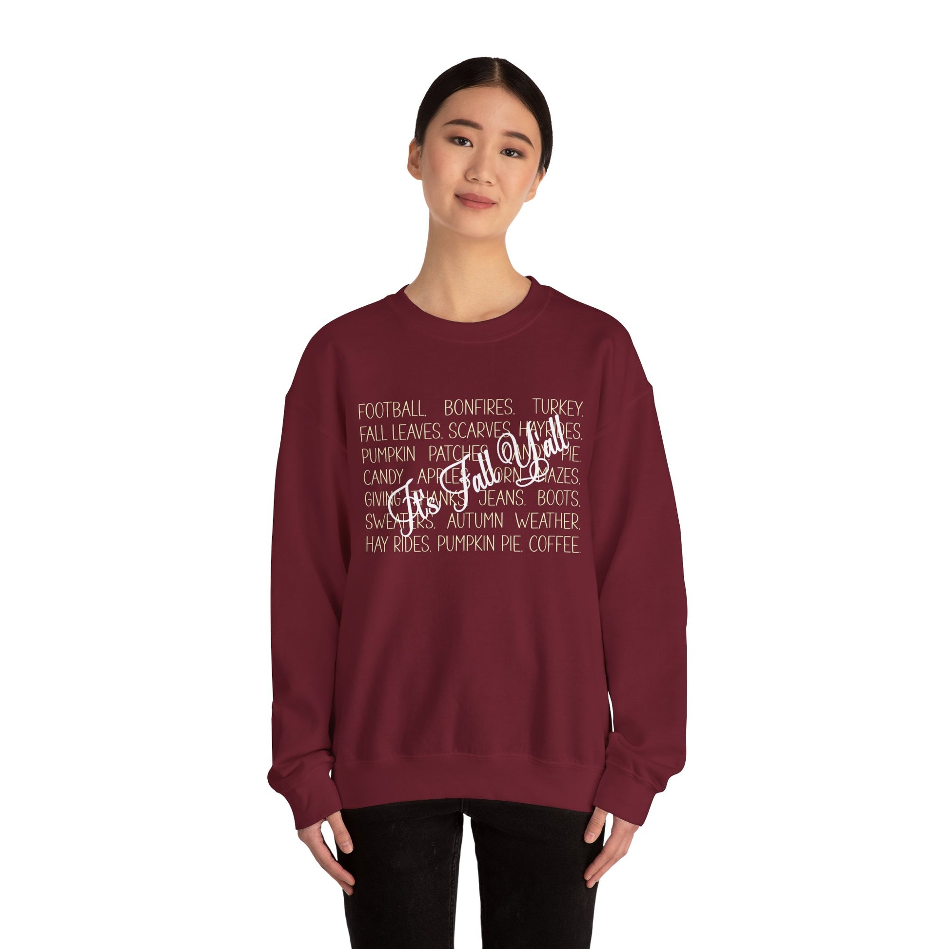 The background word graphic for this cozy sweatshirt is a list of favorite fall things. The list includes; football, bonfires, turkey, fall leaves, scarves, hayrides, pumpkin patches, candy, pie, candy apples, corn mazes, giving thanks, jeans, boots, sweaters, autumn weather, hay rides, pumpkin pie, & coffee. Over the top of the word graphic are the words 'It's Fall Y'all' It is a fun, warm, cozy item to wear at bonefires, football games or even to curl up with a good book.