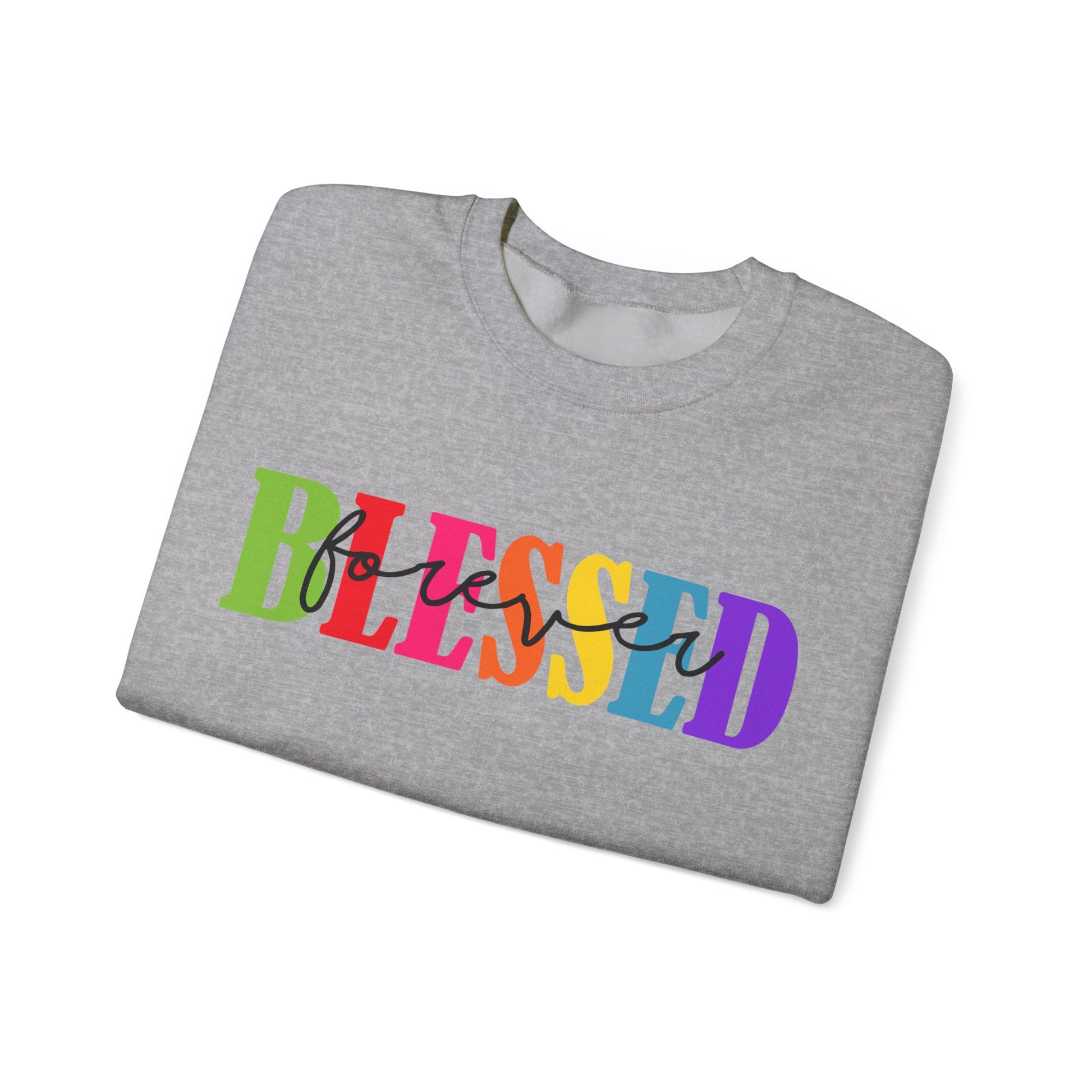 A unisex heavy blend crewneck sweatshirt with the simple statement 'Blessed Forever' in spring/summer coloring font. This sweatshirt offers comfort and style, ideal for casual outings, family gatherings, or relaxed days at home. The uplifting 'BLESSED' design captures a positive vibe, making it a great choice for those who cherish uplifting messages in their attire. Ideal for gifting during celebrations like birthdays or holidays, resonating with anyone who values comfort and a cheerful outlook. Suitable for adults.