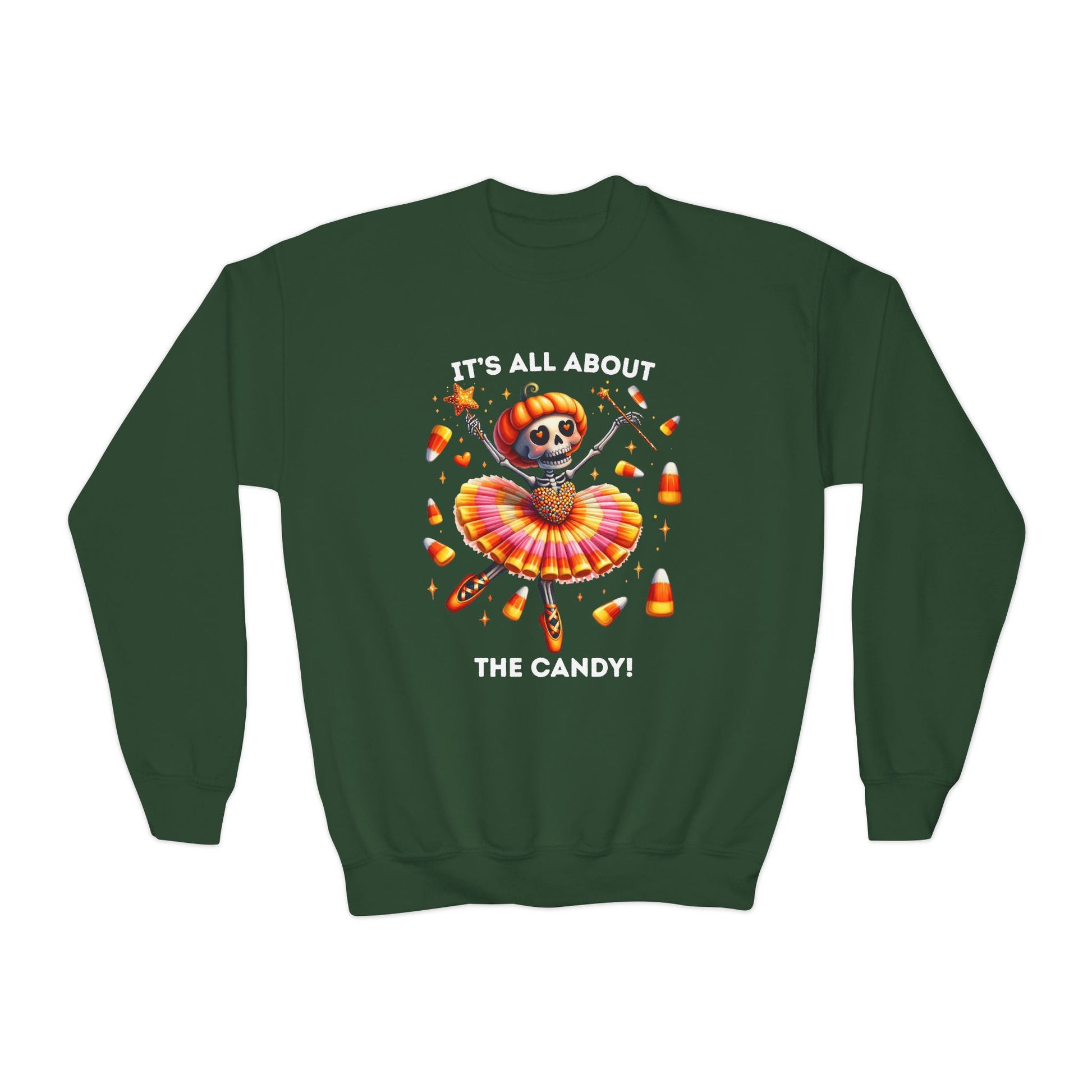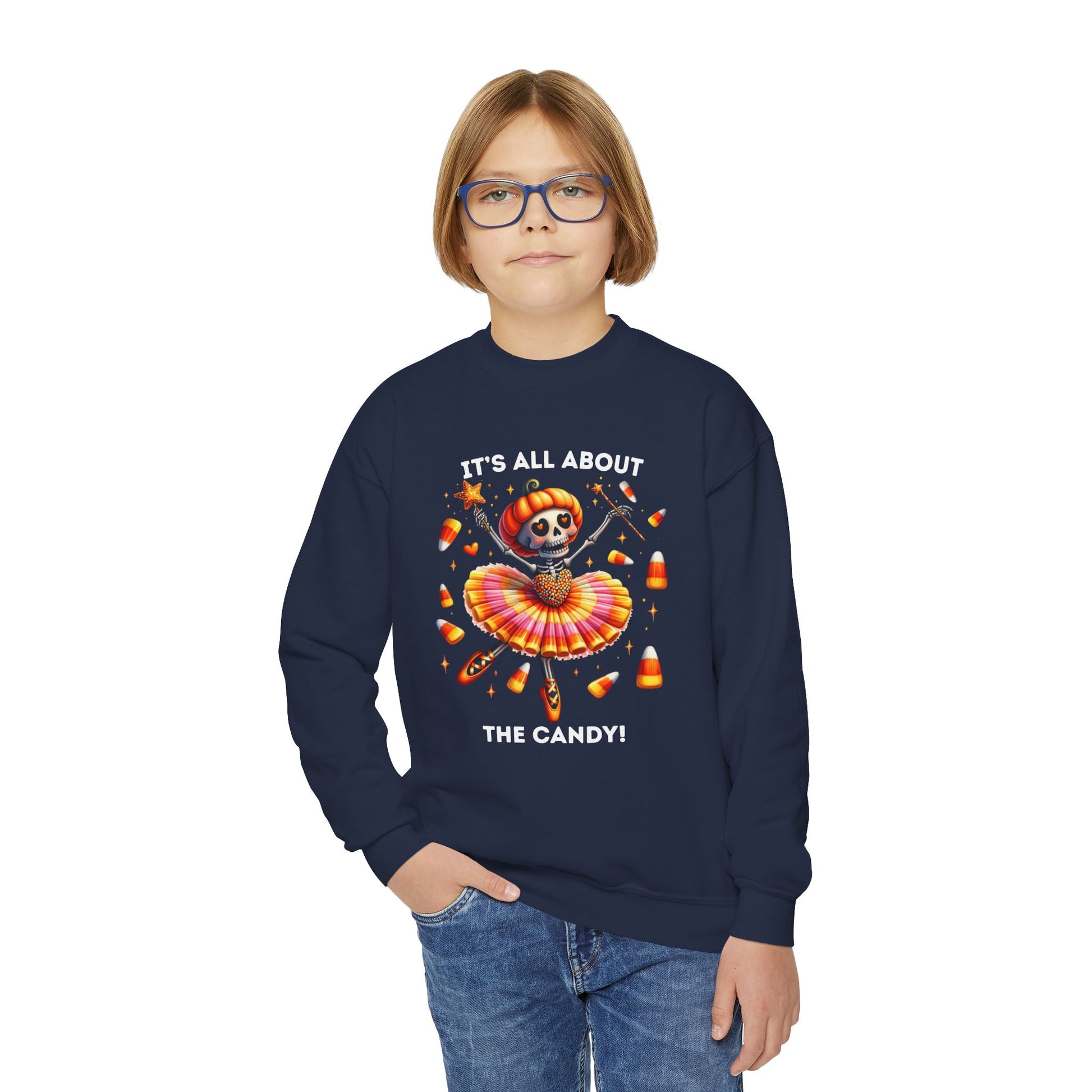 A fun and playful youth sweatshirt perfect for Halloween, featuring a ballet dancing skeleton & floating candy with the quote 'It's all about the candy'. Ideal for youths looking to embrace the Halloween spirit, this sweatshirt is suitable for school or hanging out with friends. Perfect for Halloween parties, trick-or-treating, and school events. Target audience: children
