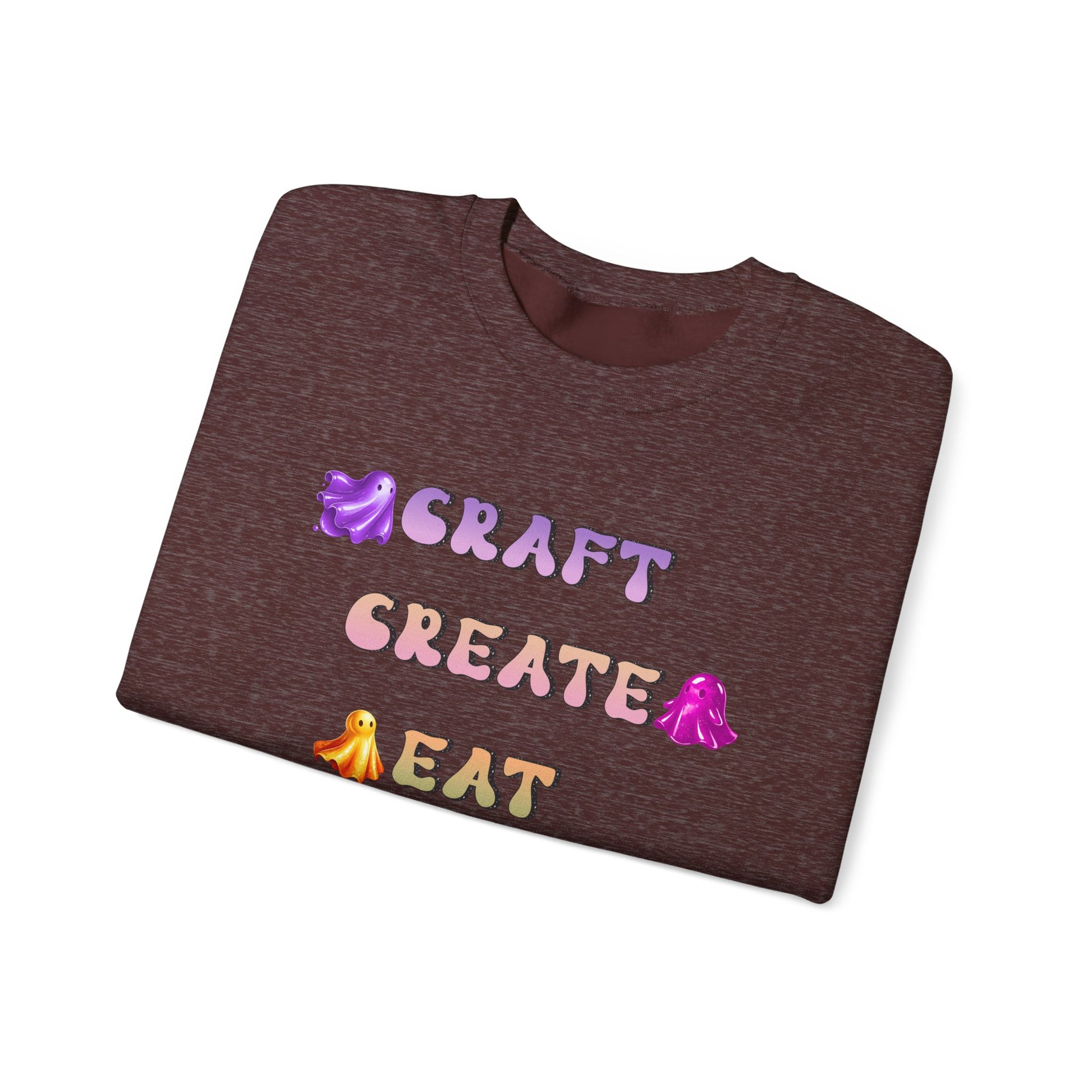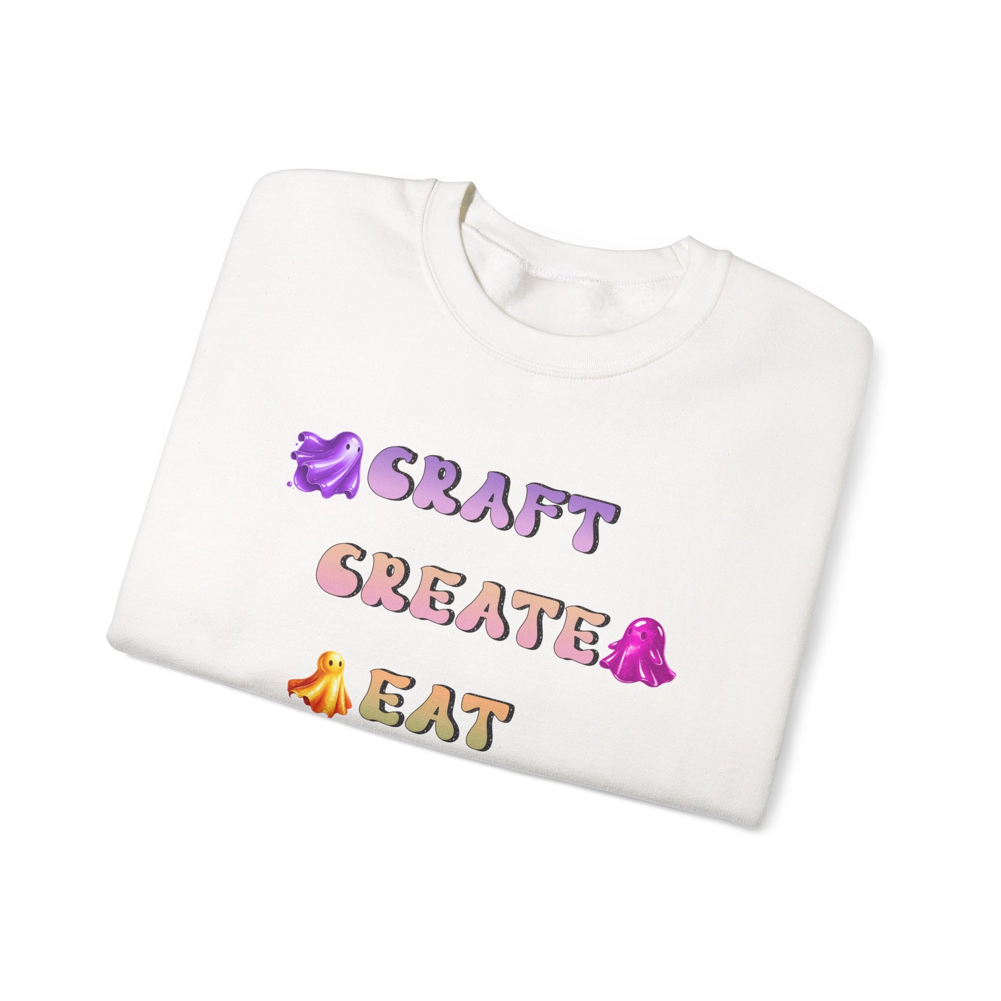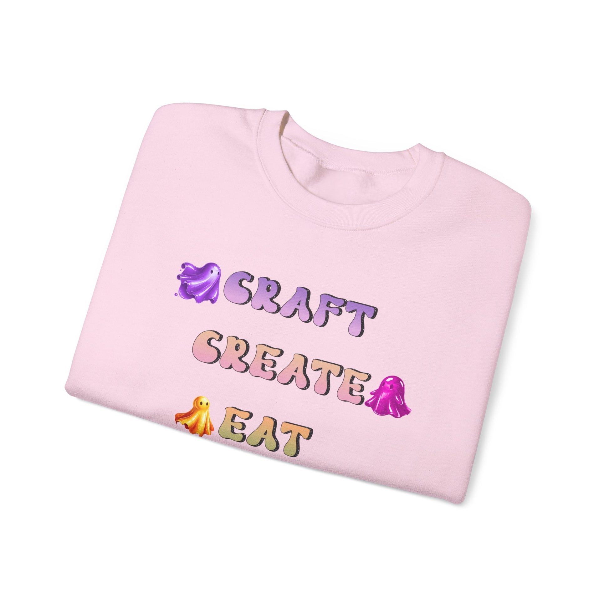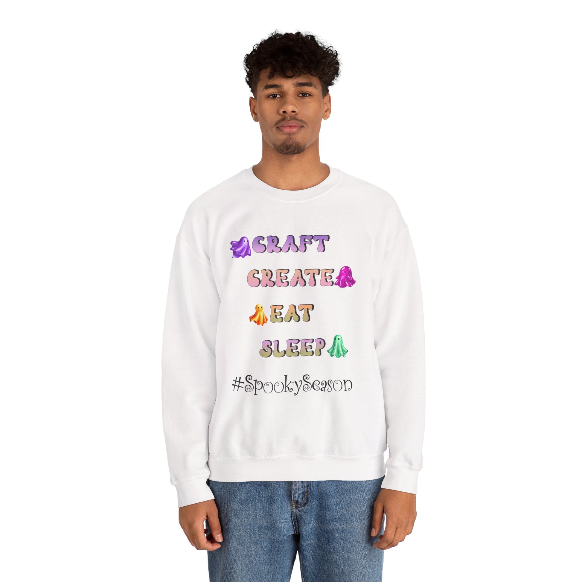 Introducing the perfect companion for cooler days, perfect for the morning of bus duty in the fall. This crewneck sweatshirt with the quote " Craft Create Eat Sleep #spookyseason" is a must have for the Halloween DIYer. With colorful ghosts hosting the quotes. Very playful and light hearted Halloween theme is perfect. This sweatshirt exudes a fun and playful vibe with its vibrant graphics, making it a fantastic addition to your wardrobe. Whether you're deocrating the house, relaxing in the house or out with friends, this provides a cozy and relaxed fit while ensuring you look effortlessly stylish.