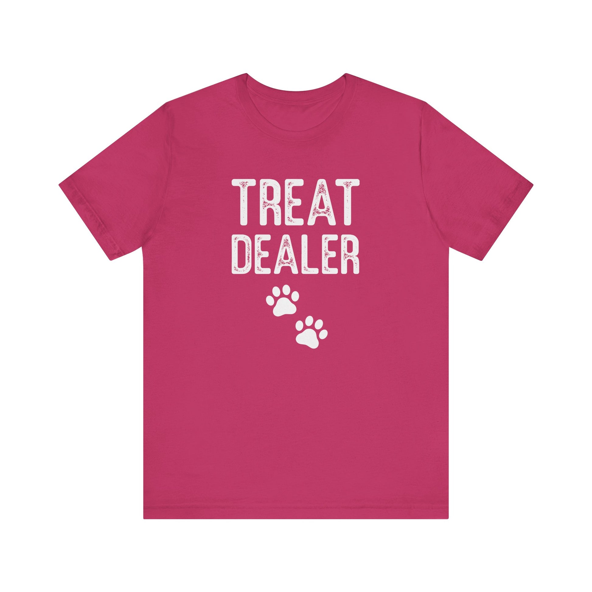 An adorable t-shirt for dog lovers, featuring a fun saying "Treat Dealer" in white font. Ideal for those who love spending quality time with their dogs. This Unisex Jersey Short Sleeve Tee offers a blend of style and comfort, perfect for casual outings or semi-formal settings. Made from 100% Airlume combed and ring-spun cotton, this lightweight and breathable tee is ideal for any time of year. It is perfect for dog lovers and makes a delightful gift for birthdays, holidays, or any special occasion.