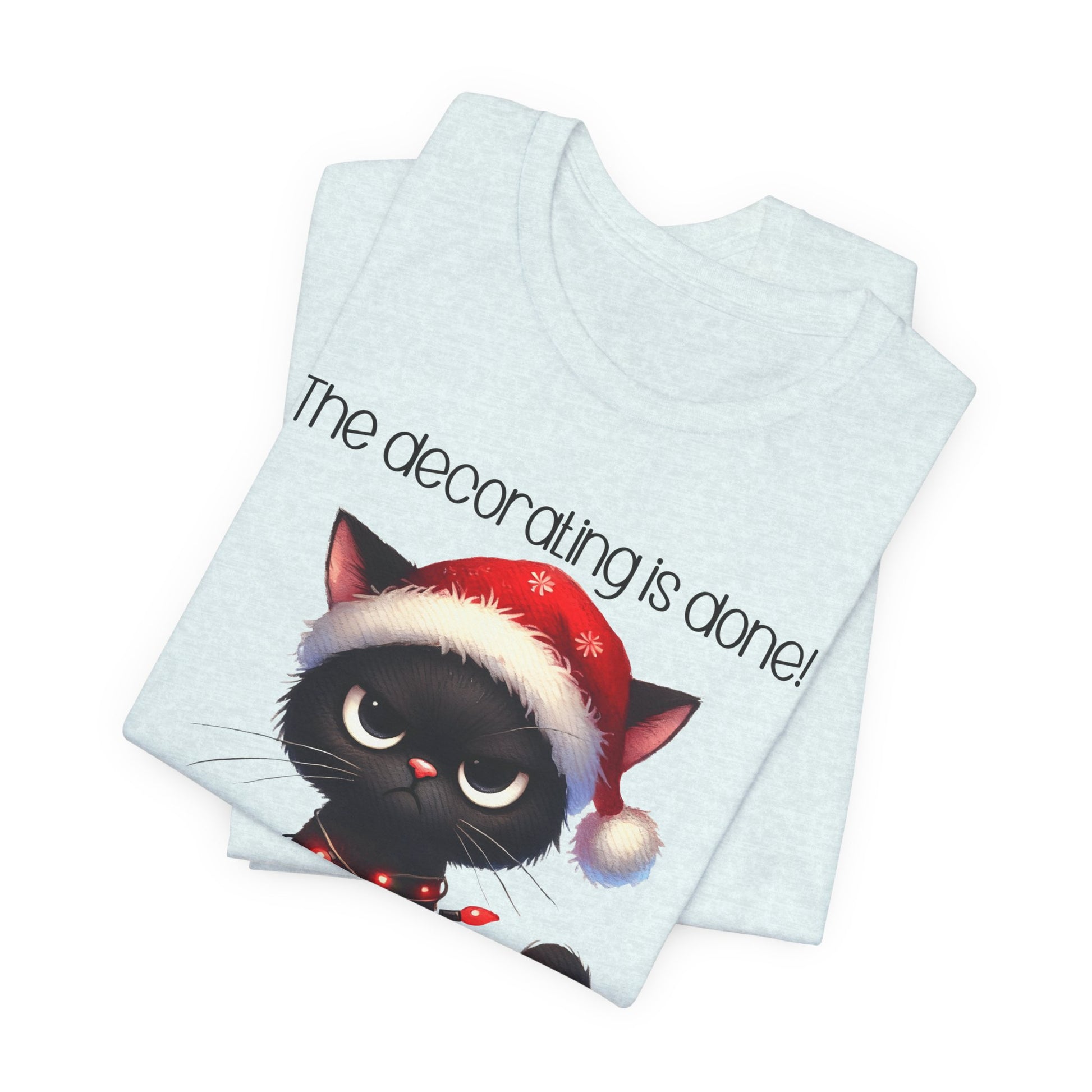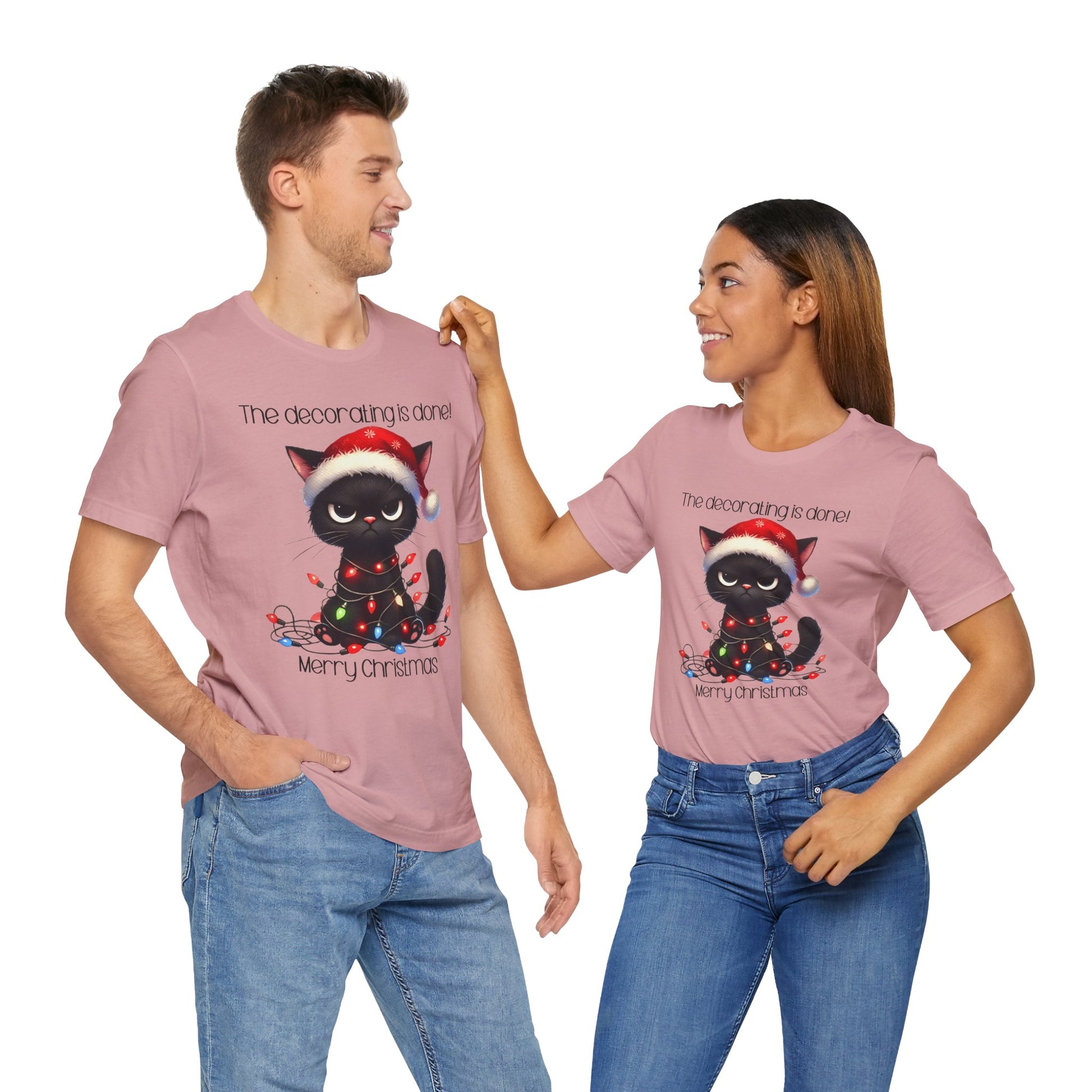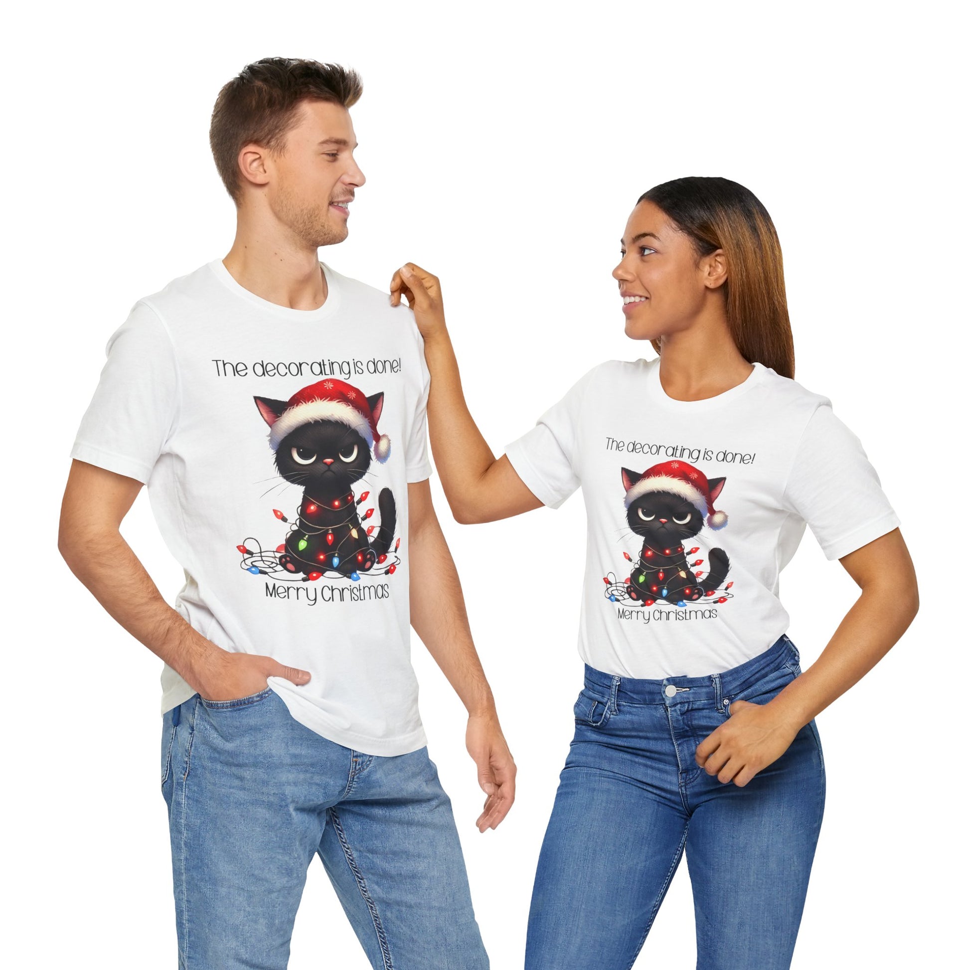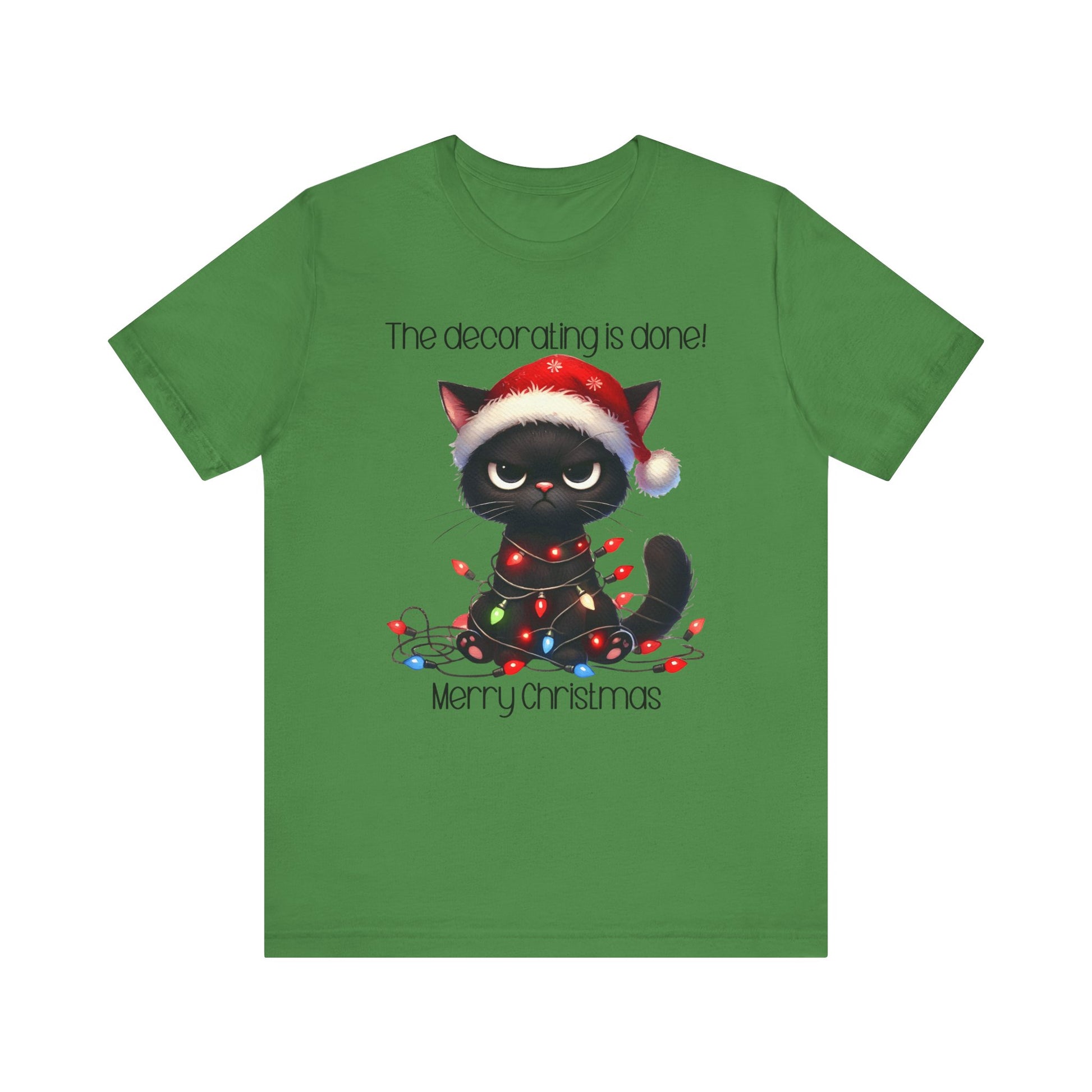 This funny tee shirt for Christmas states 'The decorating is done! Merry Christmas'. There is a black cat wrapped in Christmas lights. It is just a cute tee shirt that shows the decorating is completed by the cat being decorated. A fun Christmas shirt for all.