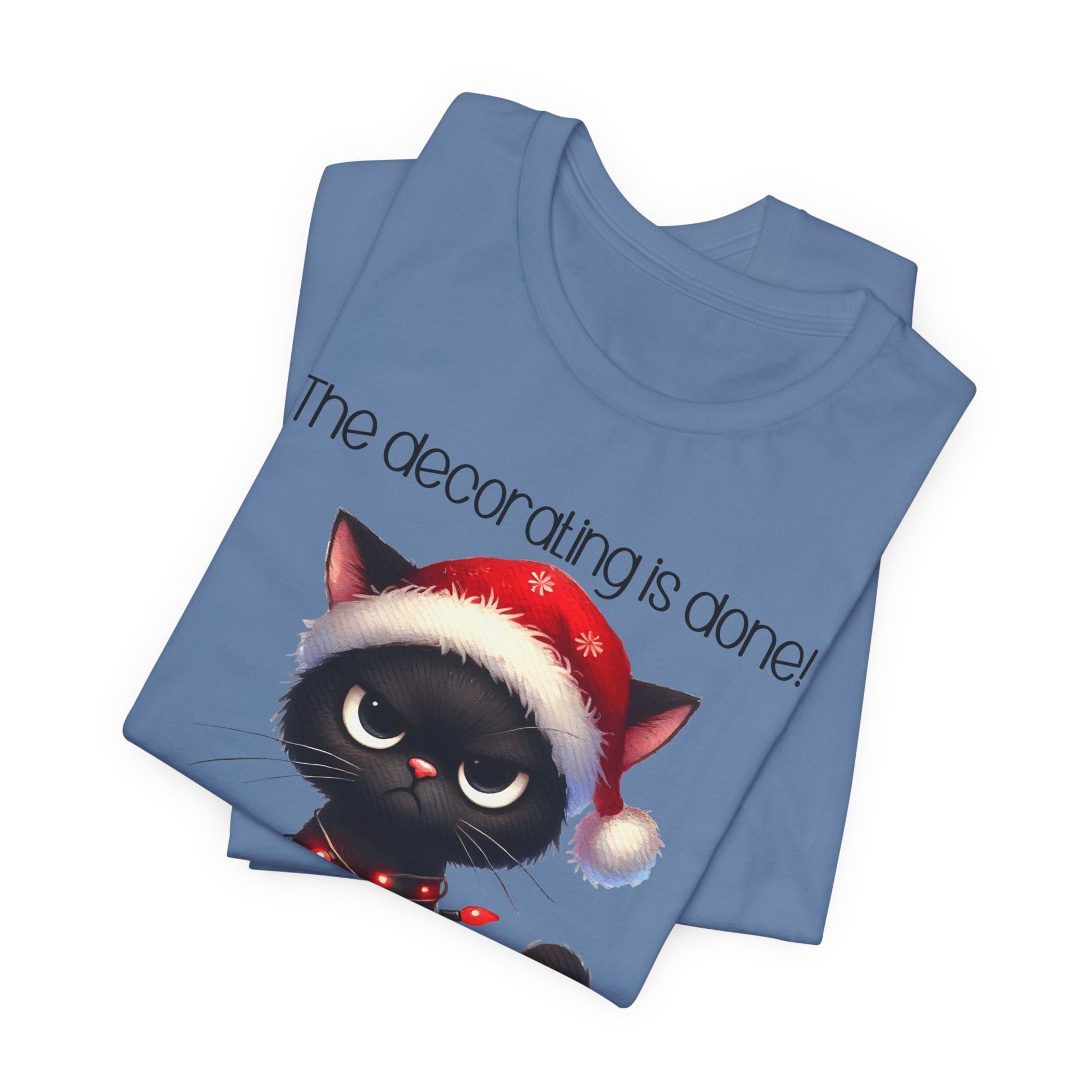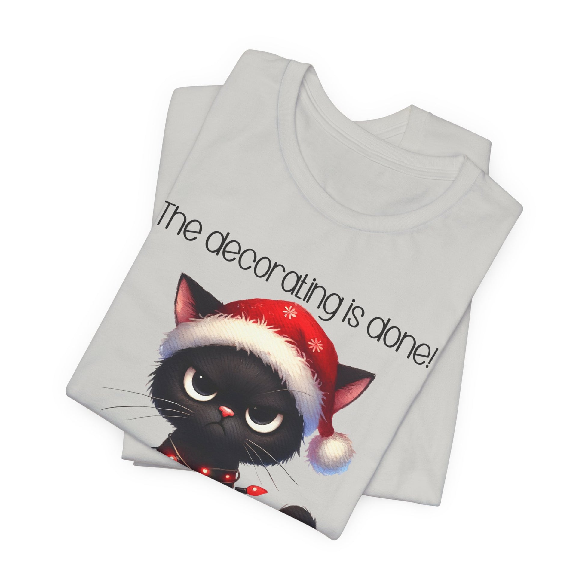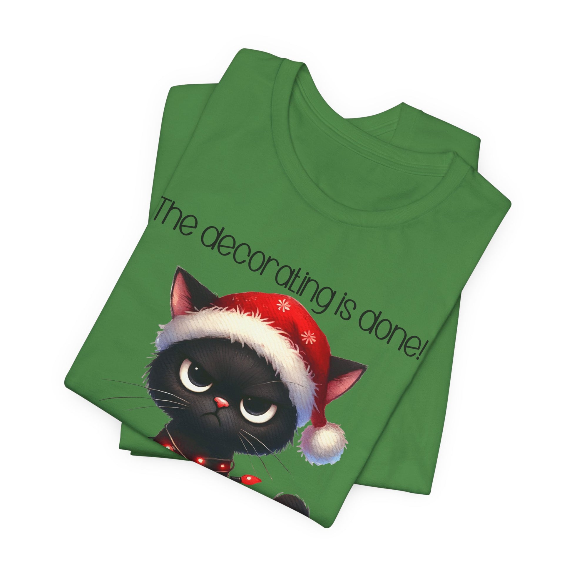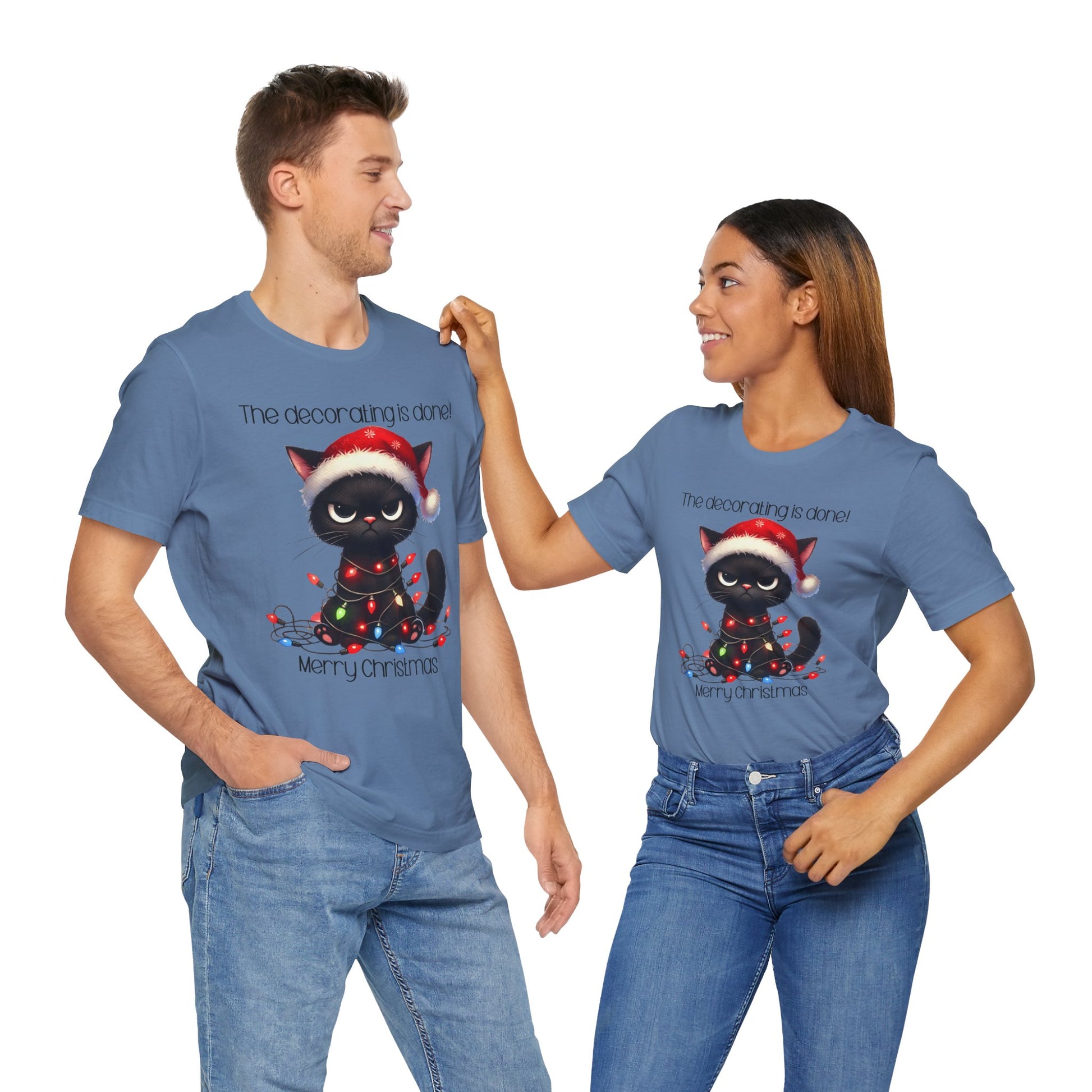 This funny tee shirt for Christmas states 'The decorating is done! Merry Christmas'. There is a black cat wrapped in Christmas lights. It is just a cute tee shirt that shows the decorating is completed by the cat being decorated. A fun Christmas shirt for all.