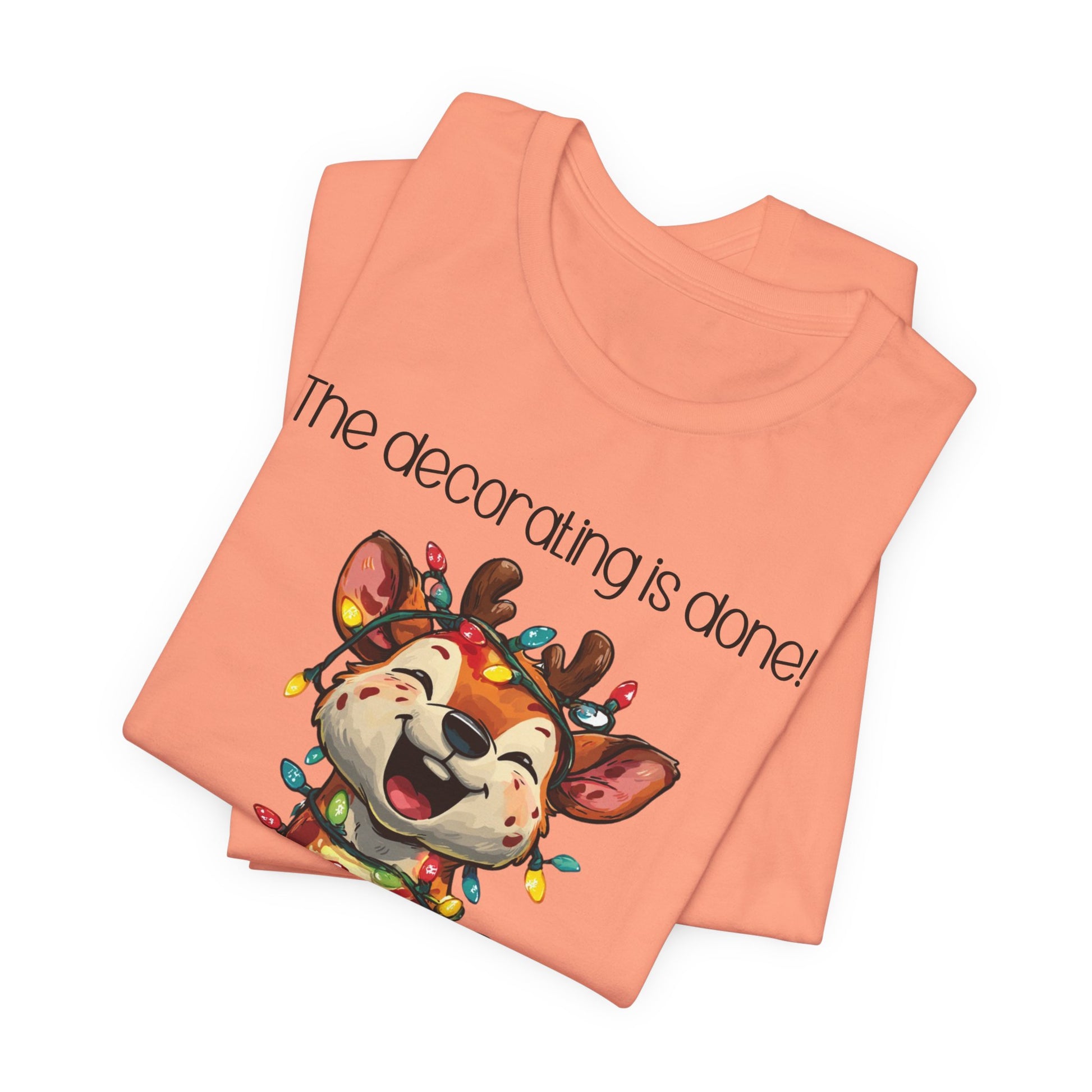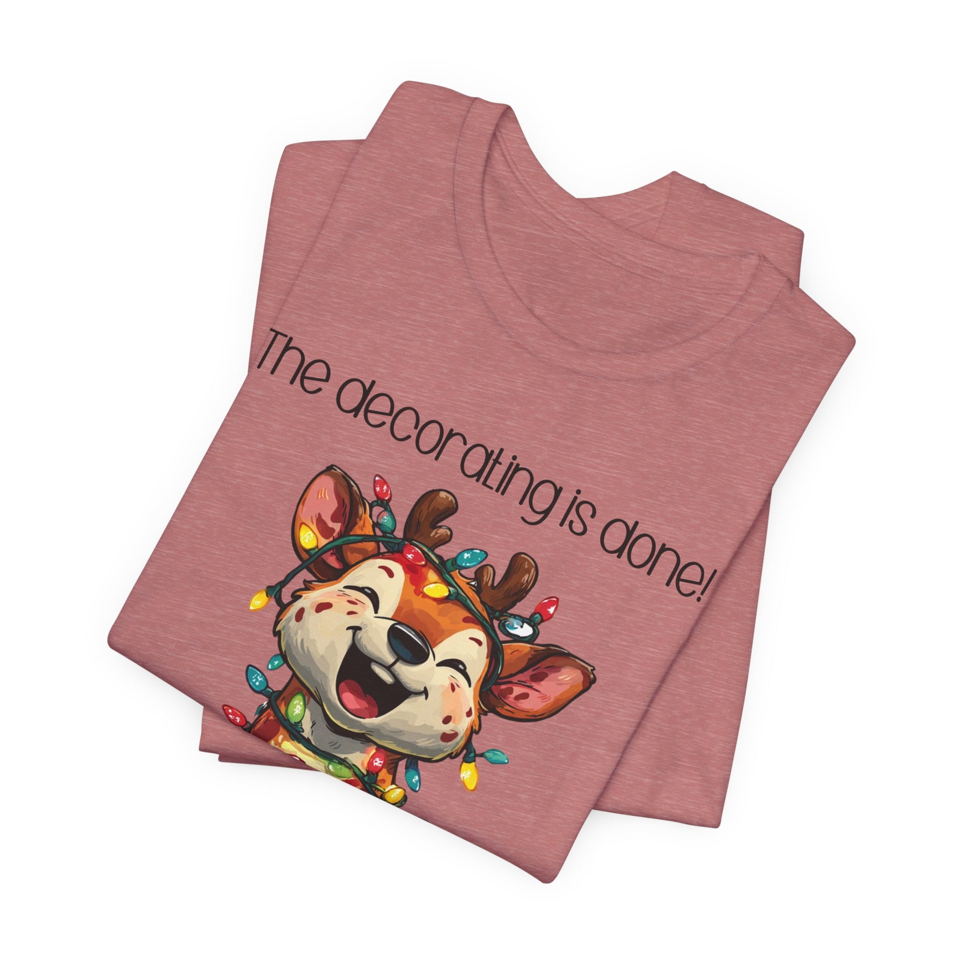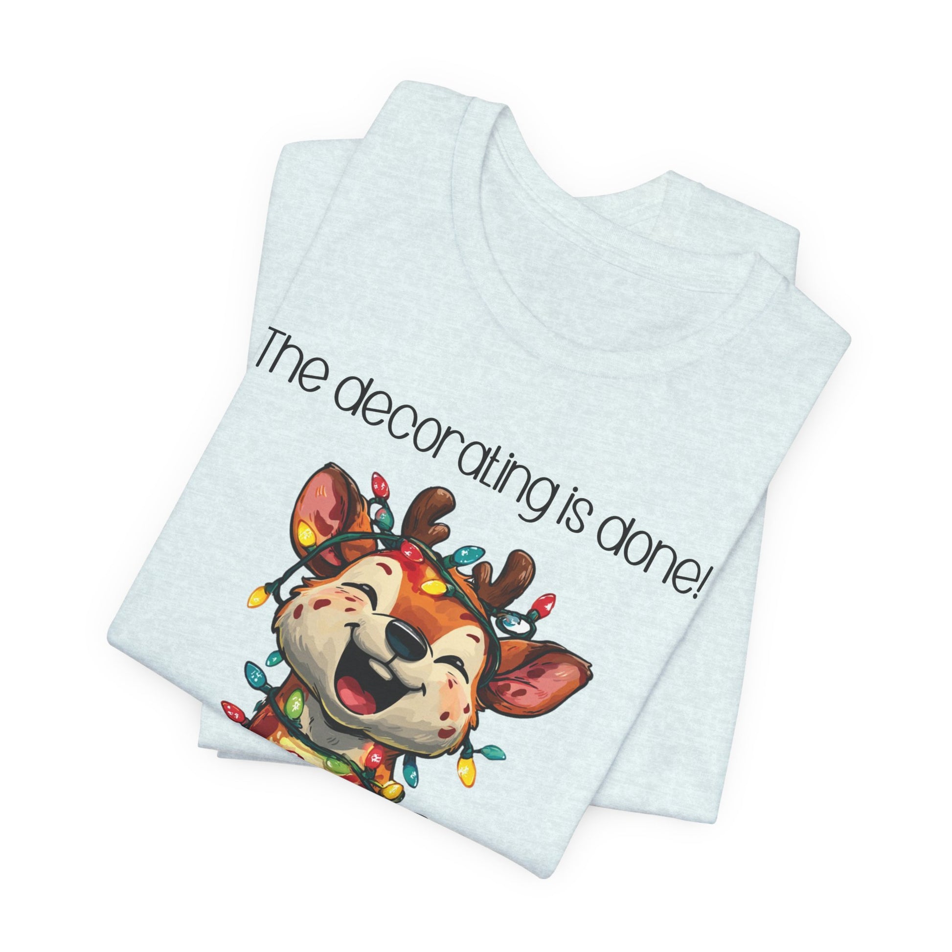 This funny tee shirt for Christmas states 'The decorating is done! Merry Christmas'. There is a laughing reindeer wrapped in Christmas lights. It is just a cute tee shirt that shows the decorating is completed by the reindeer being decorated. A fun Christmas shirt for all.